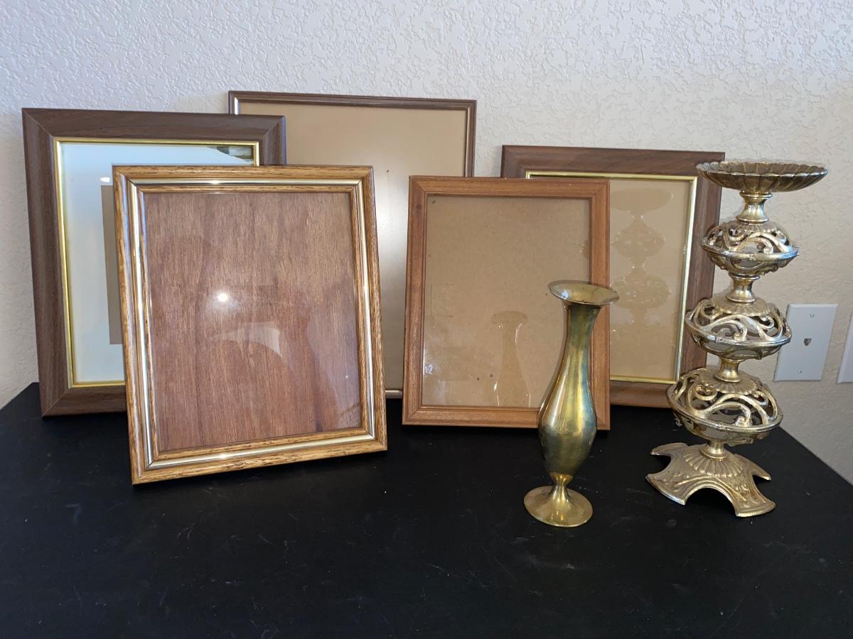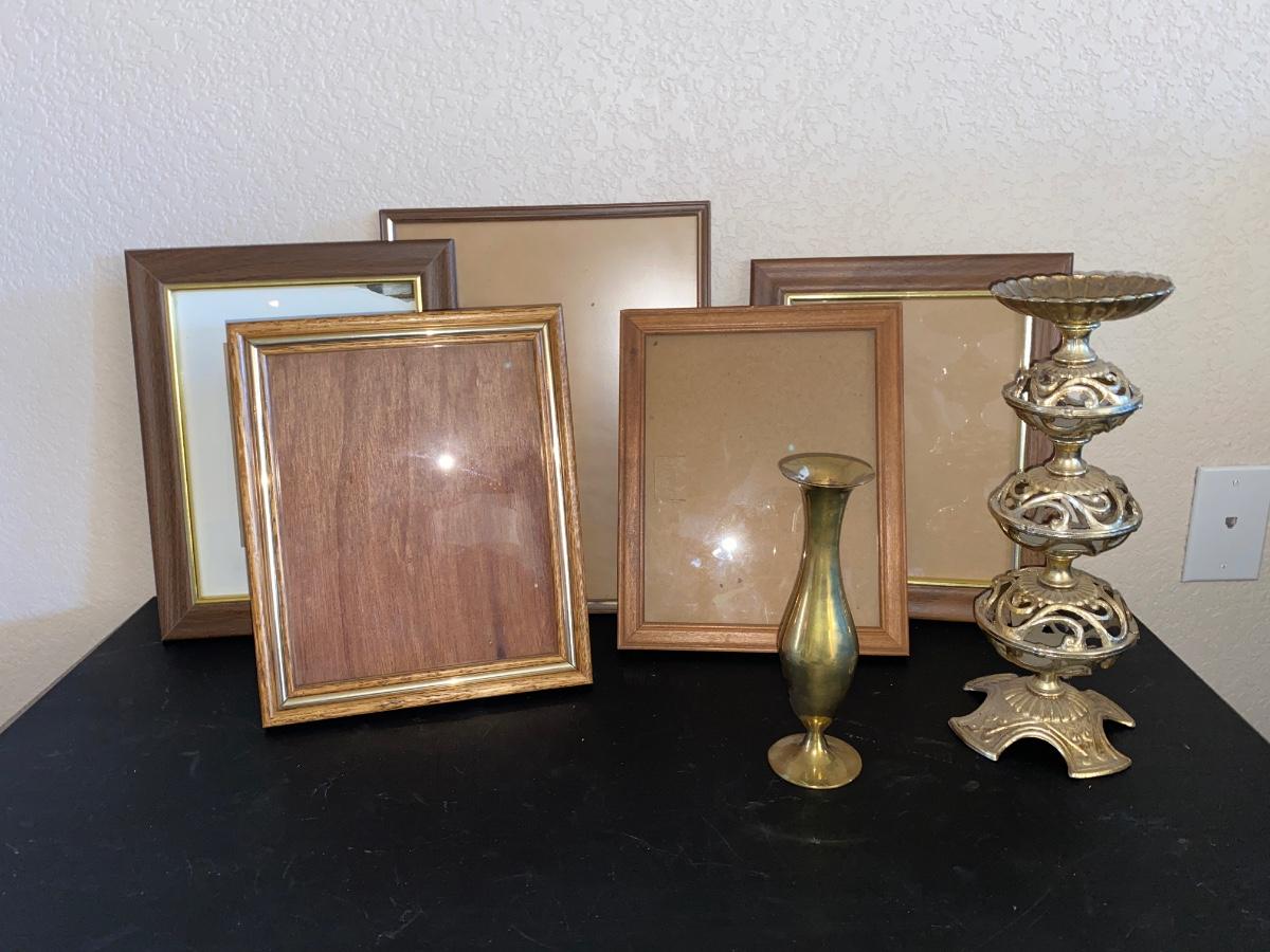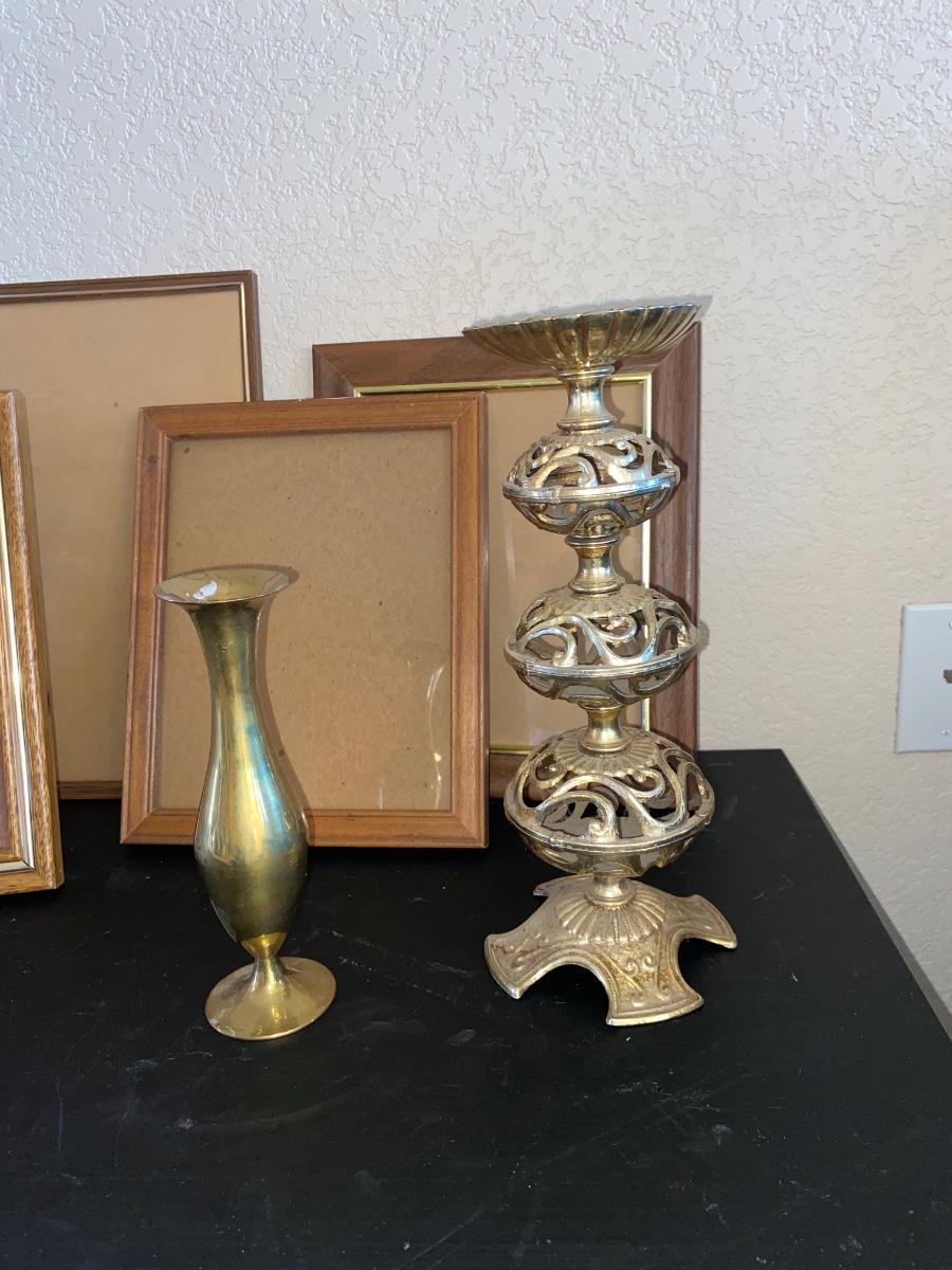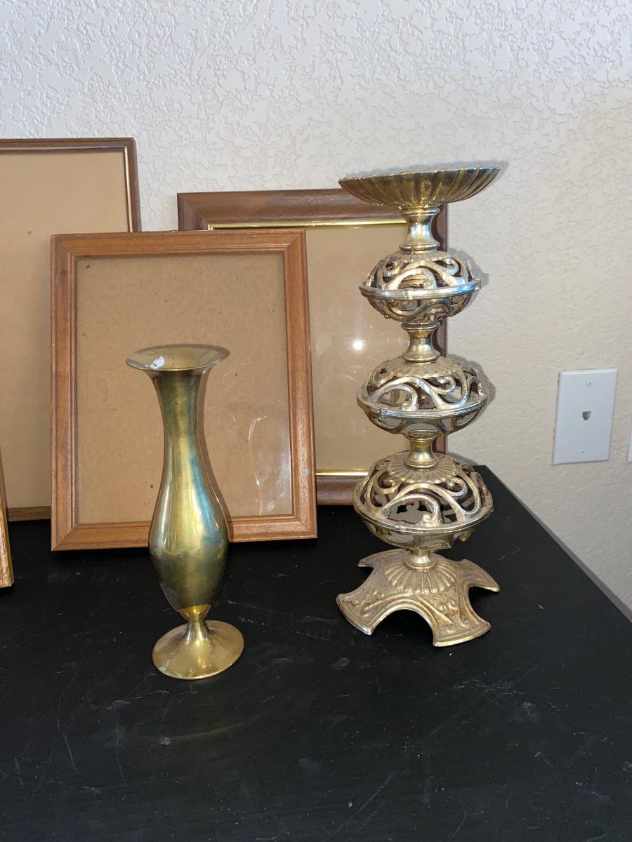 BRASS VASE, CANDLEHOLDER AND PICTURE FRAMES