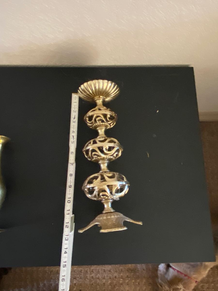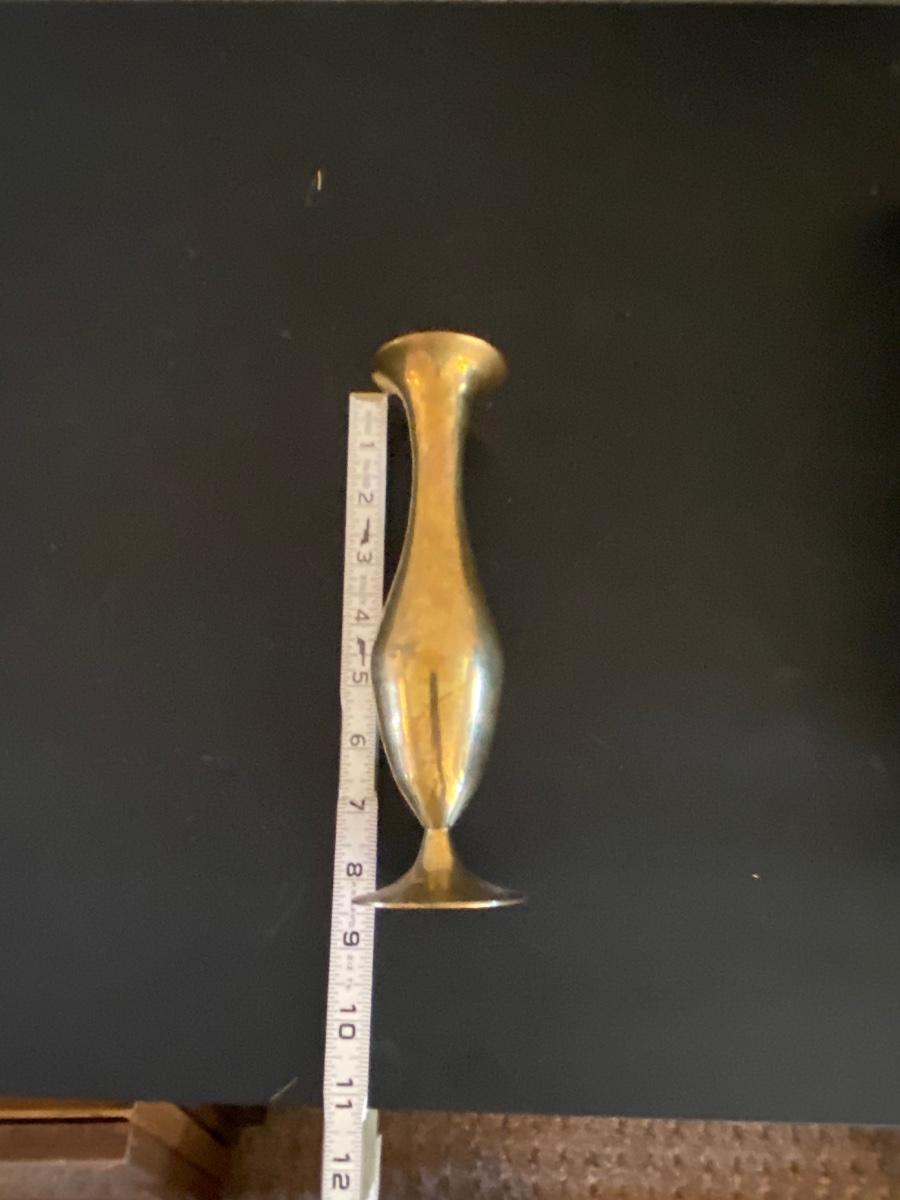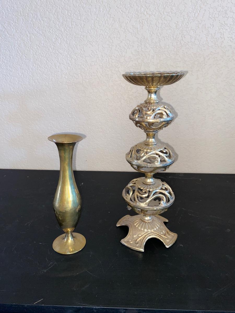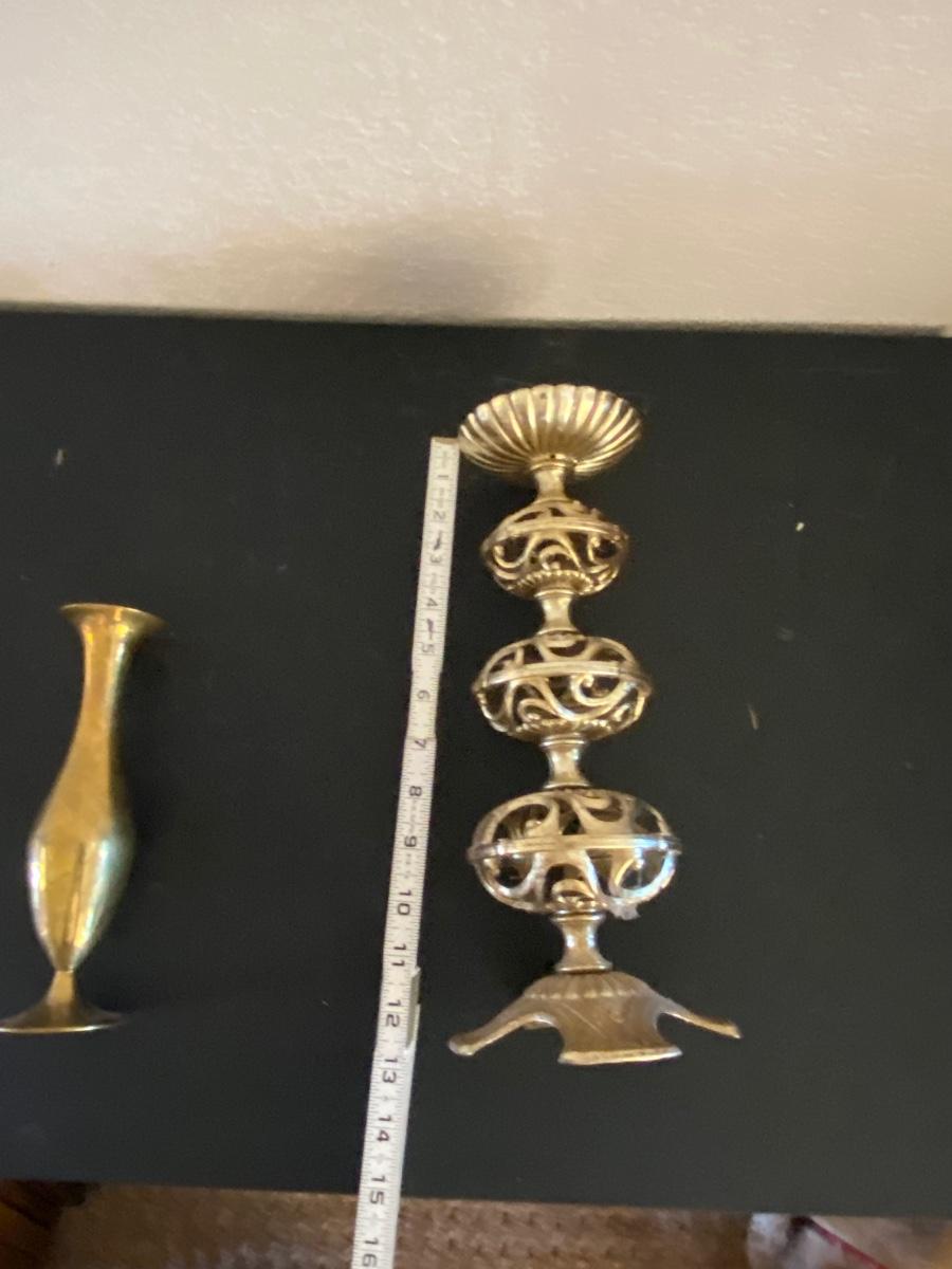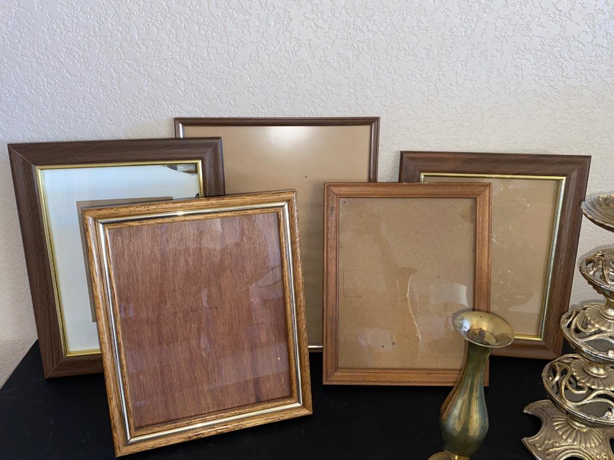 BRASS VASE, CANDLEHOLDER AND PICTURE FRAMES