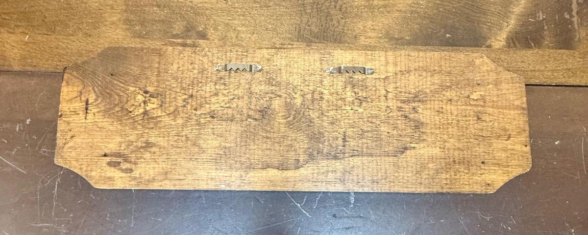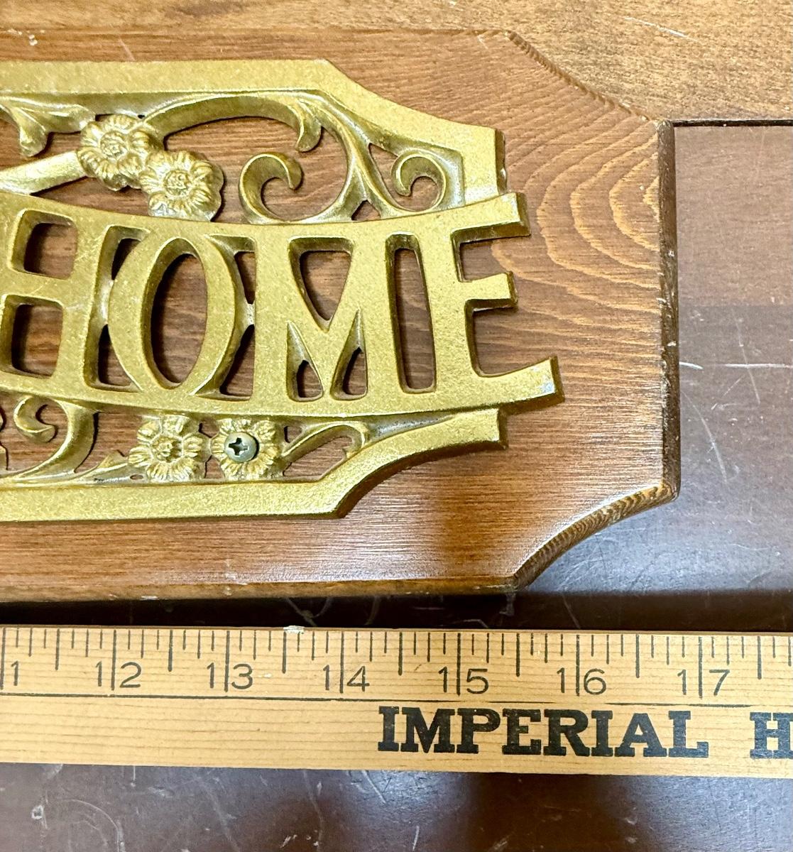 Raised metal letters painted gold to look like brass, attached to oak board. Made to hang on the wall. Good condition, approx. 17" long.