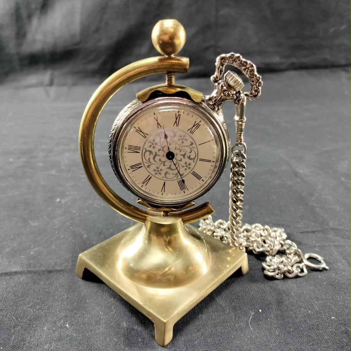 This auction lot is for a Brass Watch Holder with Display Watch. This is a solid brass watch holder with a Display Modern Pocket Watch and Fob Chain. The Westclox watch does not work - display only.. Holder is about 5-inches tall x 2-1/2-inches square.