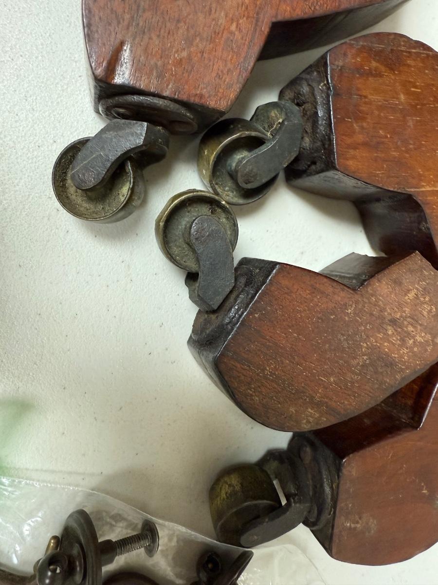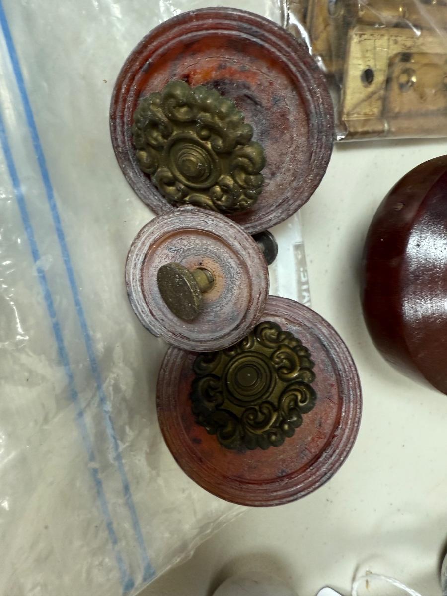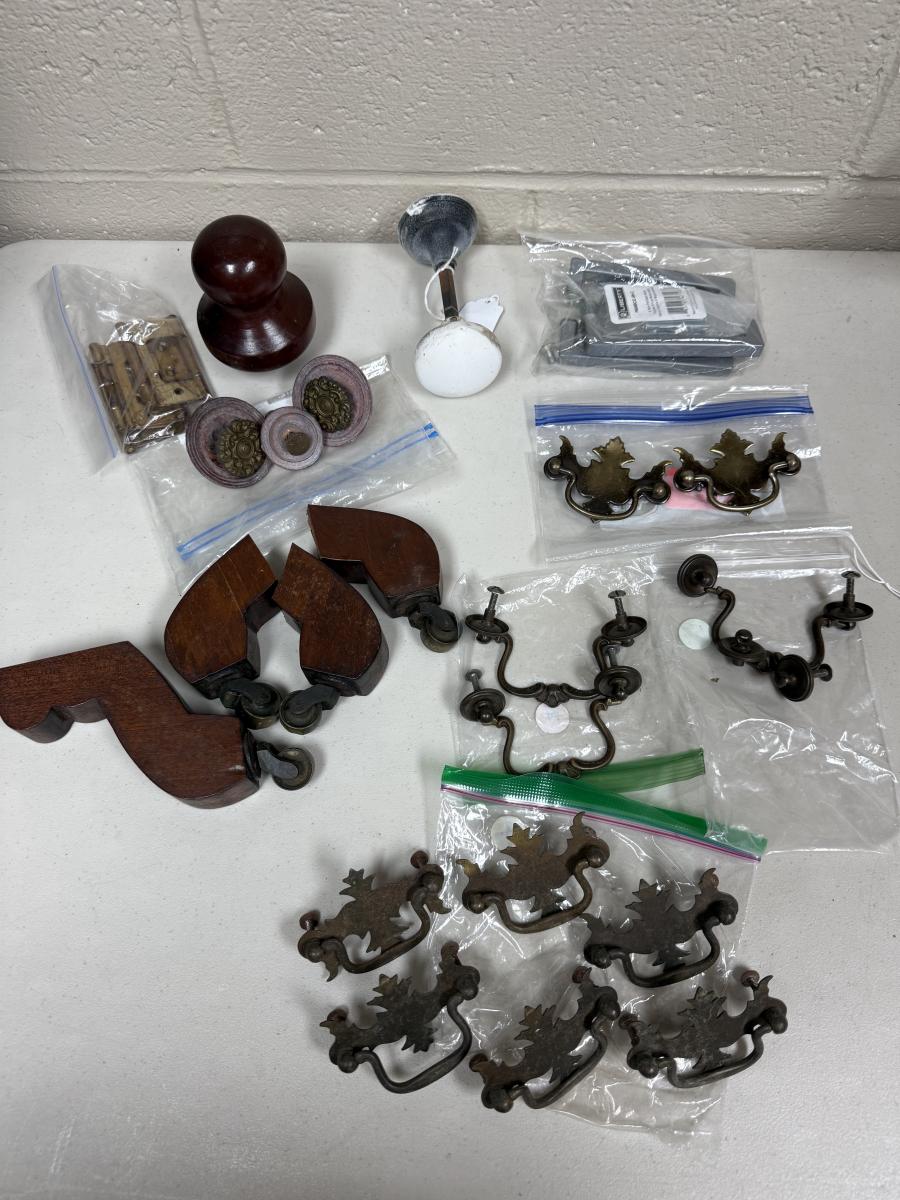 Brass wheels, bake light knobs, brass pulls, brass hinges, finial from bed