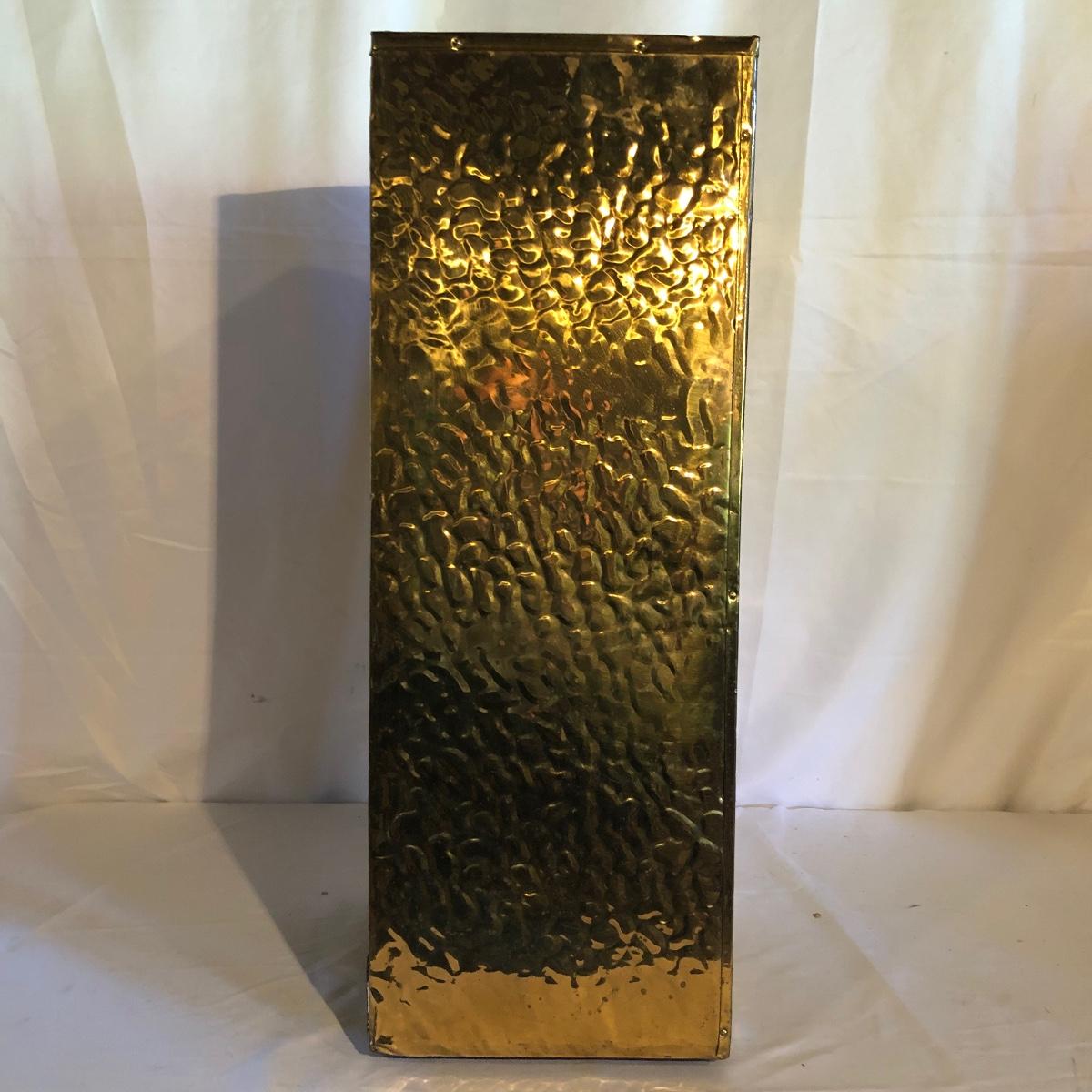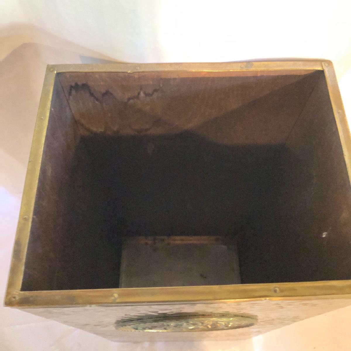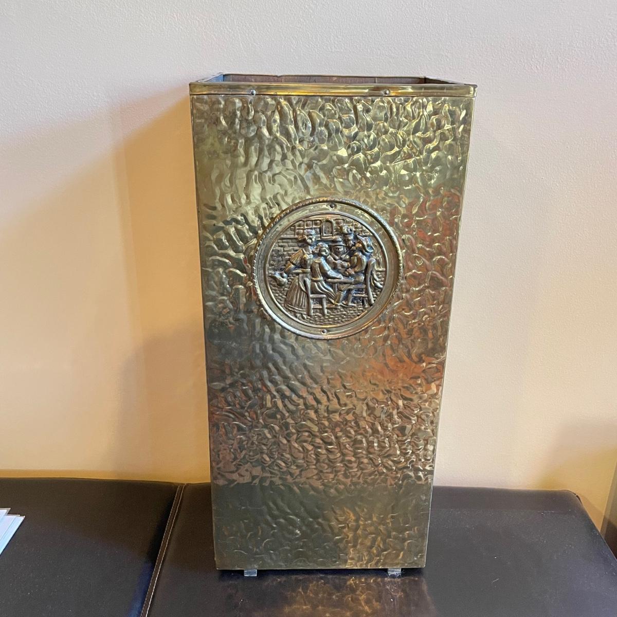 Lot includes brass and wooden umbrella stand with embossed medallion and pull out metal tray. Stand measures 8” x 10” x 22.5”.