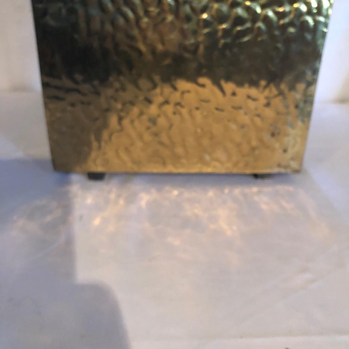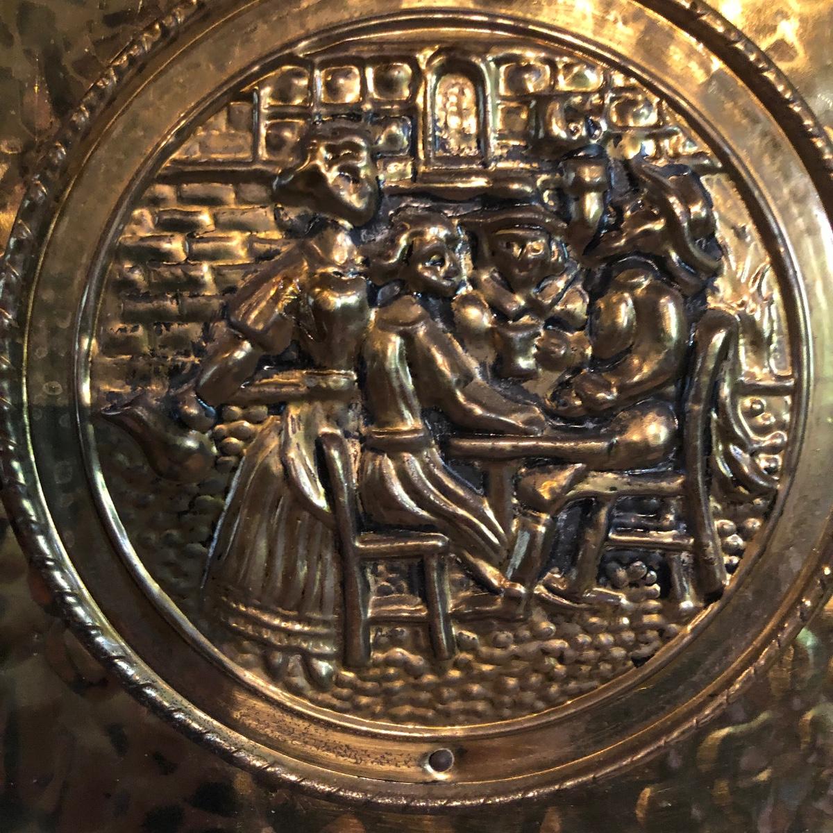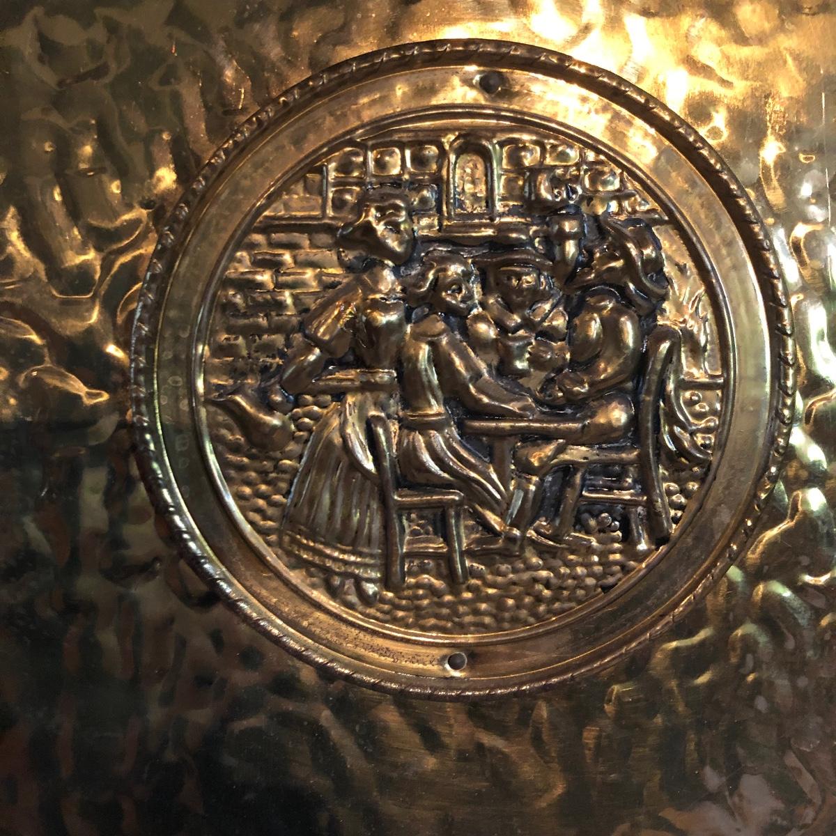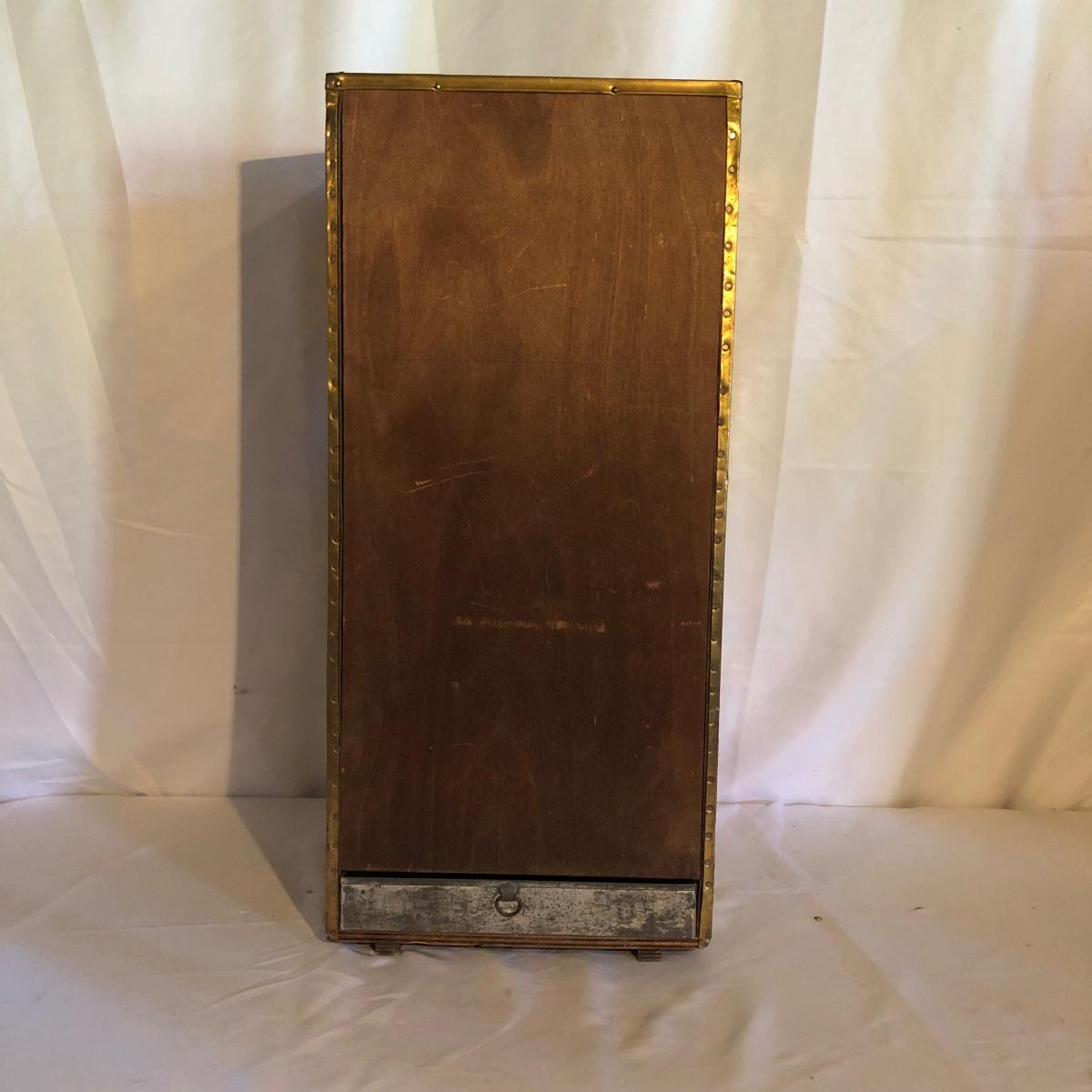 Lot includes brass and wooden umbrella stand with embossed medallion and pull out metal tray. Stand measures 8” x 10” x 22.5”.