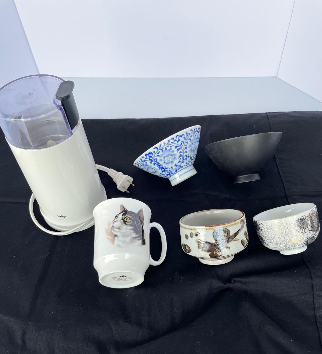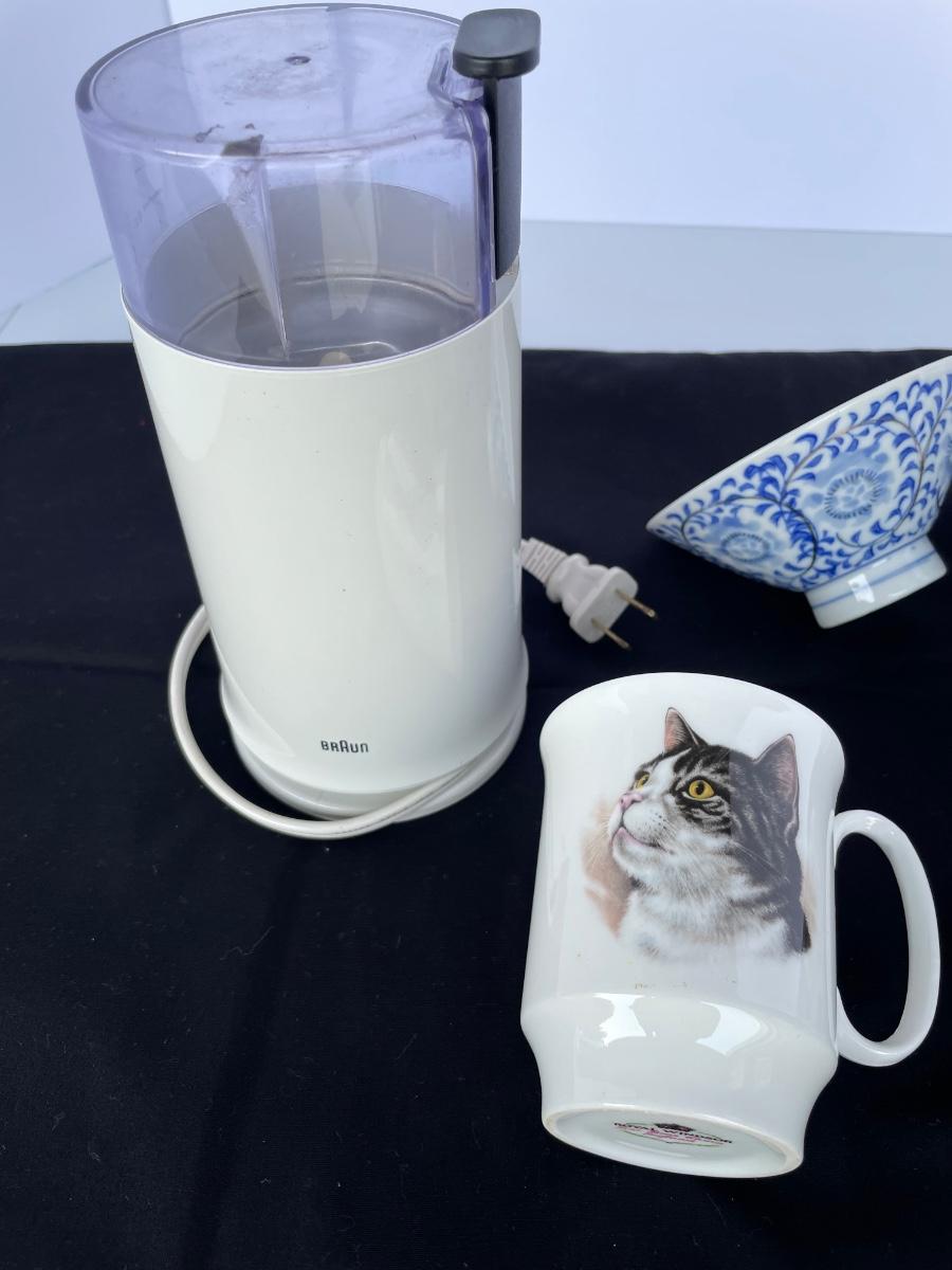 Braun Coffee Grinder, cups and Dansk Cheese Server