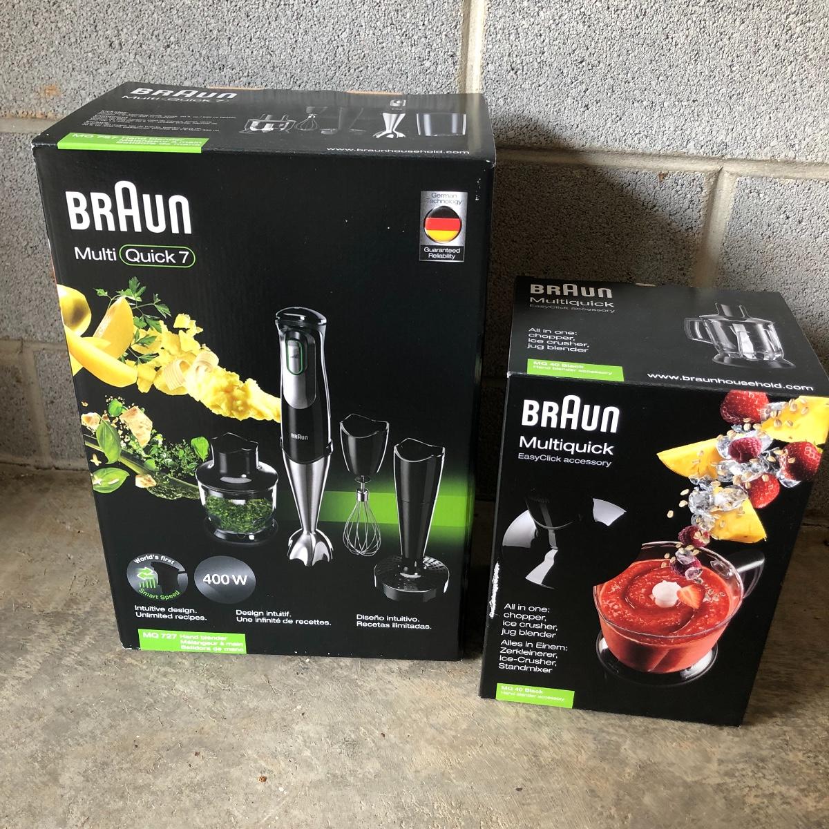 This Braun Multi Quick 7 is new in box along with the easy click accessory jug. See images for more info. All items are in the boxes