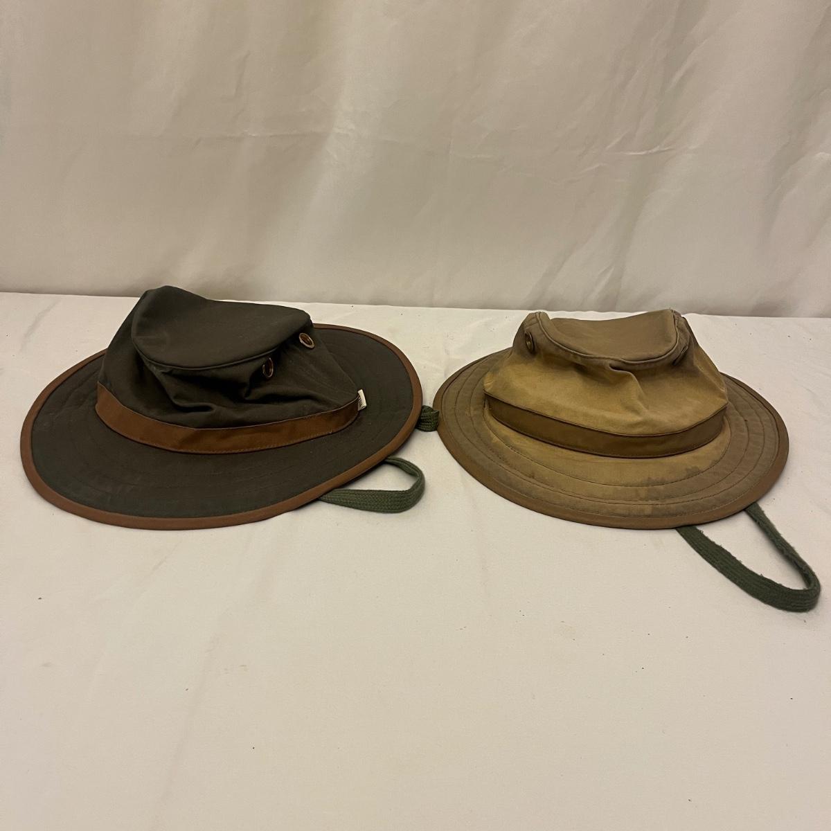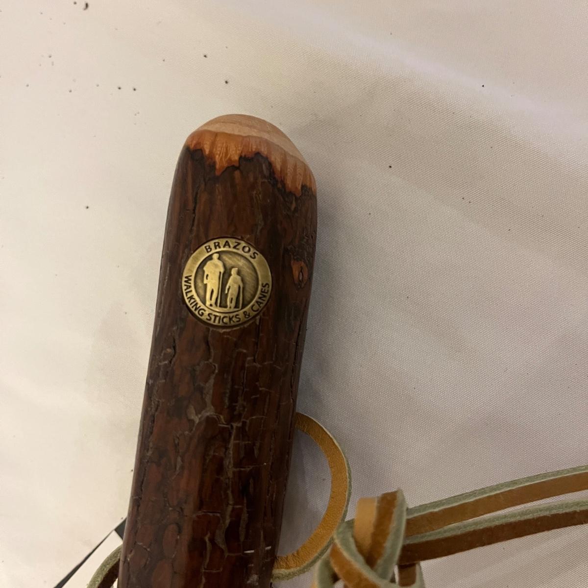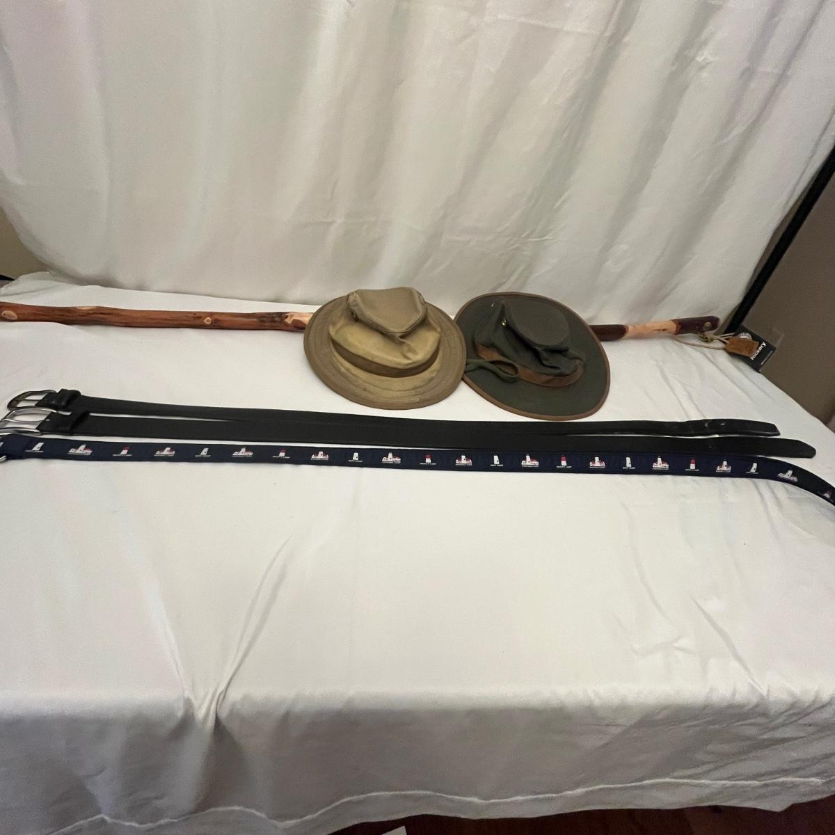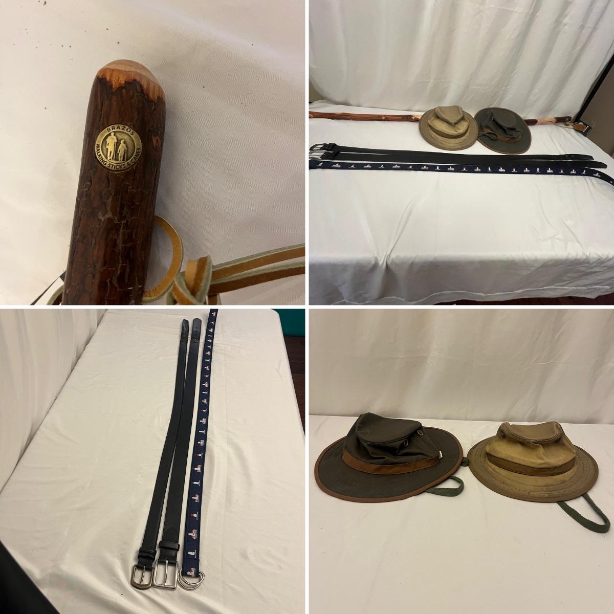 This Brazos Hickory walking stick measures 57.5” long. Lot also includes two Tilley hats in sizes 7 1/4 and 7 1/2. Two synthetic leather belts and one web belt measure 43.5” long.