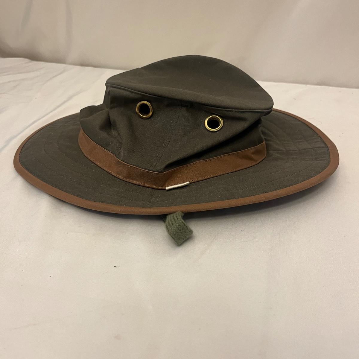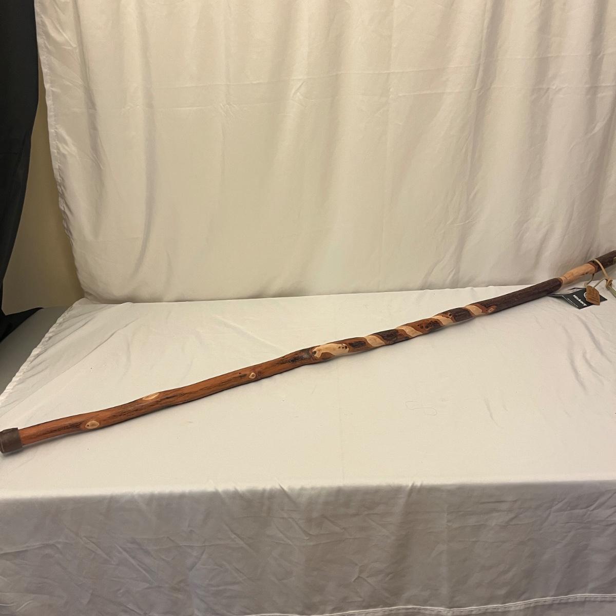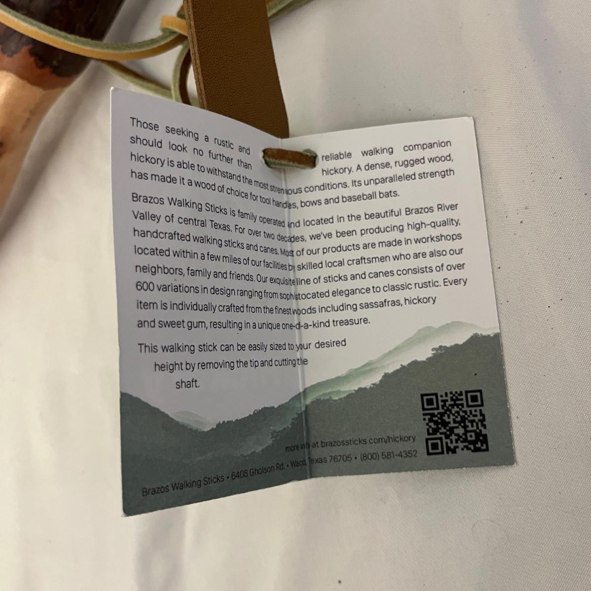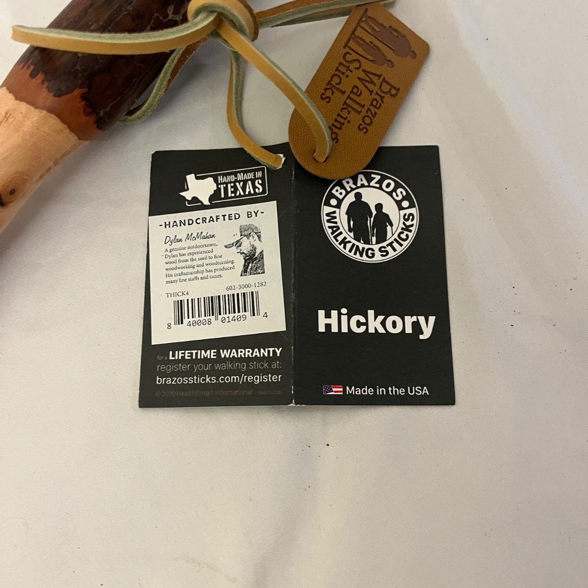This Brazos Hickory walking stick measures 57.5” long. Lot also includes two Tilley hats in sizes 7 1/4 and 7 1/2. Two synthetic leather belts and one web belt measure 43.5” long.