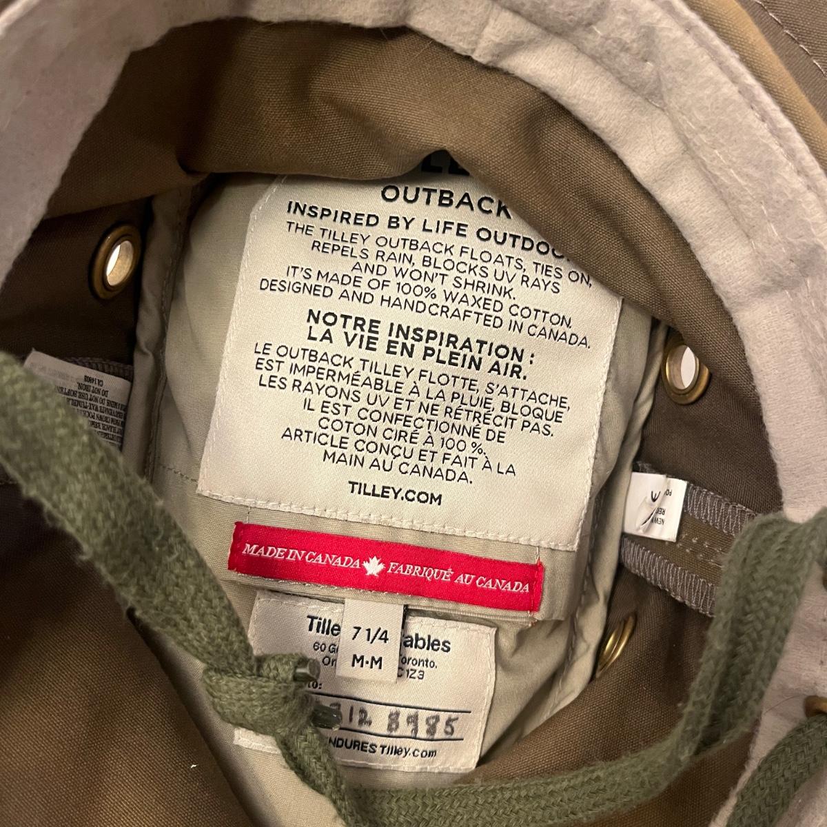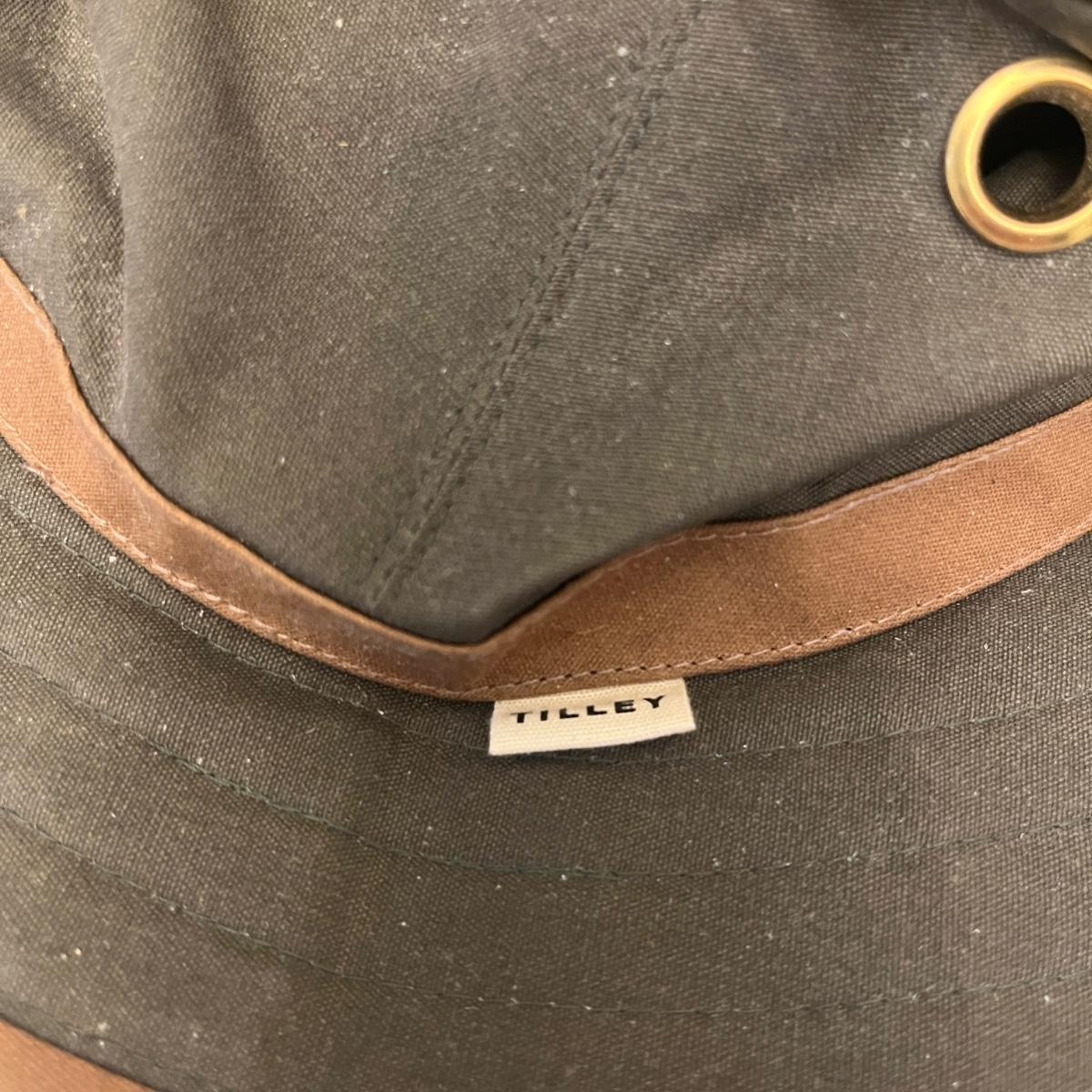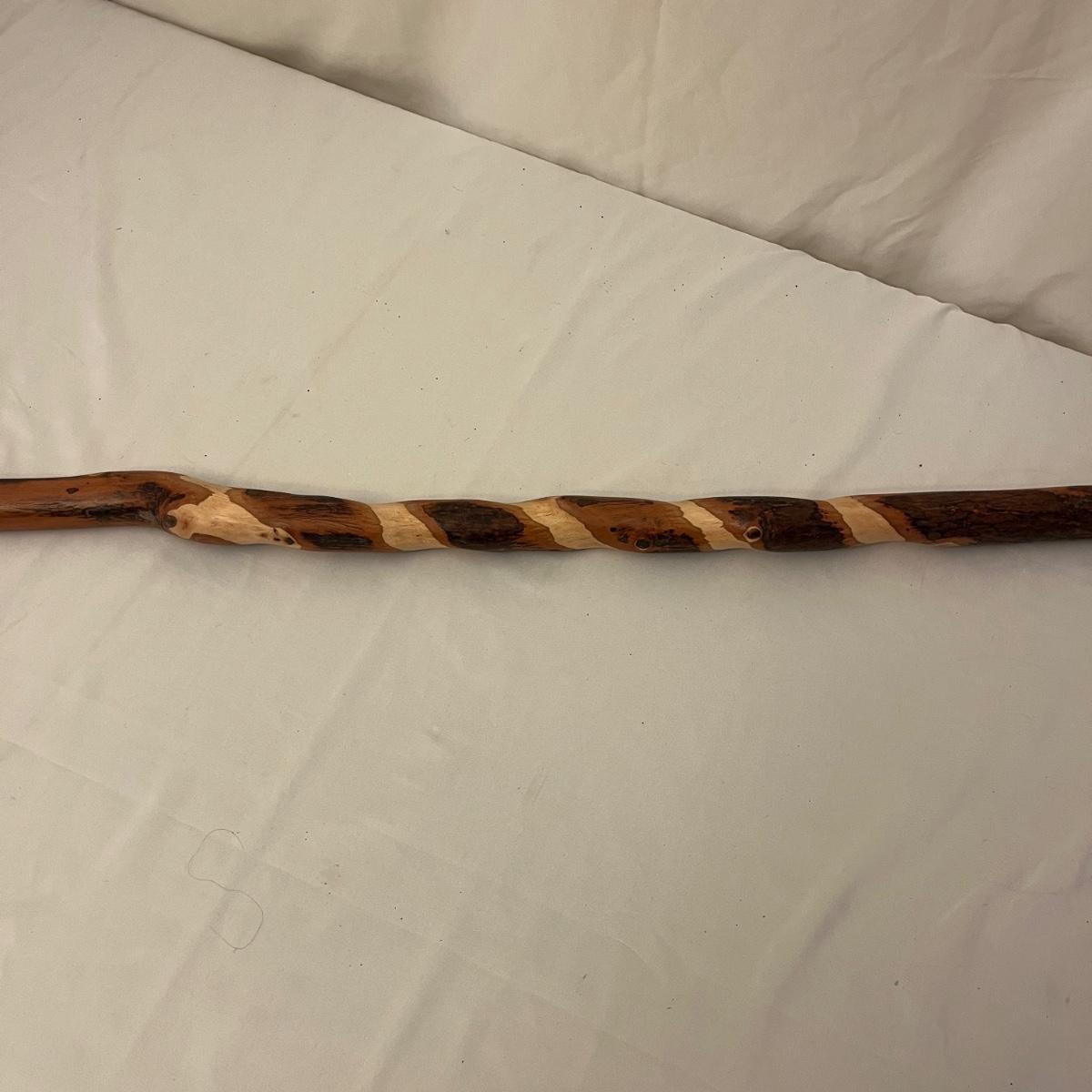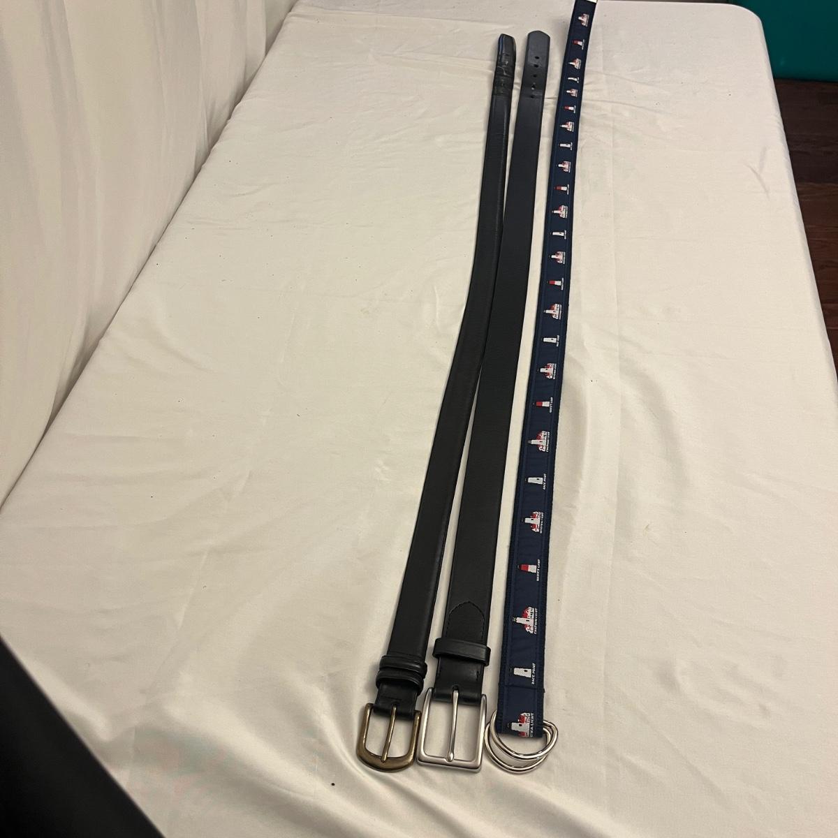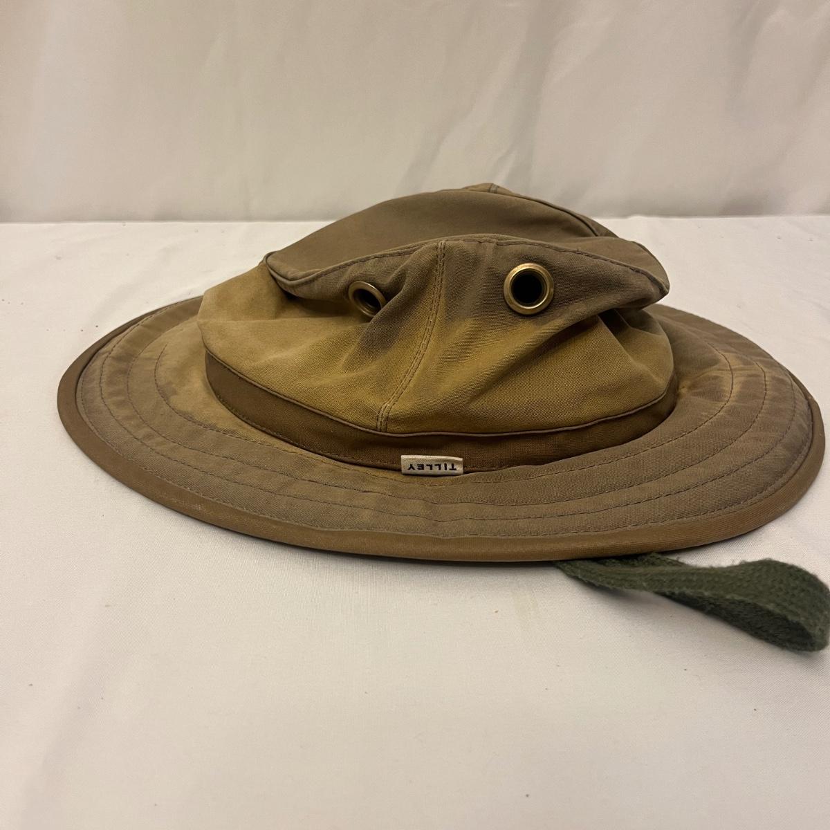 This Brazos Hickory walking stick measures 57.5” long. Lot also includes two Tilley hats in sizes 7 1/4 and 7 1/2. Two synthetic leather belts and one web belt measure 43.5” long.
