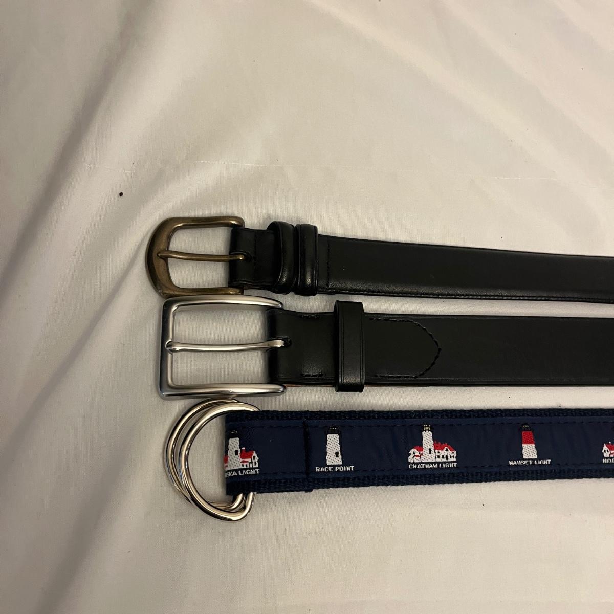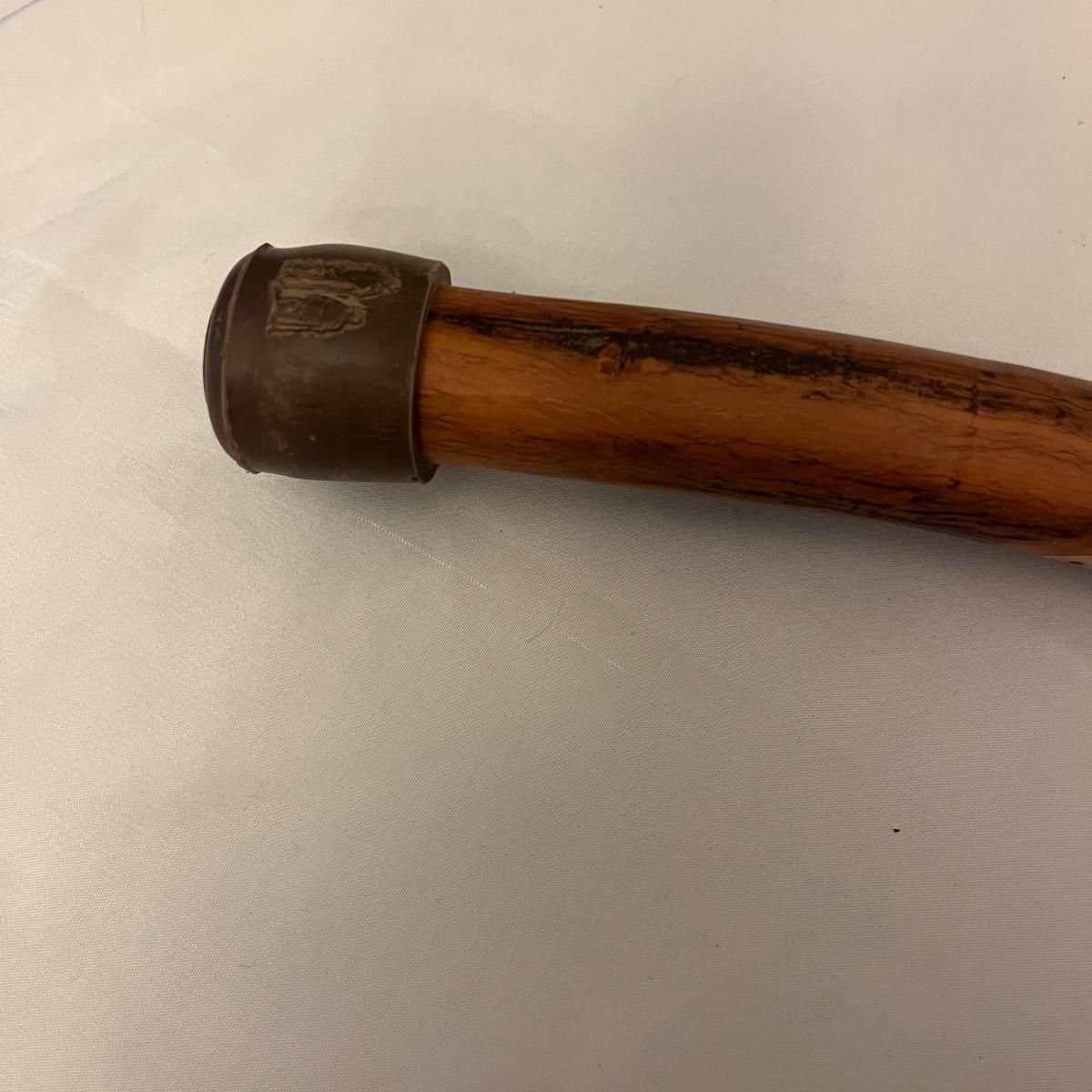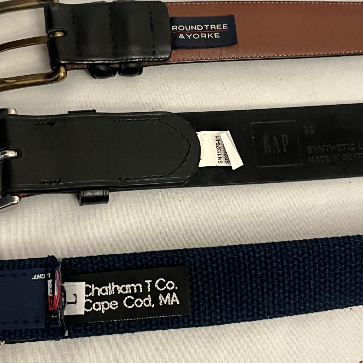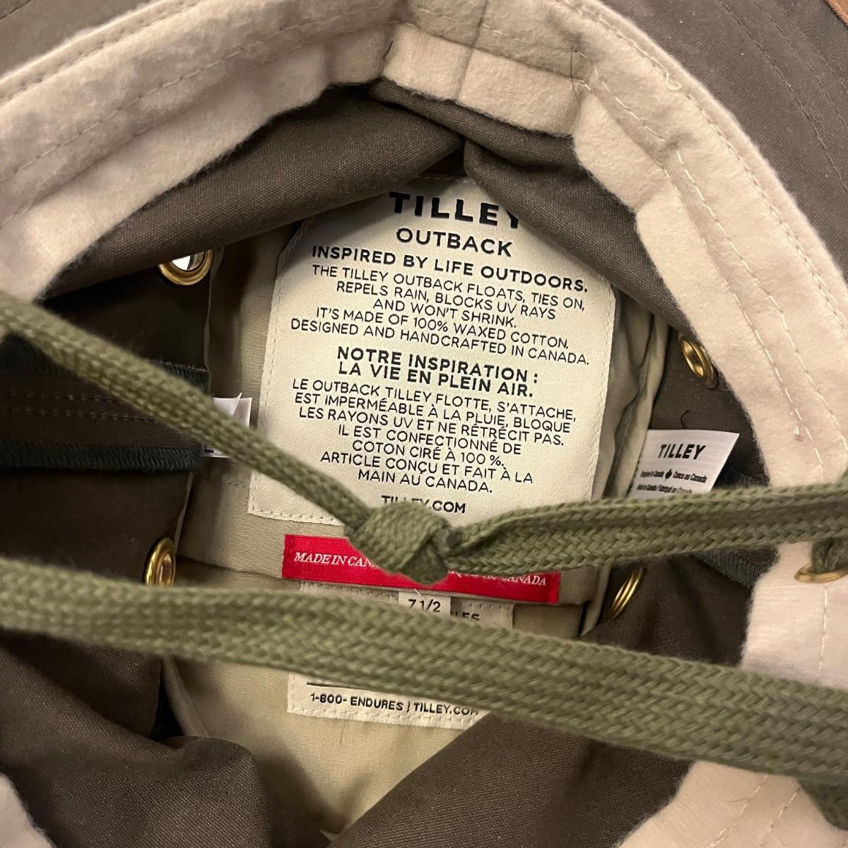This Brazos Hickory walking stick measures 57.5” long. Lot also includes two Tilley hats in sizes 7 1/4 and 7 1/2. Two synthetic leather belts and one web belt measure 43.5” long.