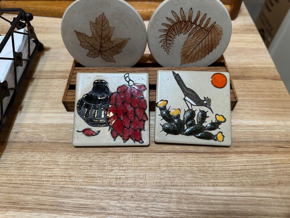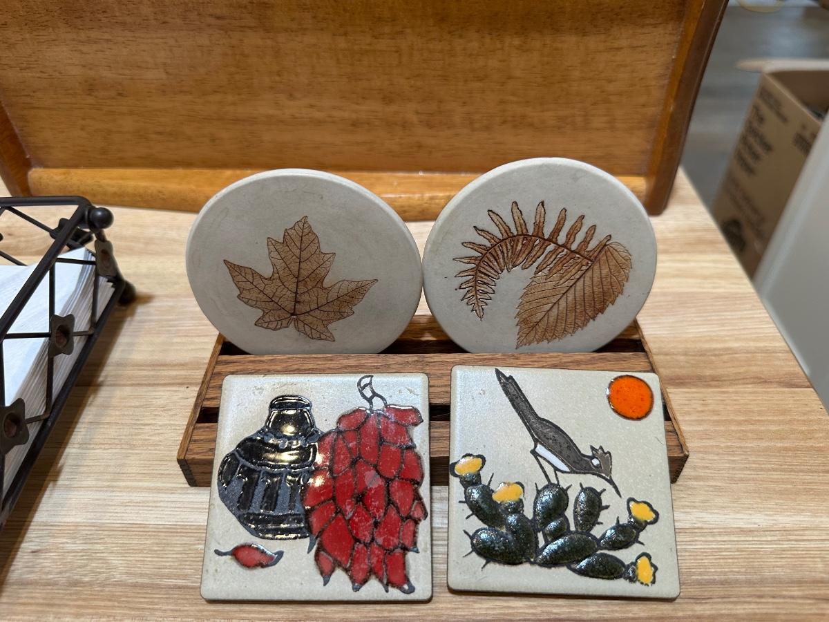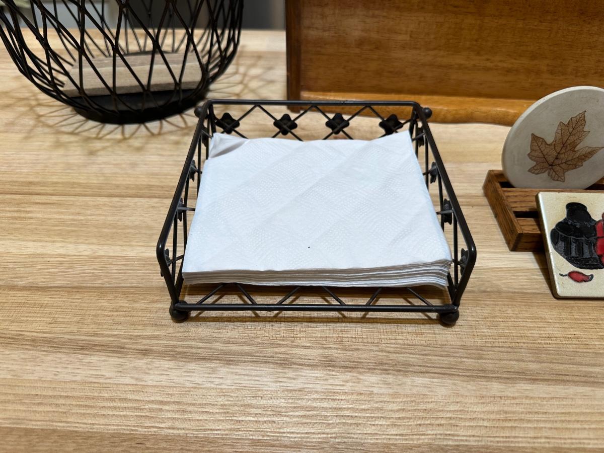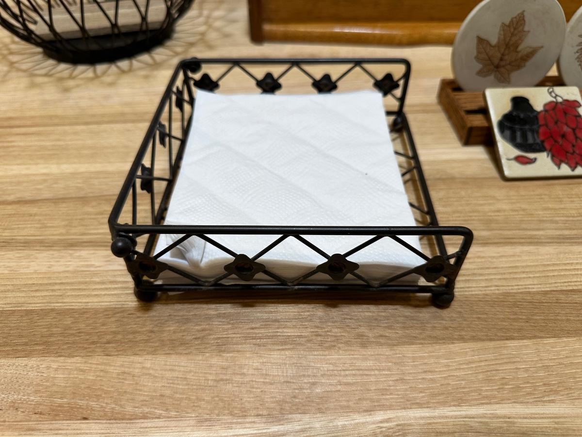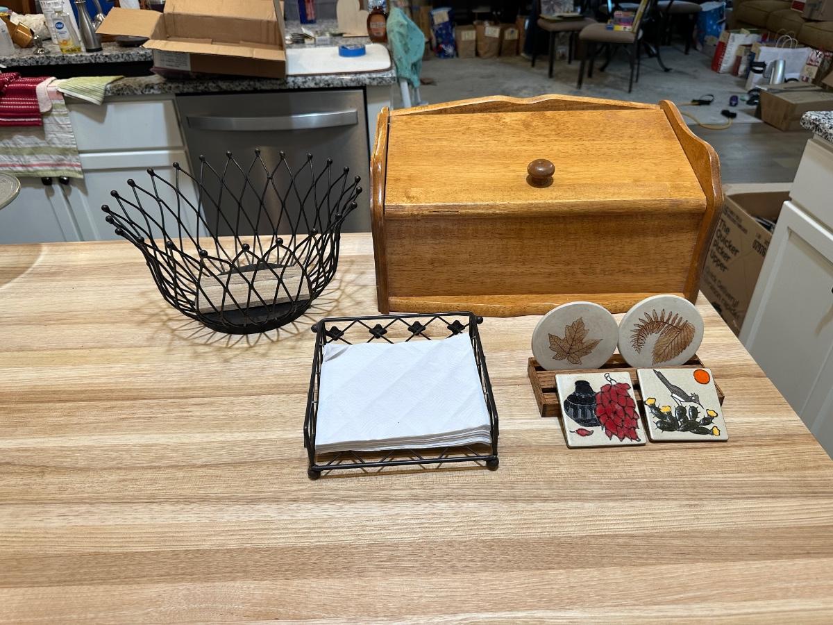 BREAD BOX, WIRE BASKET, NAPKIN RACK AND COASTERS