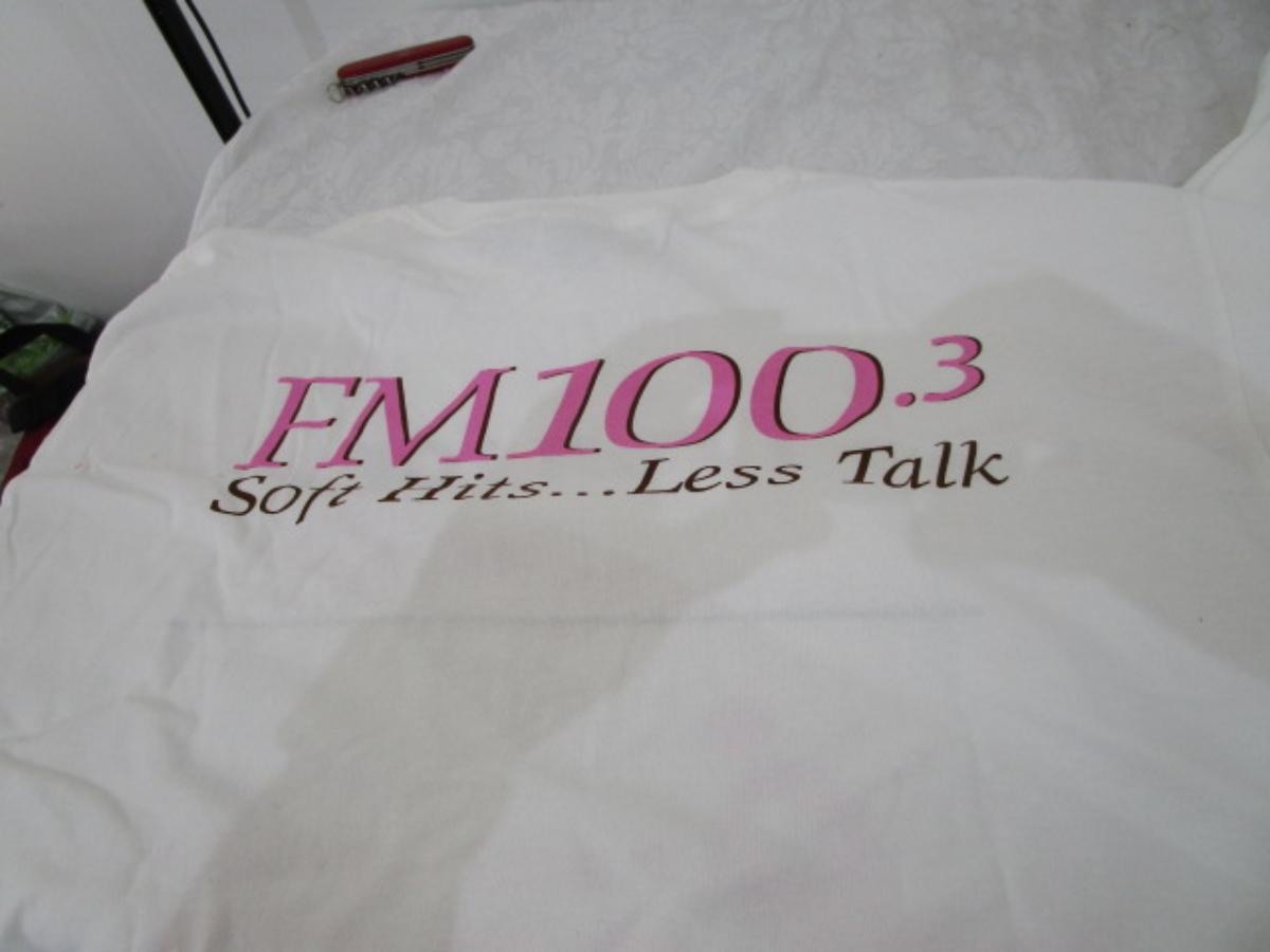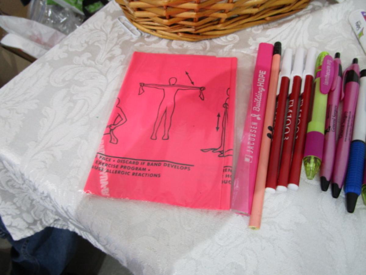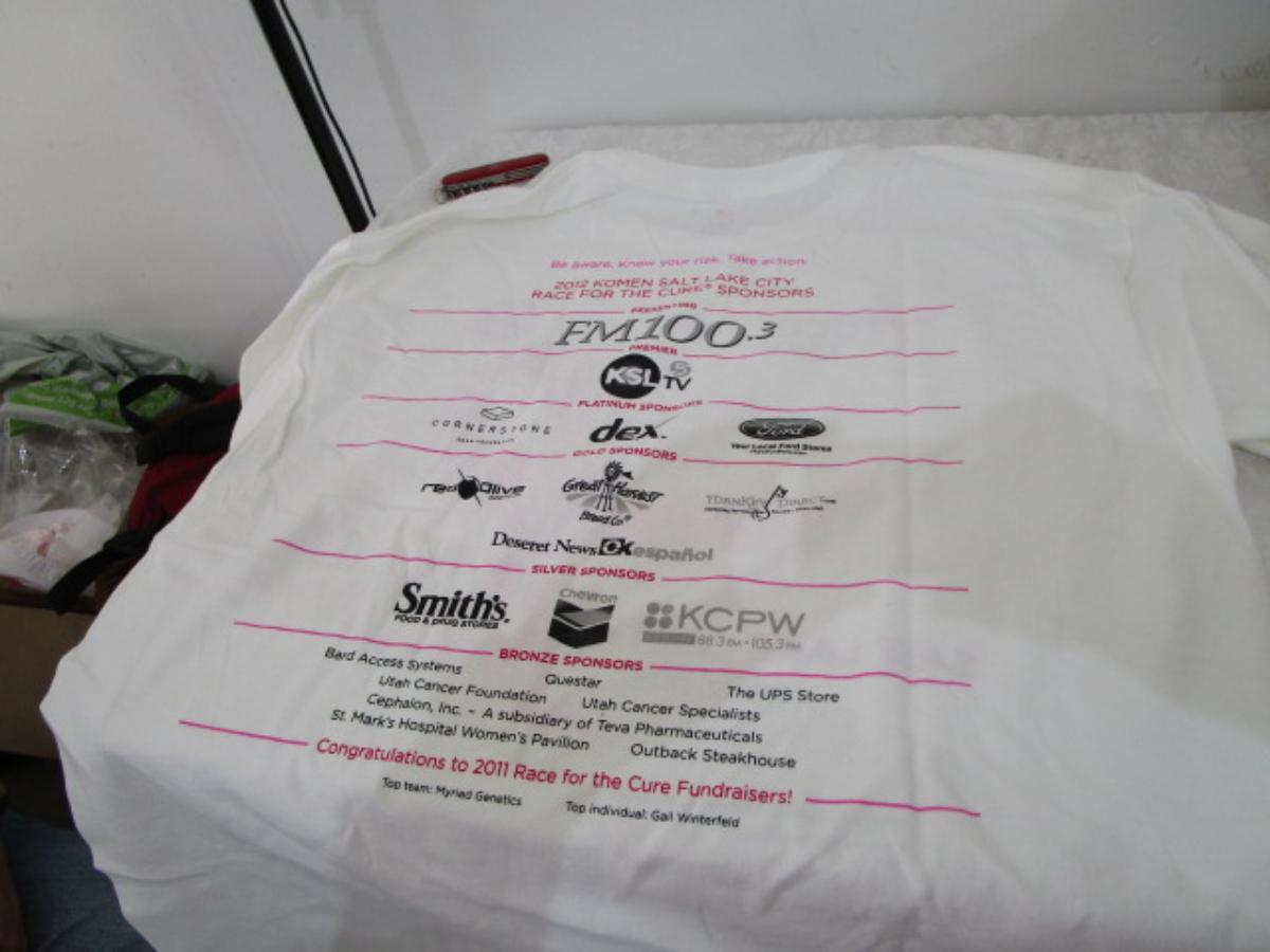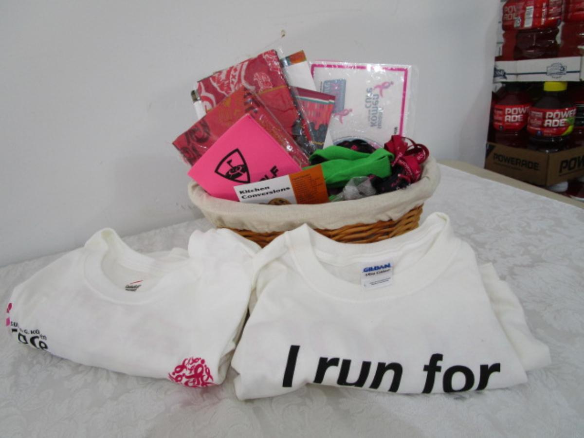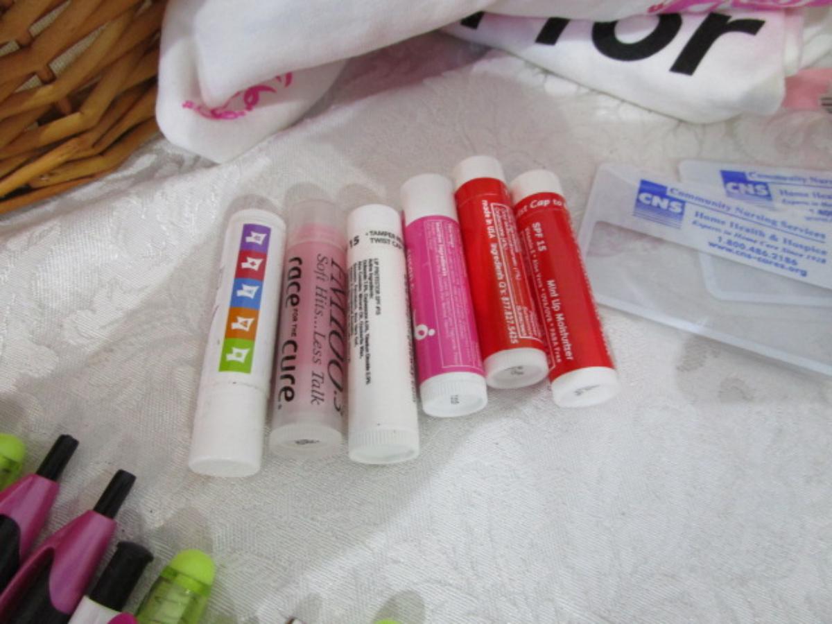 Basket with 2 brand new t-shirts, 1-L, 1-XL, key chains, stickers, scarves, nail files, pens, pencils, beach ball, pins, shoe strings, and more