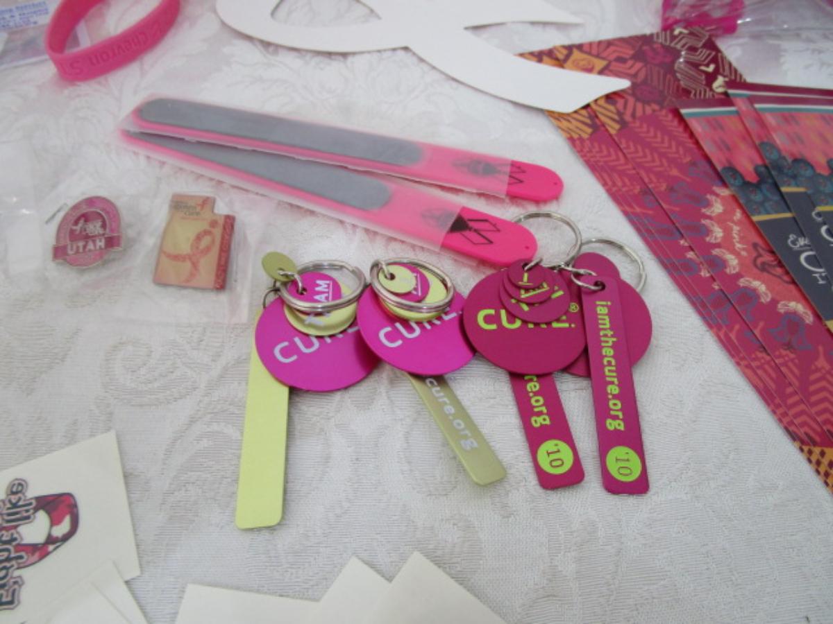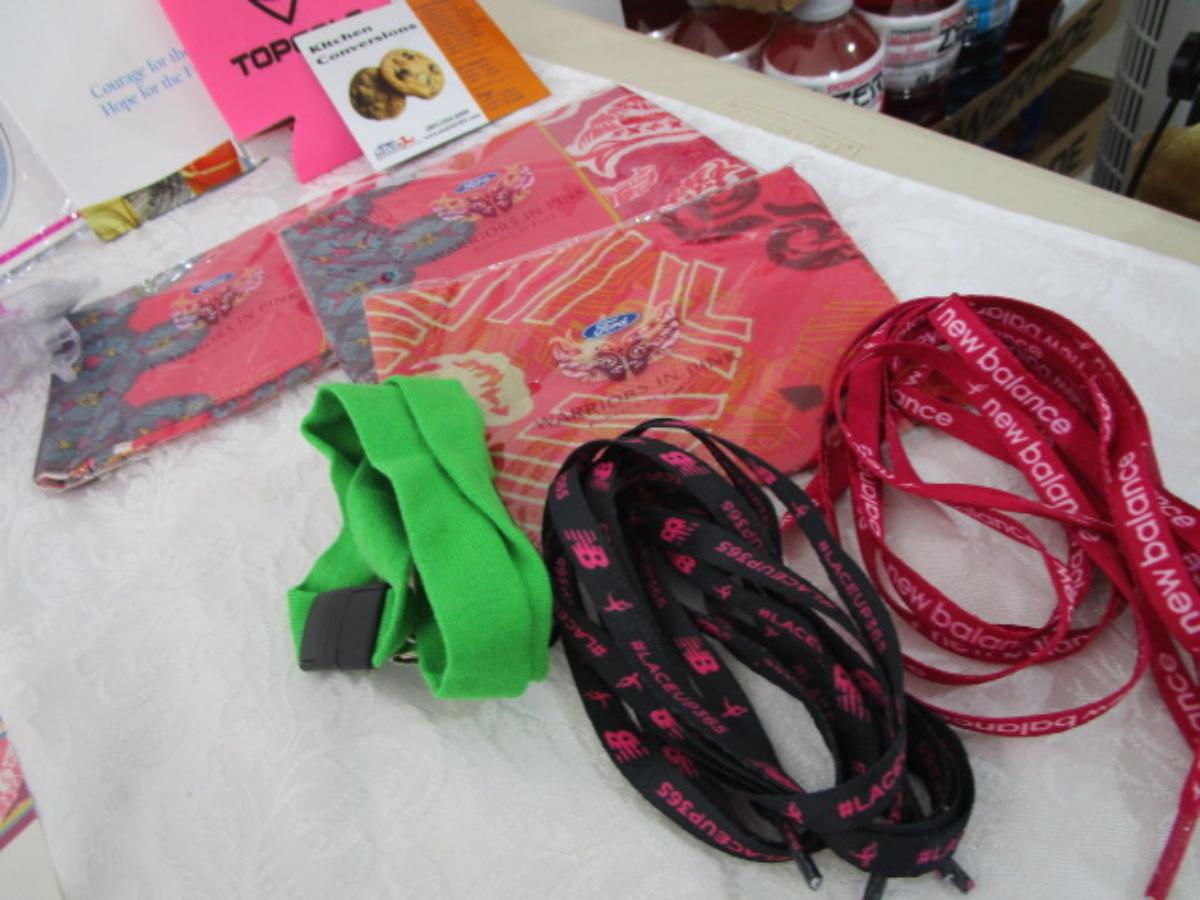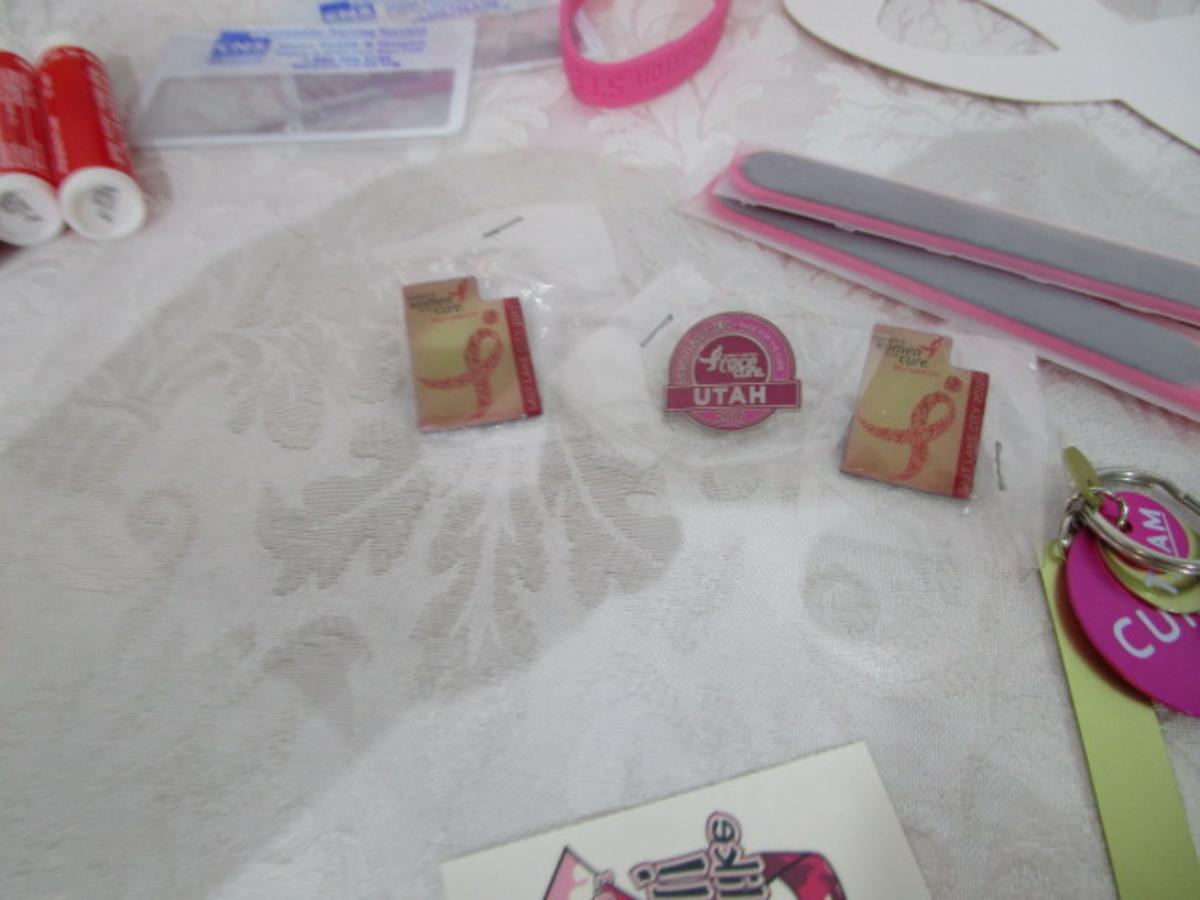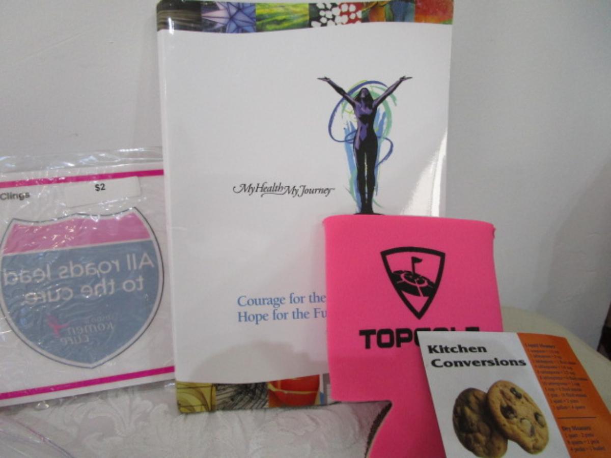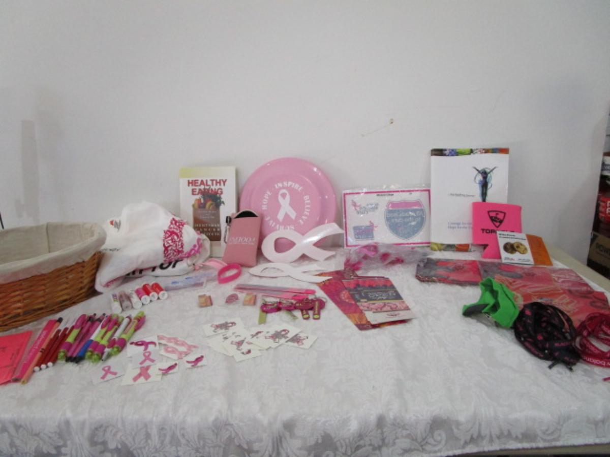 Basket with 2 brand new t-shirts, 1-L, 1-XL, key chains, stickers, scarves, nail files, pens, pencils, beach ball, pins, shoe strings, and more
