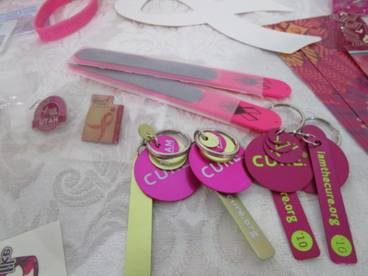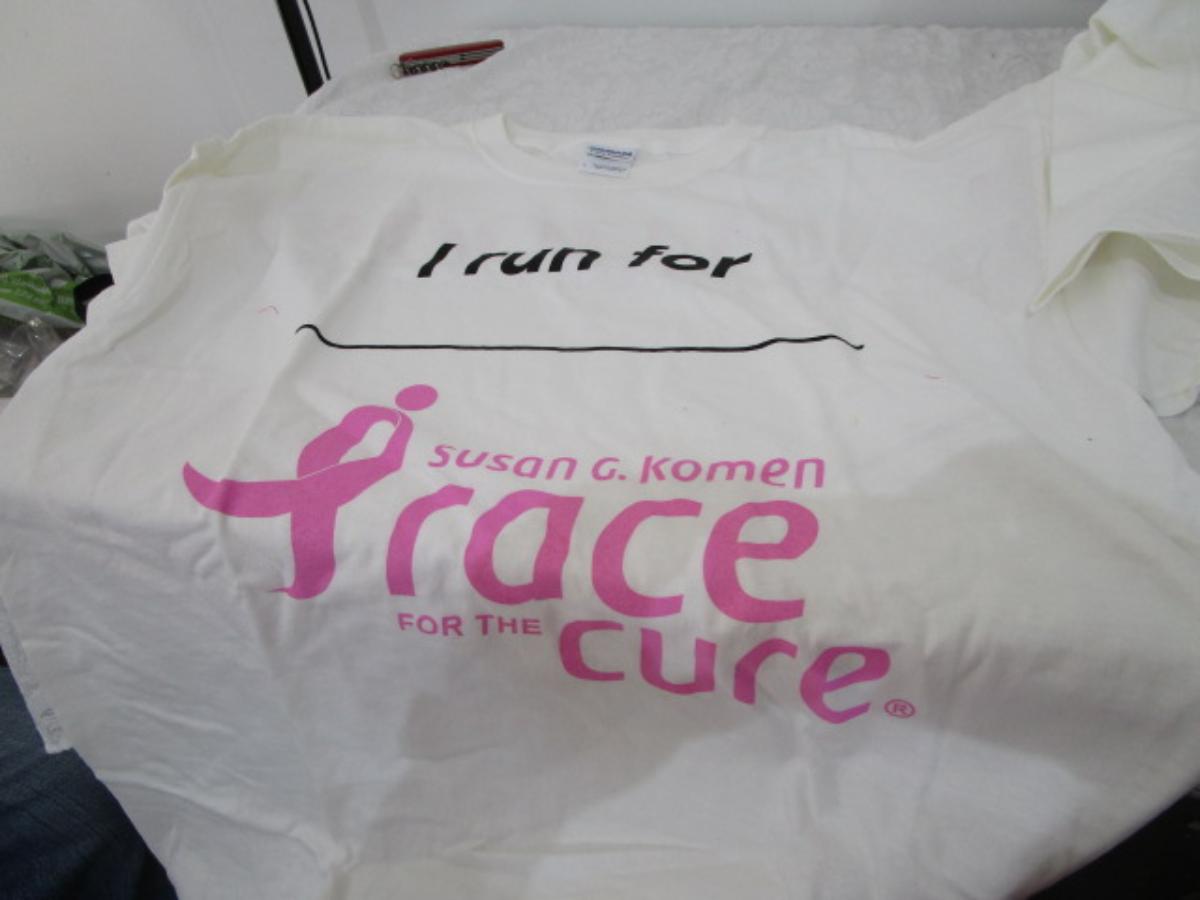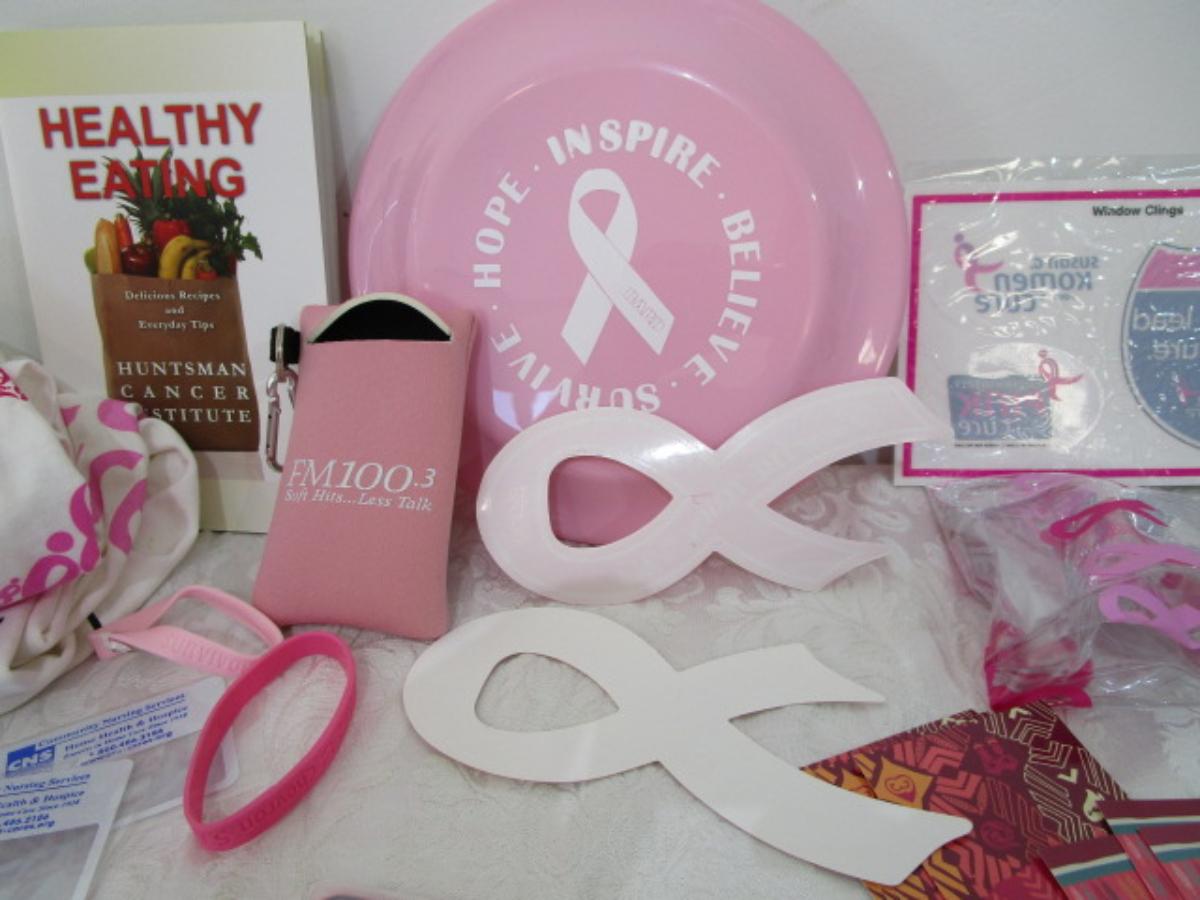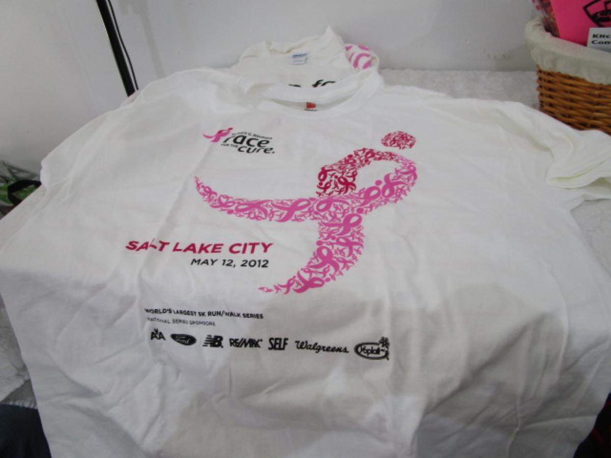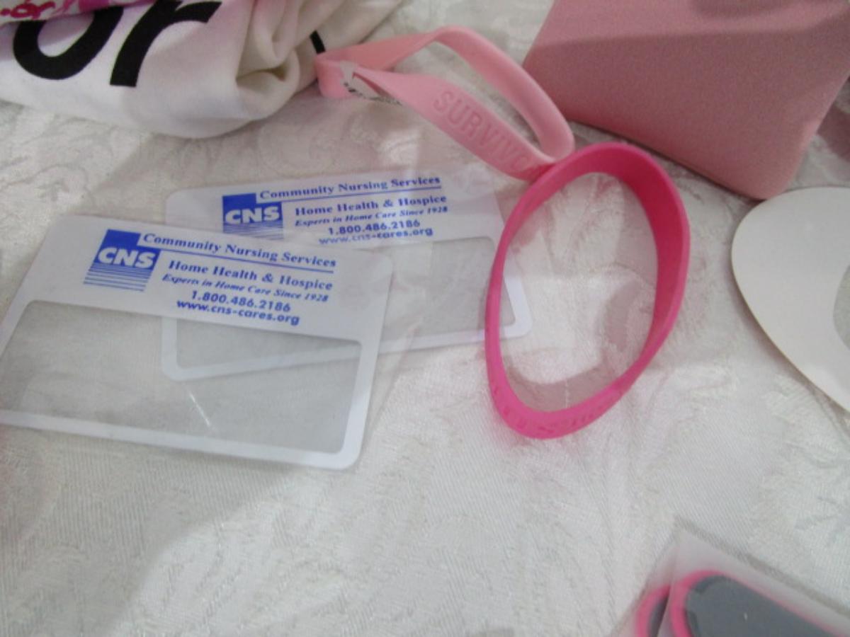 Basket with 2 brand new t-shirts, 1-L, 1-XL, key chains, stickers, scarves, nail files, pens, pencils, beach ball, pins, shoe strings, and more