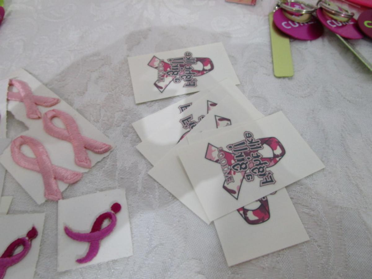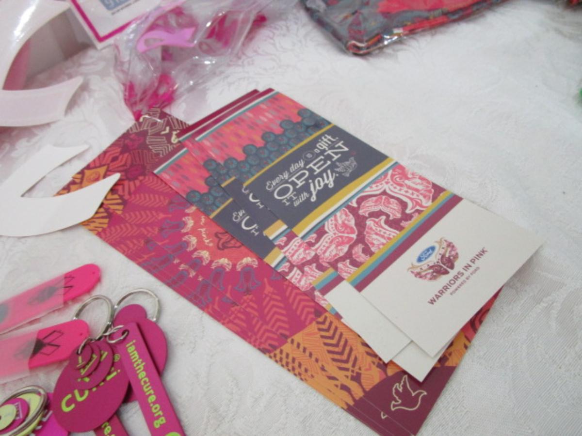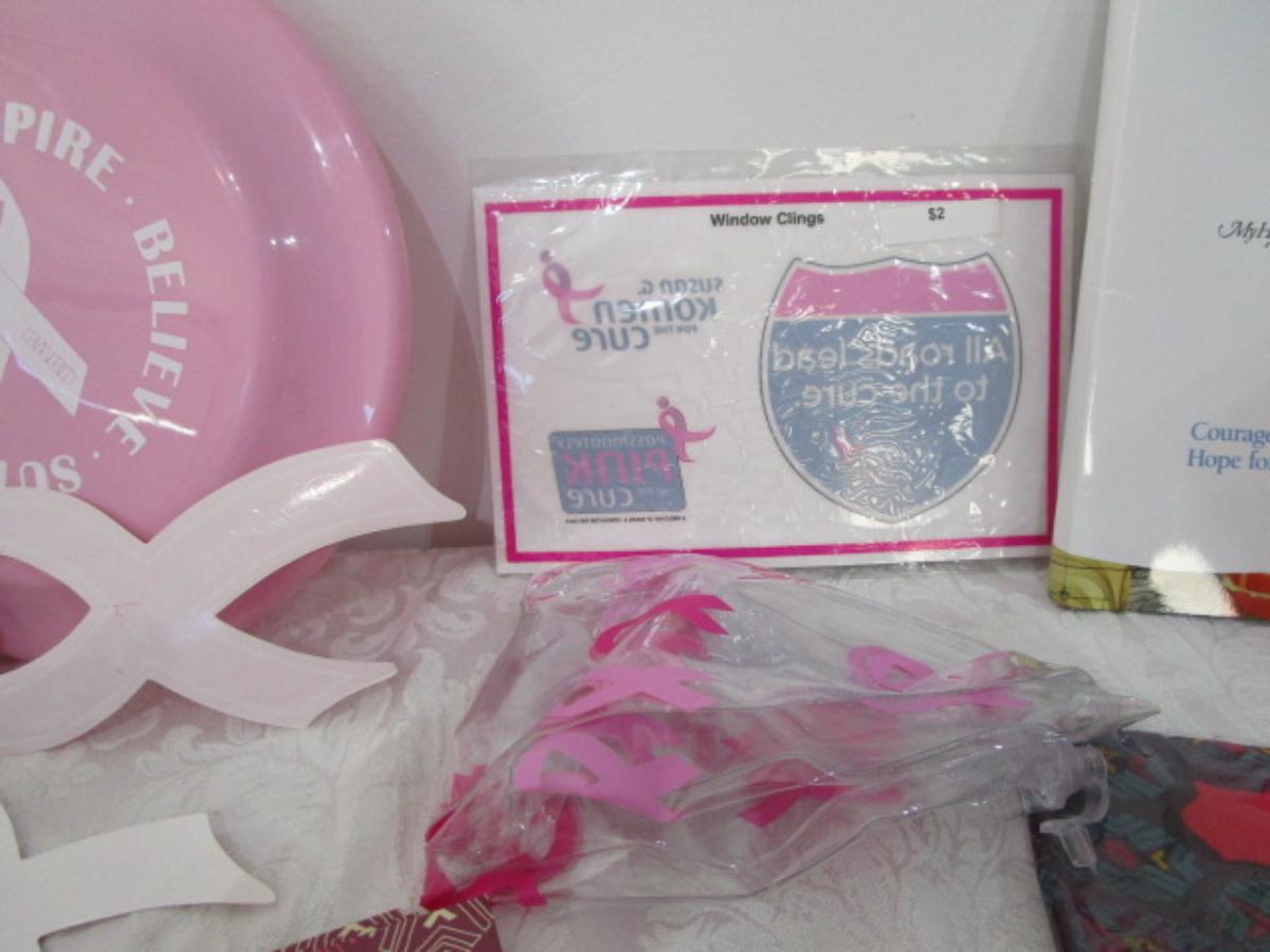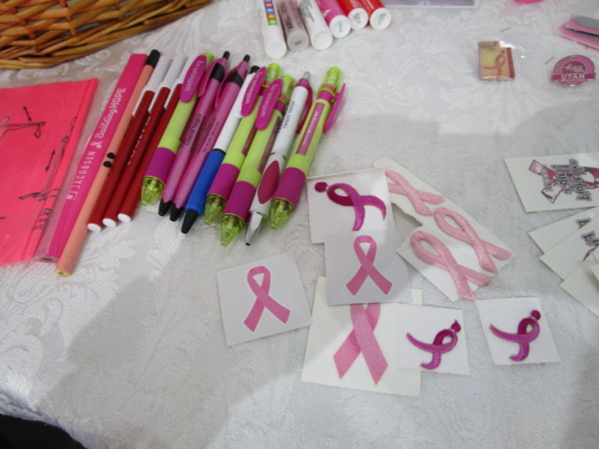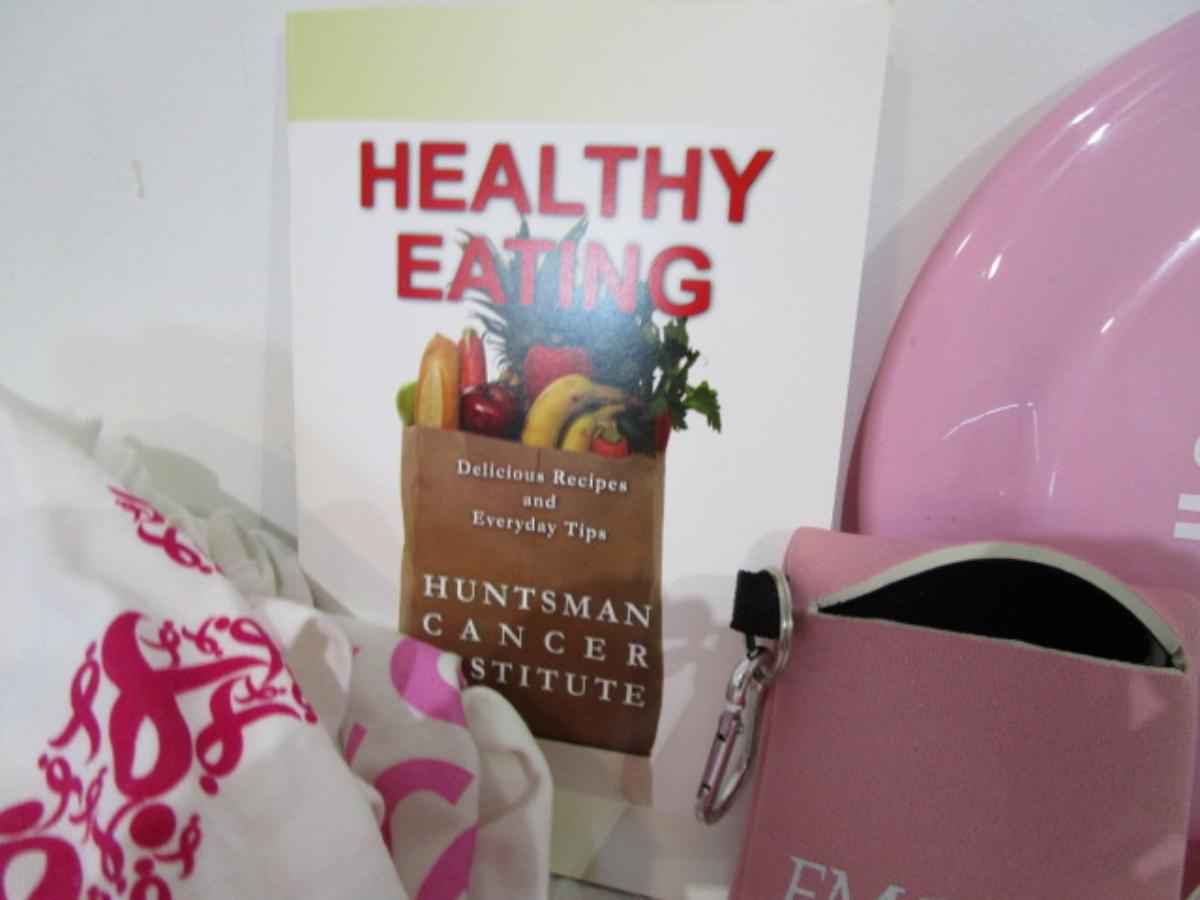 Basket with 2 brand new t-shirts, 1-L, 1-XL, key chains, stickers, scarves, nail files, pens, pencils, beach ball, pins, shoe strings, and more