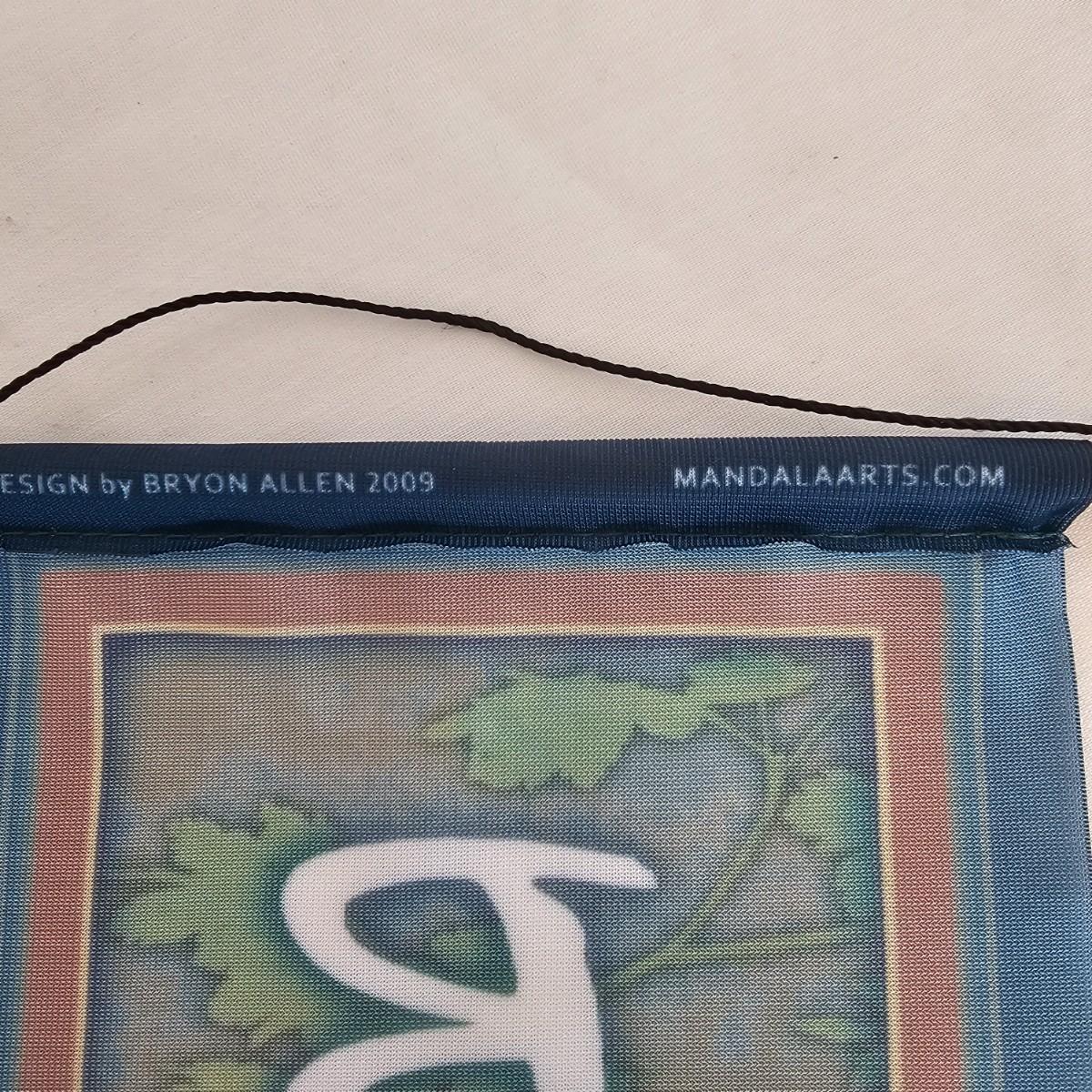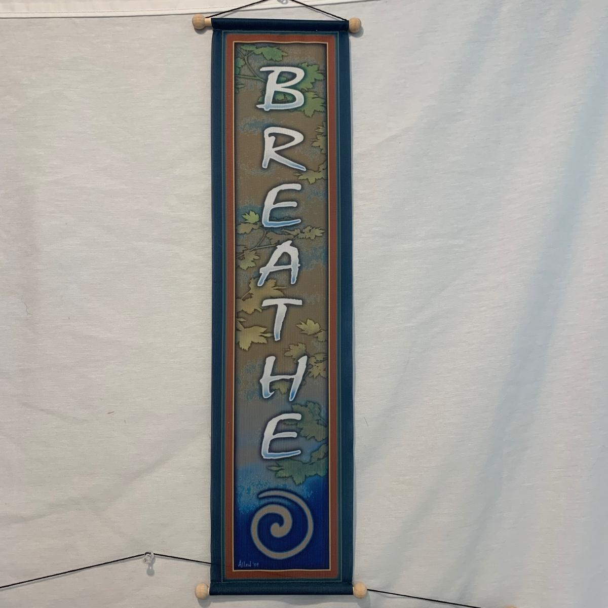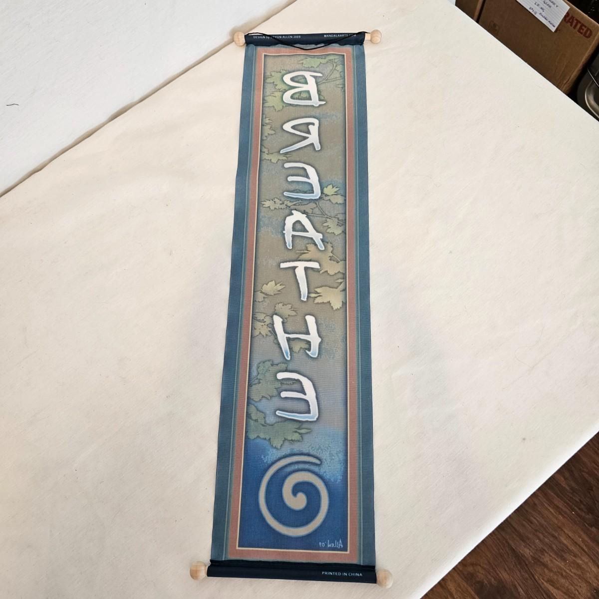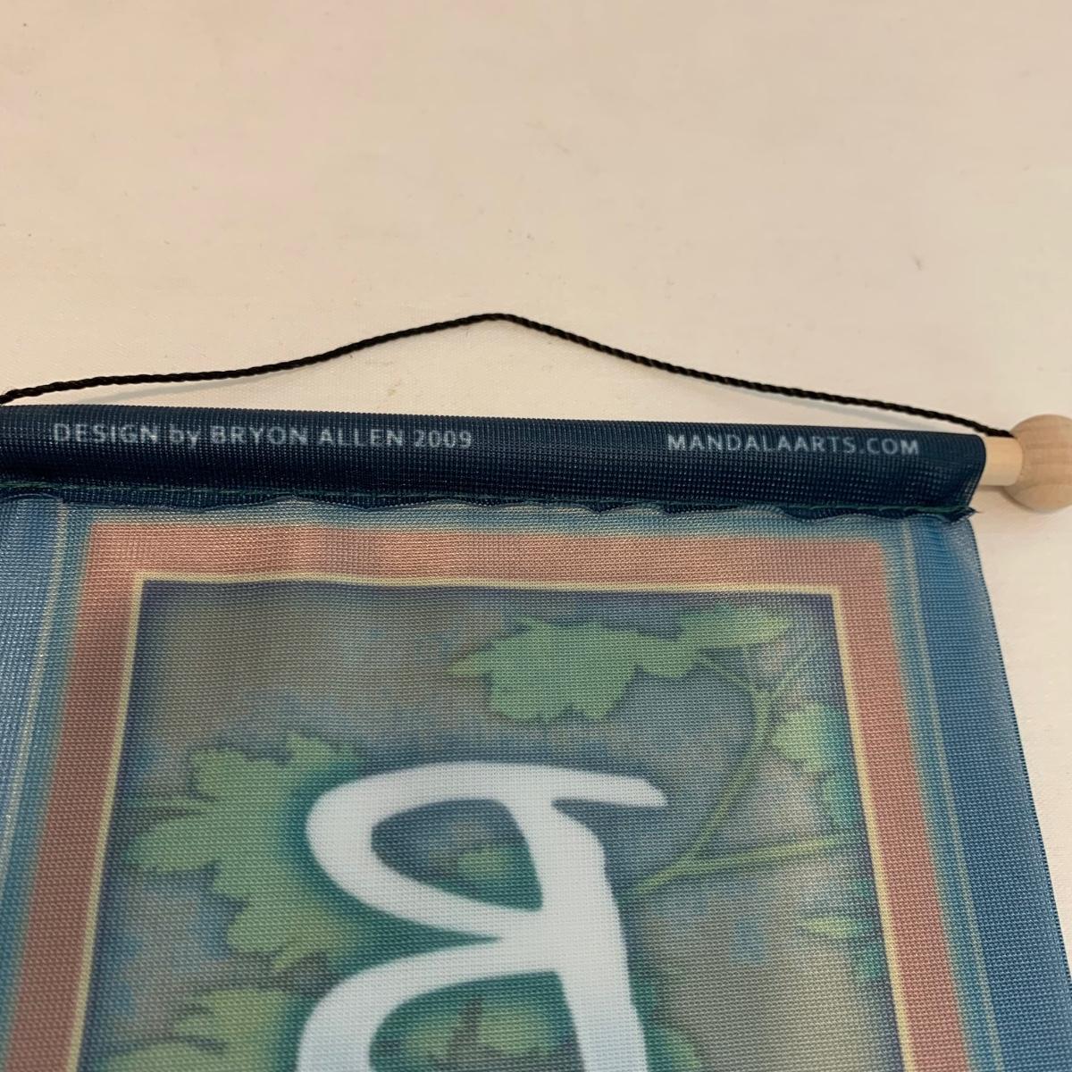 The Breathe and Namaste wall hangings are a piece of cloth that has a nylon feel. They are both on wooden dowels and hang with a string. Namaste is 29.5” x 8”H. These both have the name “˜Bryon Allen’ as the designer. The chakra hanging has metallic thread and metal at the top and bottom.