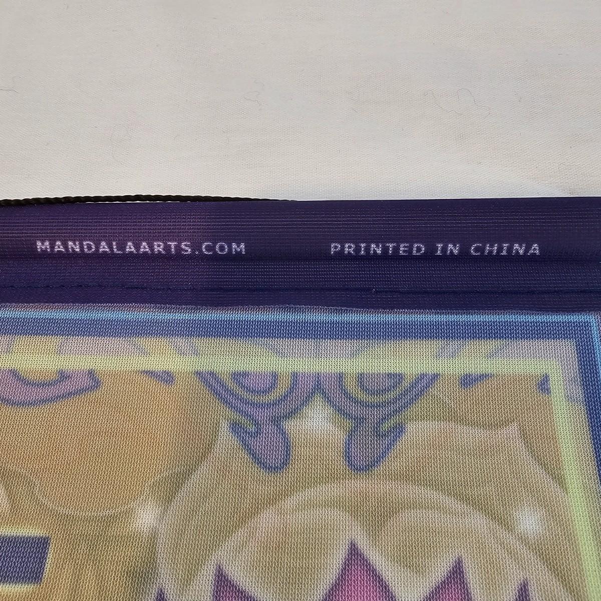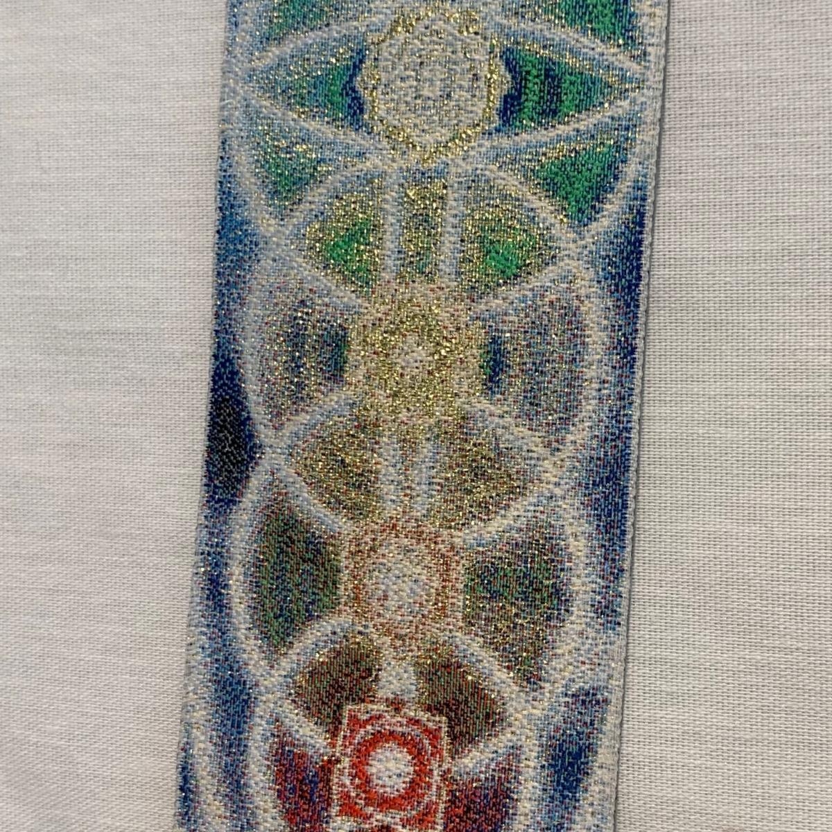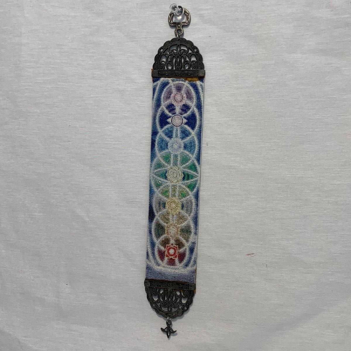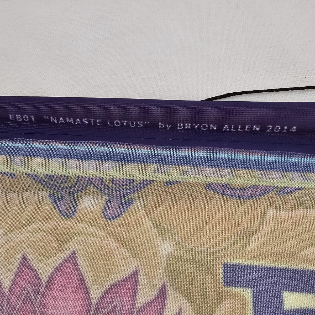 The Breathe and Namaste wall hangings are a piece of cloth that has a nylon feel. They are both on wooden dowels and hang with a string. Namaste is 29.5” x 8”H. These both have the name “˜Bryon Allen’ as the designer. The chakra hanging has metallic thread and metal at the top and bottom.