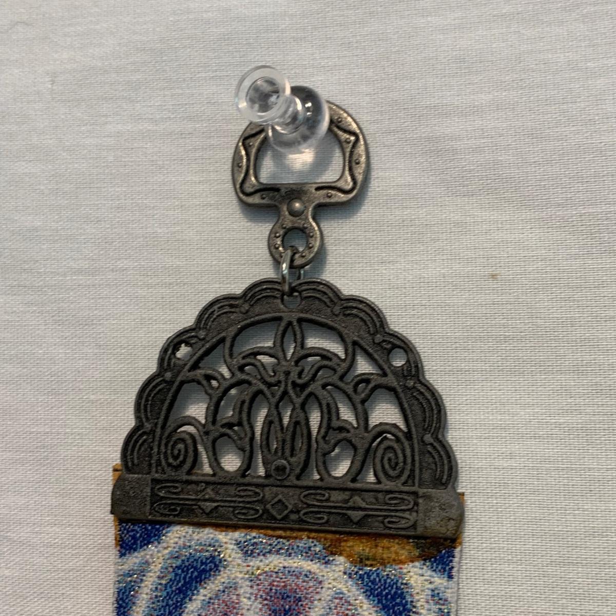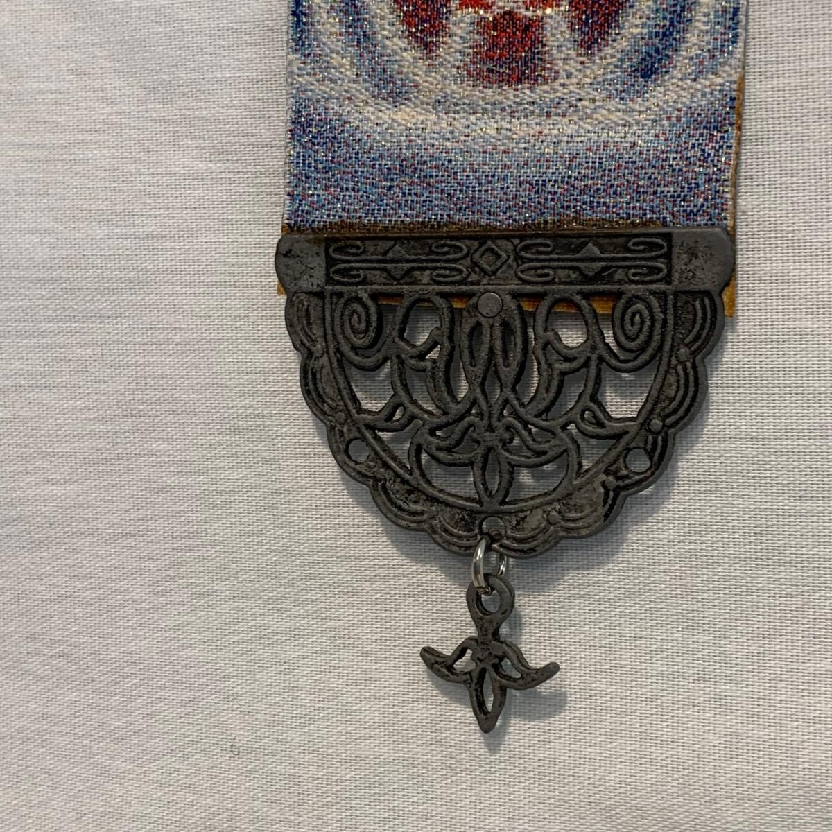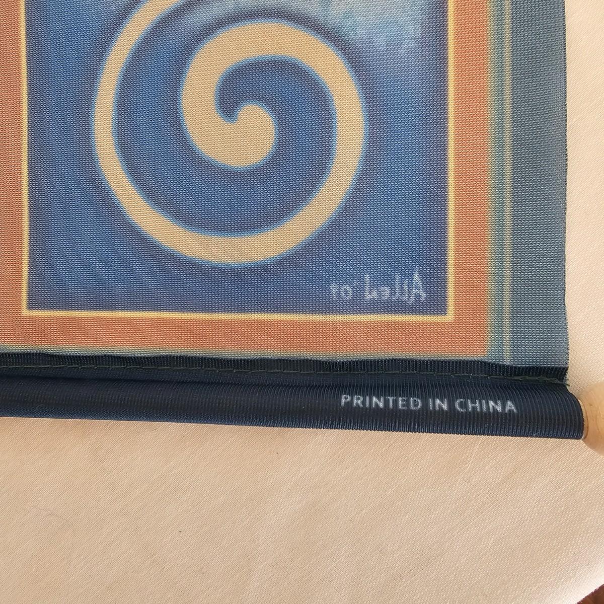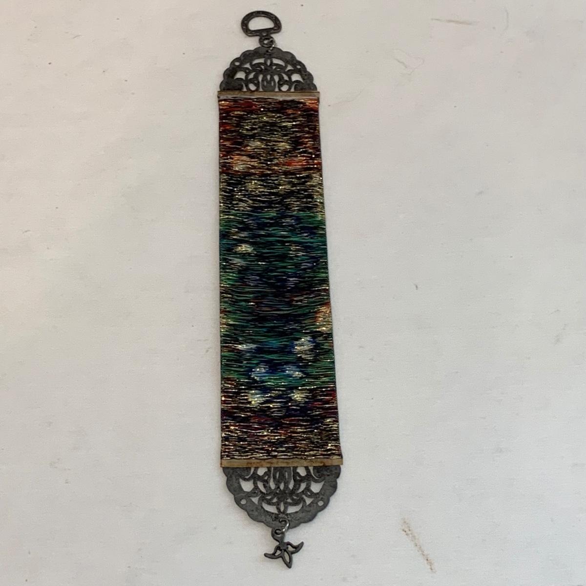 The Breathe and Namaste wall hangings are a piece of cloth that has a nylon feel. They are both on wooden dowels and hang with a string. Namaste is 29.5” x 8”H. These both have the name “˜Bryon Allen’ as the designer. The chakra hanging has metallic thread and metal at the top and bottom.