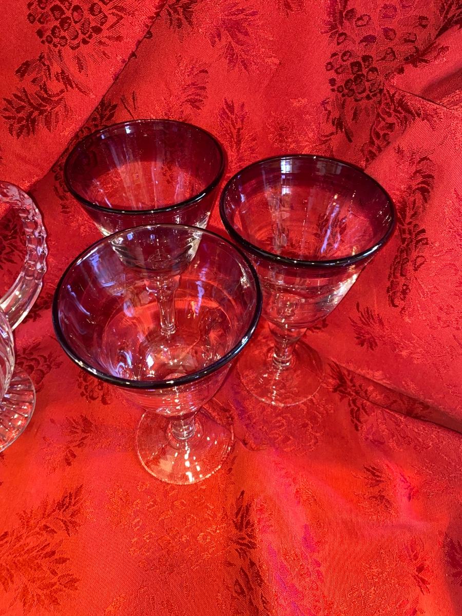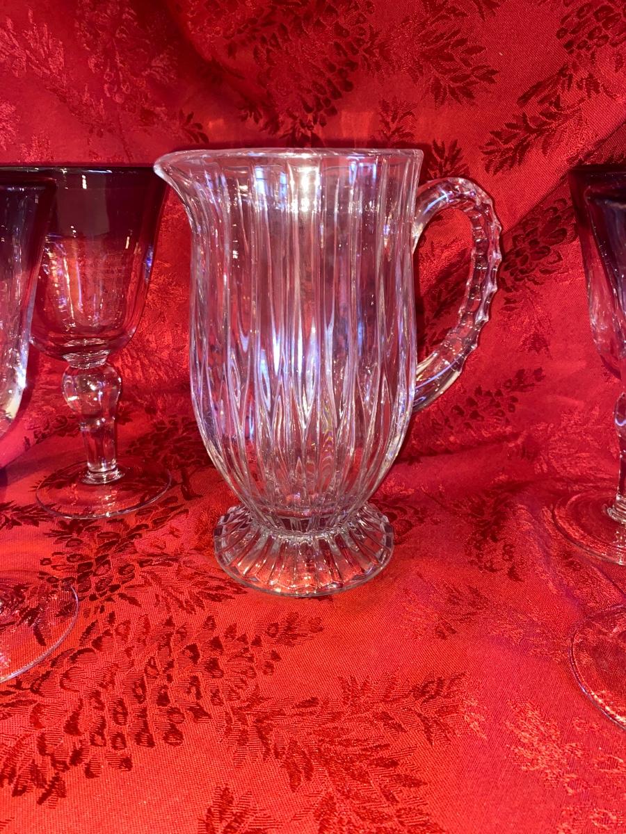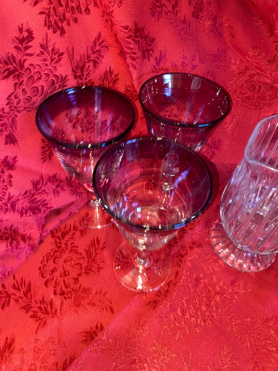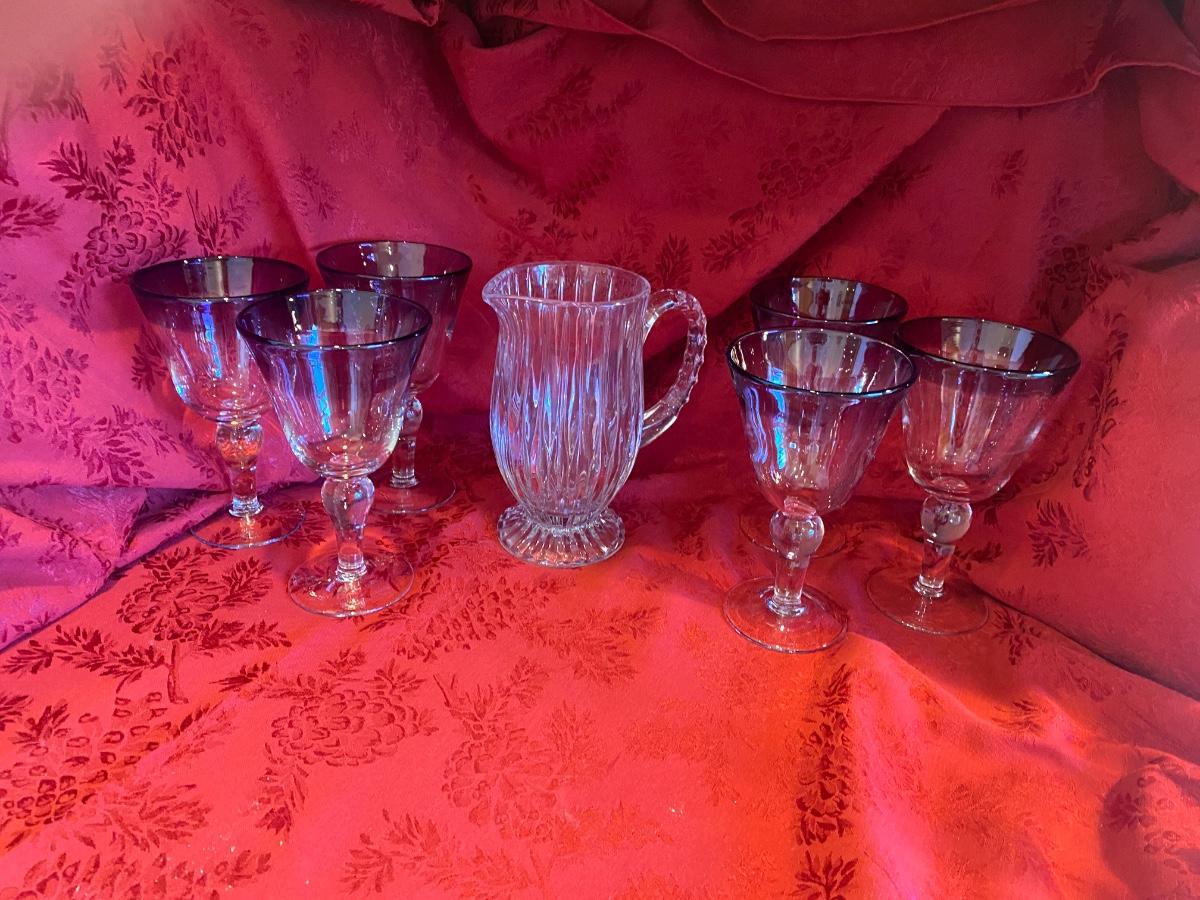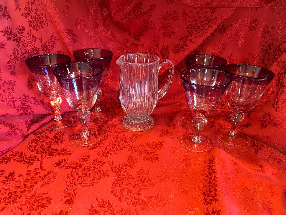 CRYSTAL PITCHER AND LARGE GLASS STEMMED GLASSES WITH PURPLE RIM