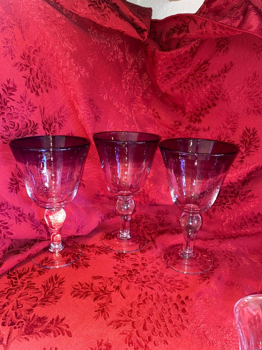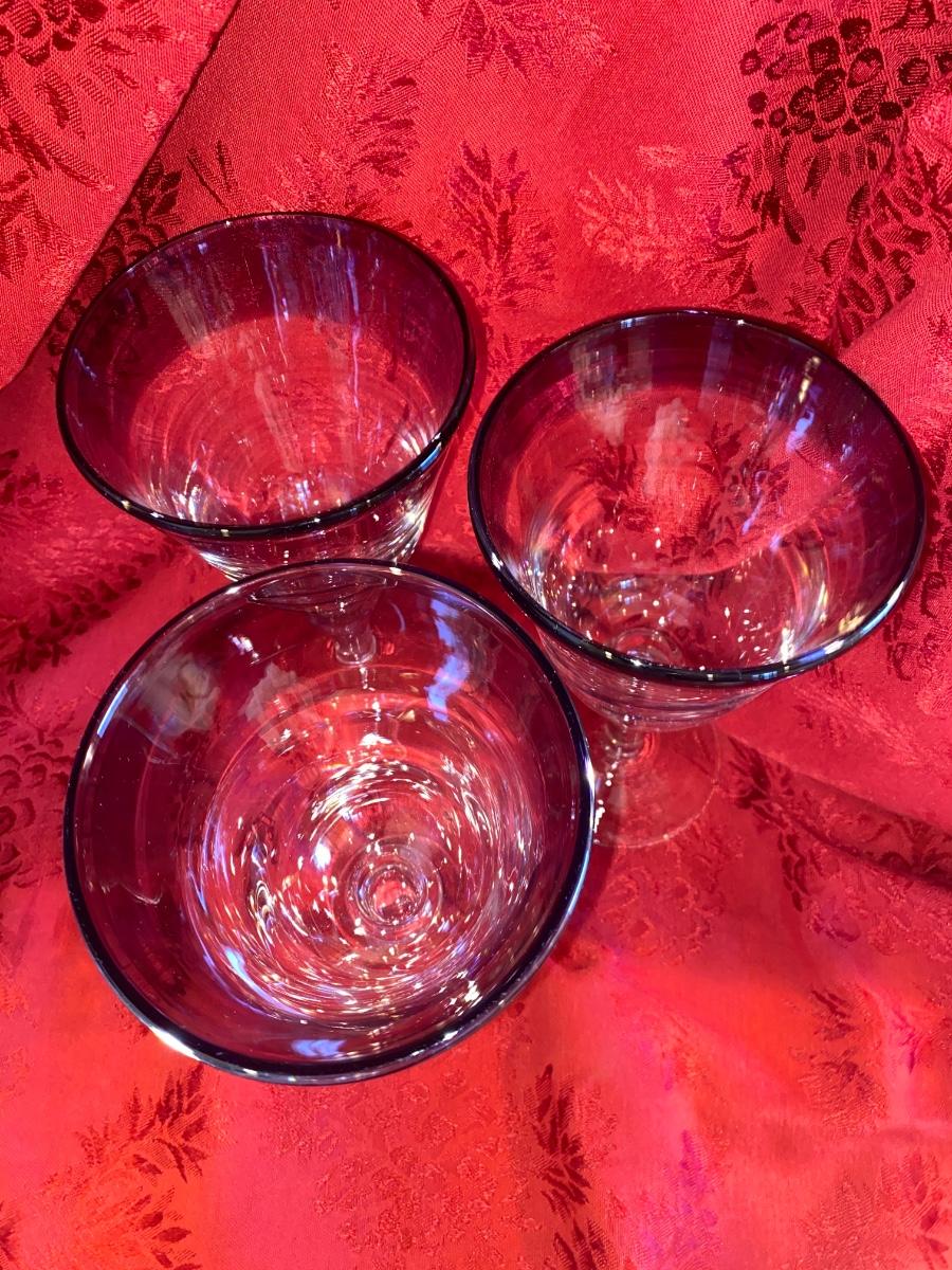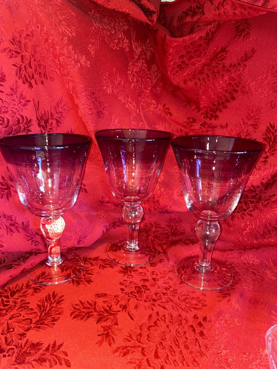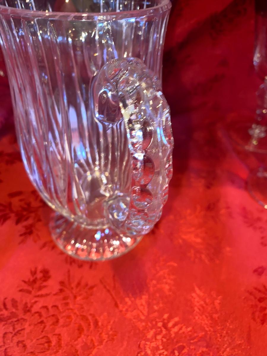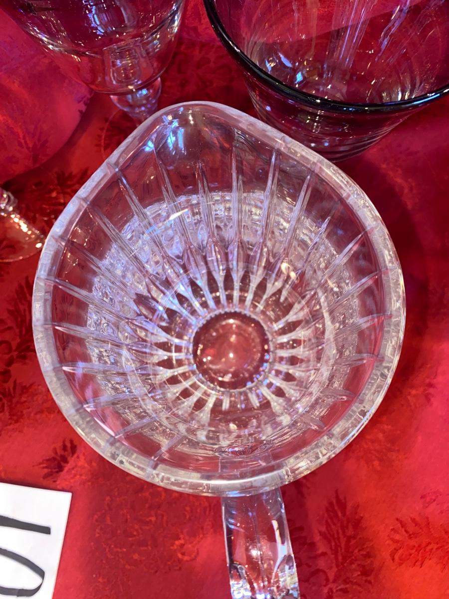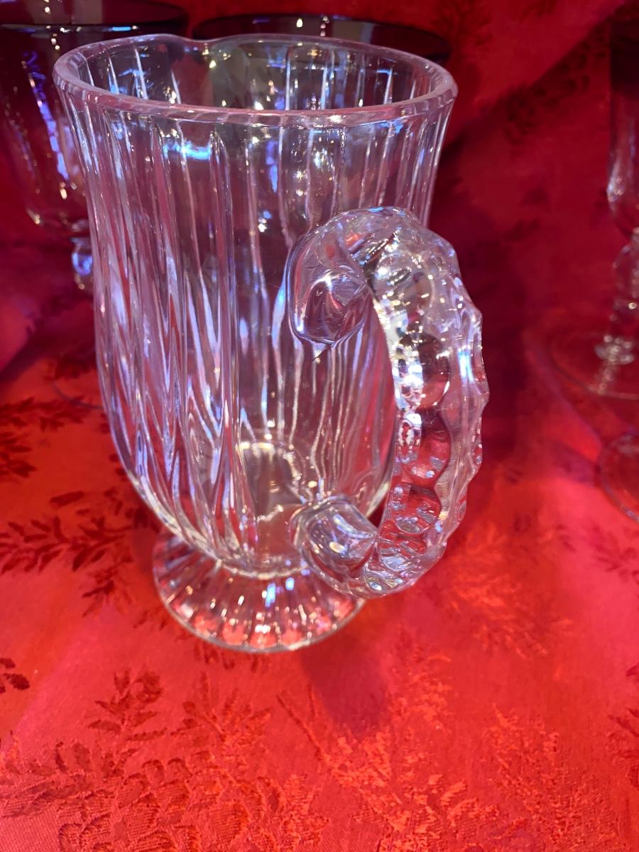 CRYSTAL PITCHER AND LARGE GLASS STEMMED GLASSES WITH PURPLE RIM