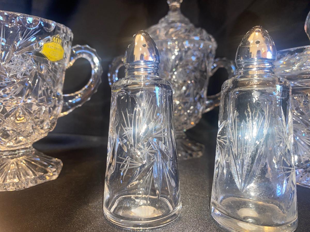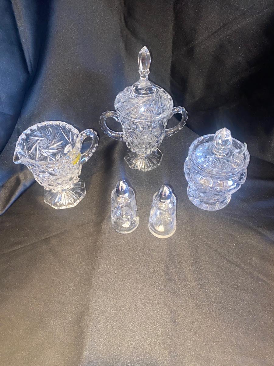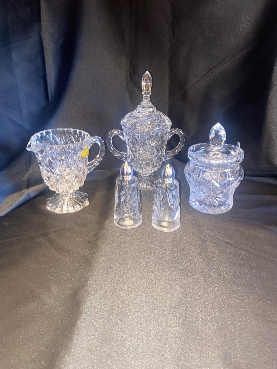 BREATHTAKING VTG LEAD CRYSTAL SALT AND PEPPER, SHAKERS, CREAMER AND SUGAR BOWL