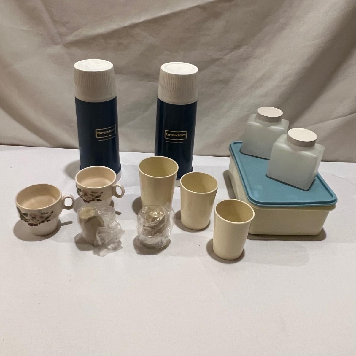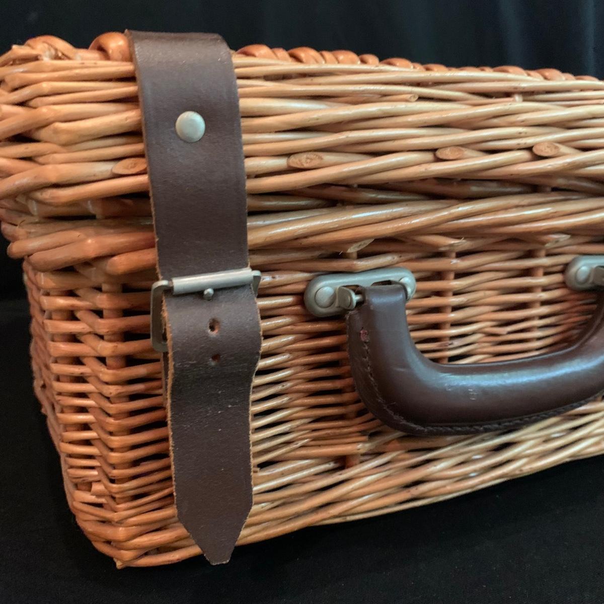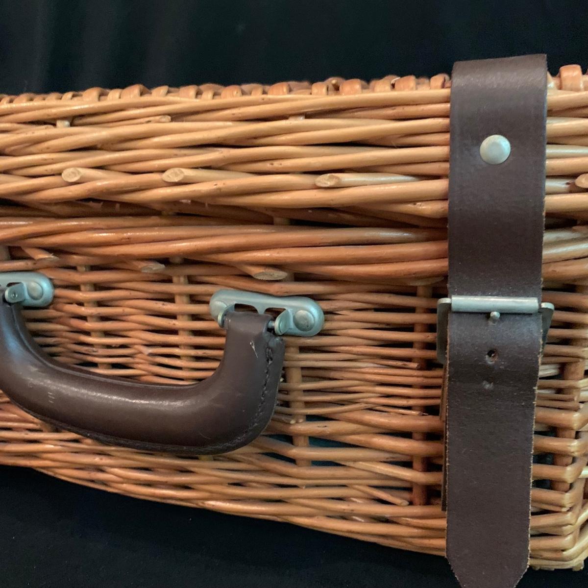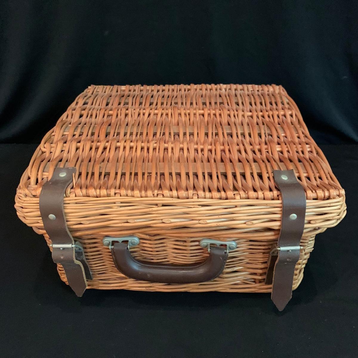 Lovely 15” x 15” x 6”H picnic basket for two! Two coffee cups and two 6” saucers. Also two 8” plates, three nesting drinking cups and two thermoses This set includes a salt and pepper shaker, two spoons, forks and knives as well as a Tupperware-like storage container for the main meal.