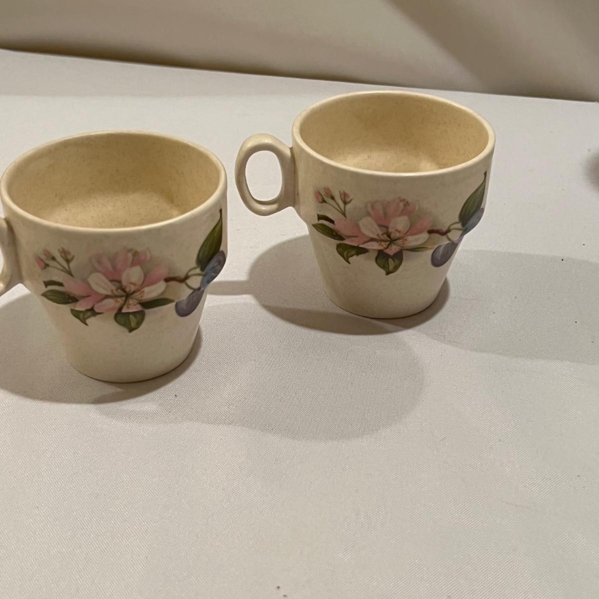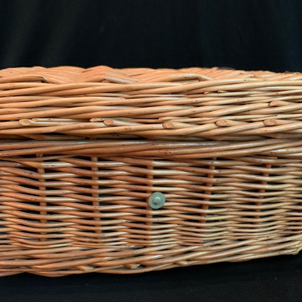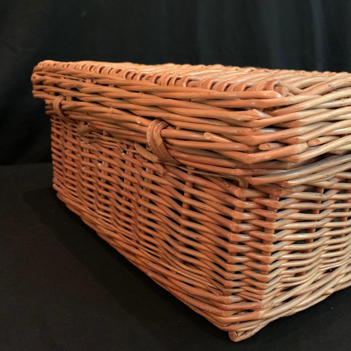 Lovely 15” x 15” x 6”H picnic basket for two! Two coffee cups and two 6” saucers. Also two 8” plates, three nesting drinking cups and two thermoses This set includes a salt and pepper shaker, two spoons, forks and knives as well as a Tupperware-like storage container for the main meal.
