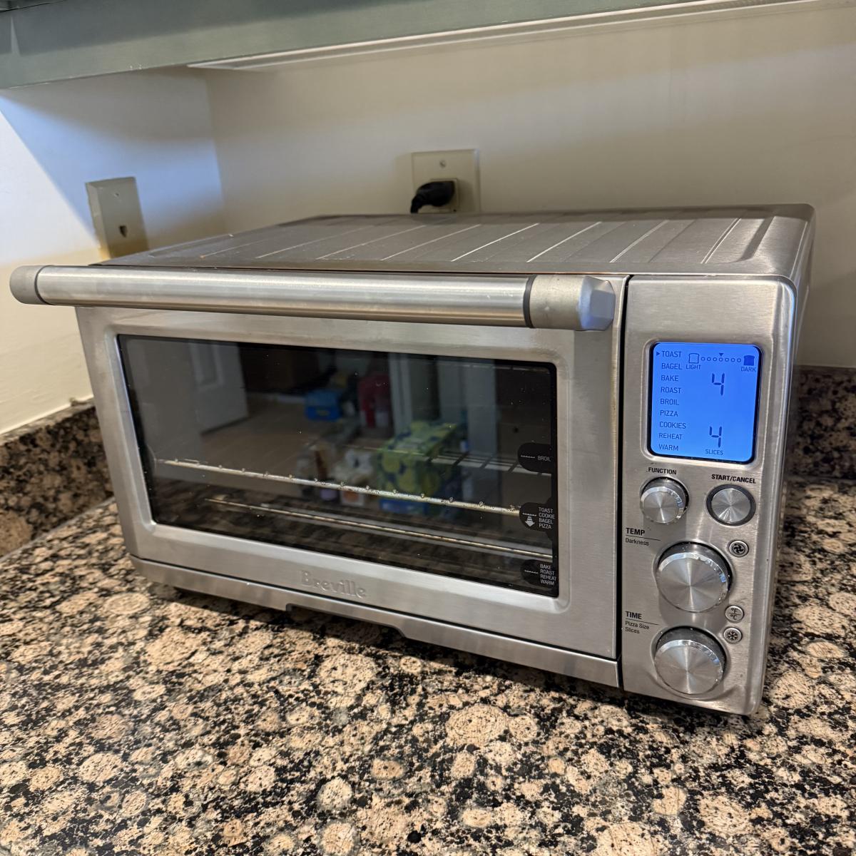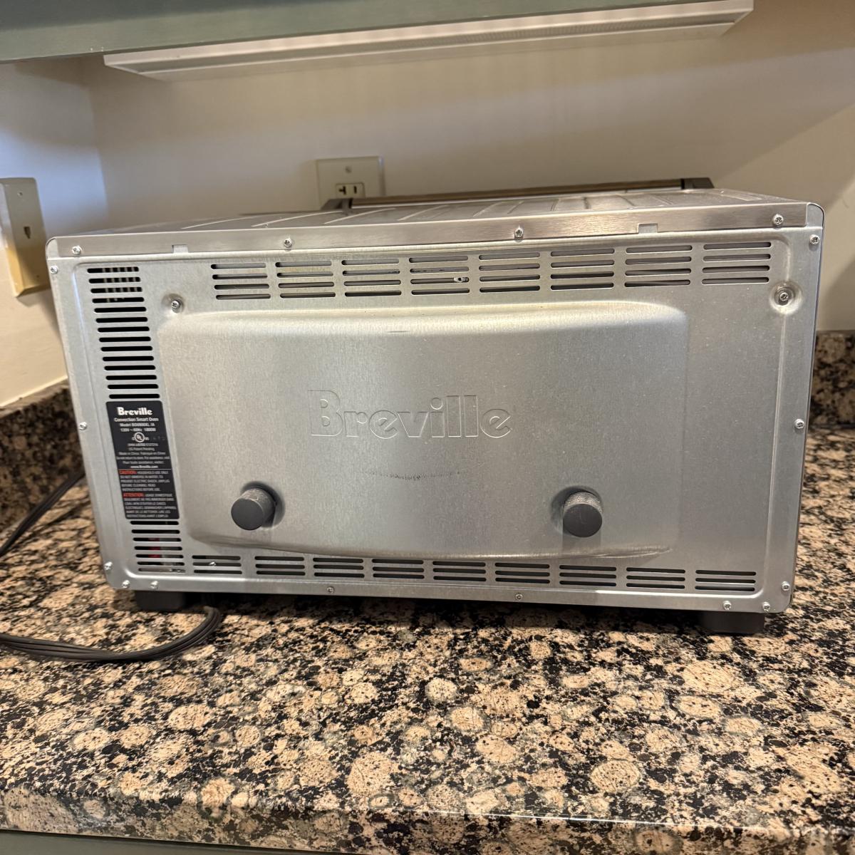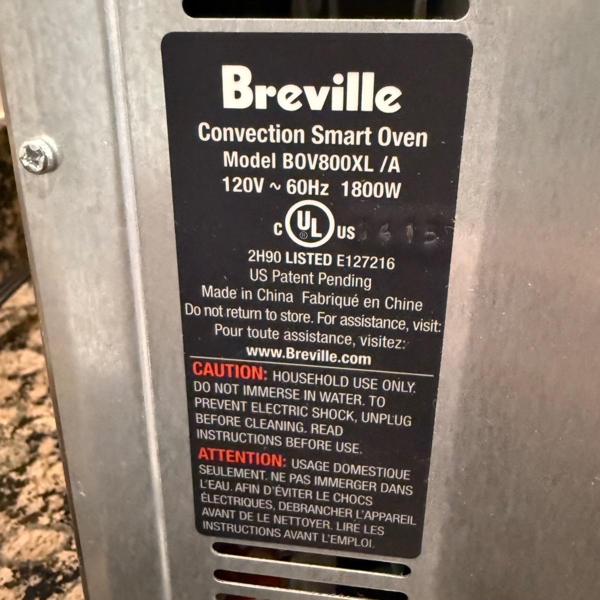 Breville Smart Oven comes with pan accessories and its instruction book. Oven powered on when plugged in. It measures 18.5” x 13.5” x 11”H. It has been used and shows signs of use. The baking pan has some sticky residue that seems like it will clean off with a very good scrubbing.