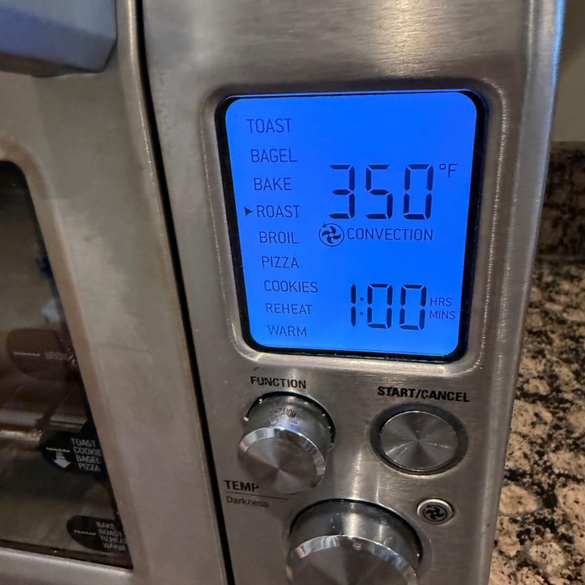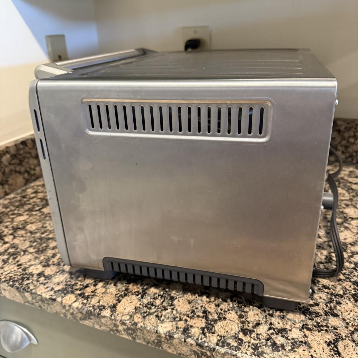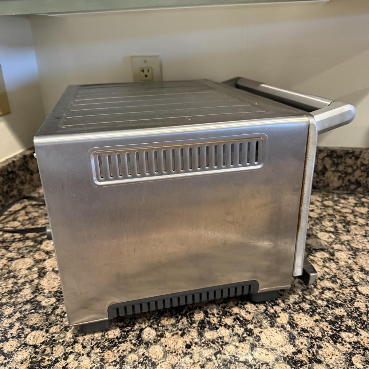 Breville Smart Oven comes with pan accessories and its instruction book. Oven powered on when plugged in. It measures 18.5” x 13.5” x 11”H. It has been used and shows signs of use. The baking pan has some sticky residue that seems like it will clean off with a very good scrubbing.