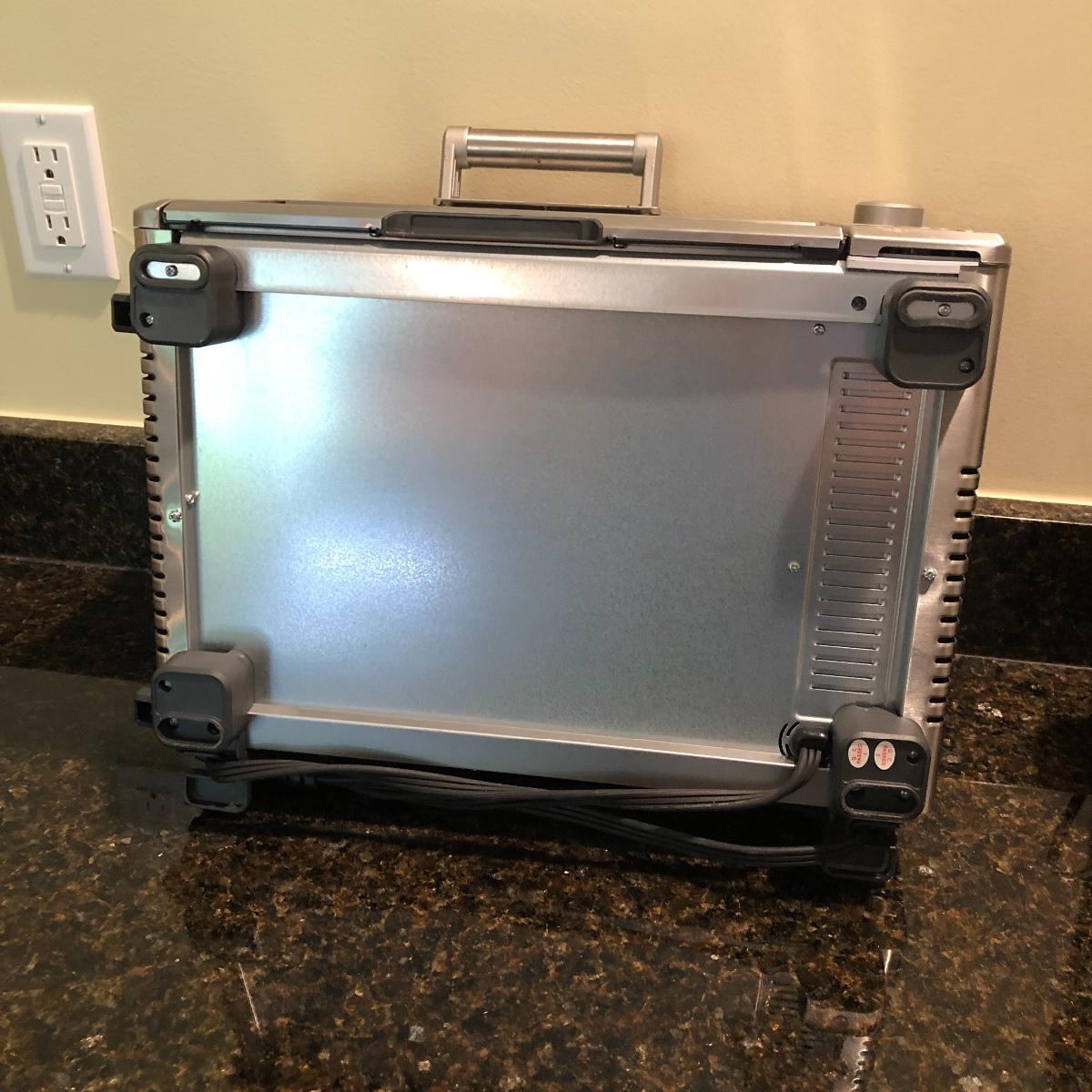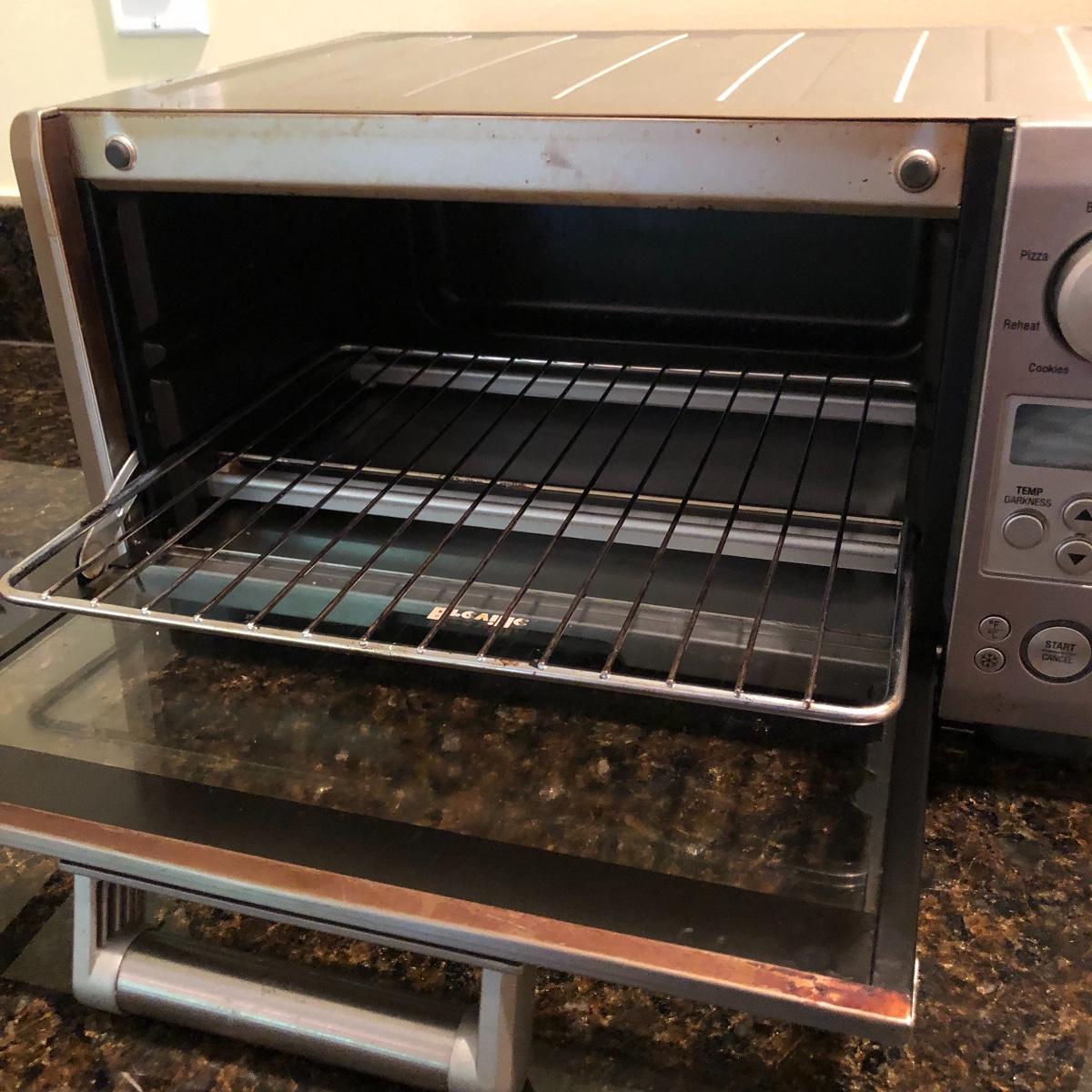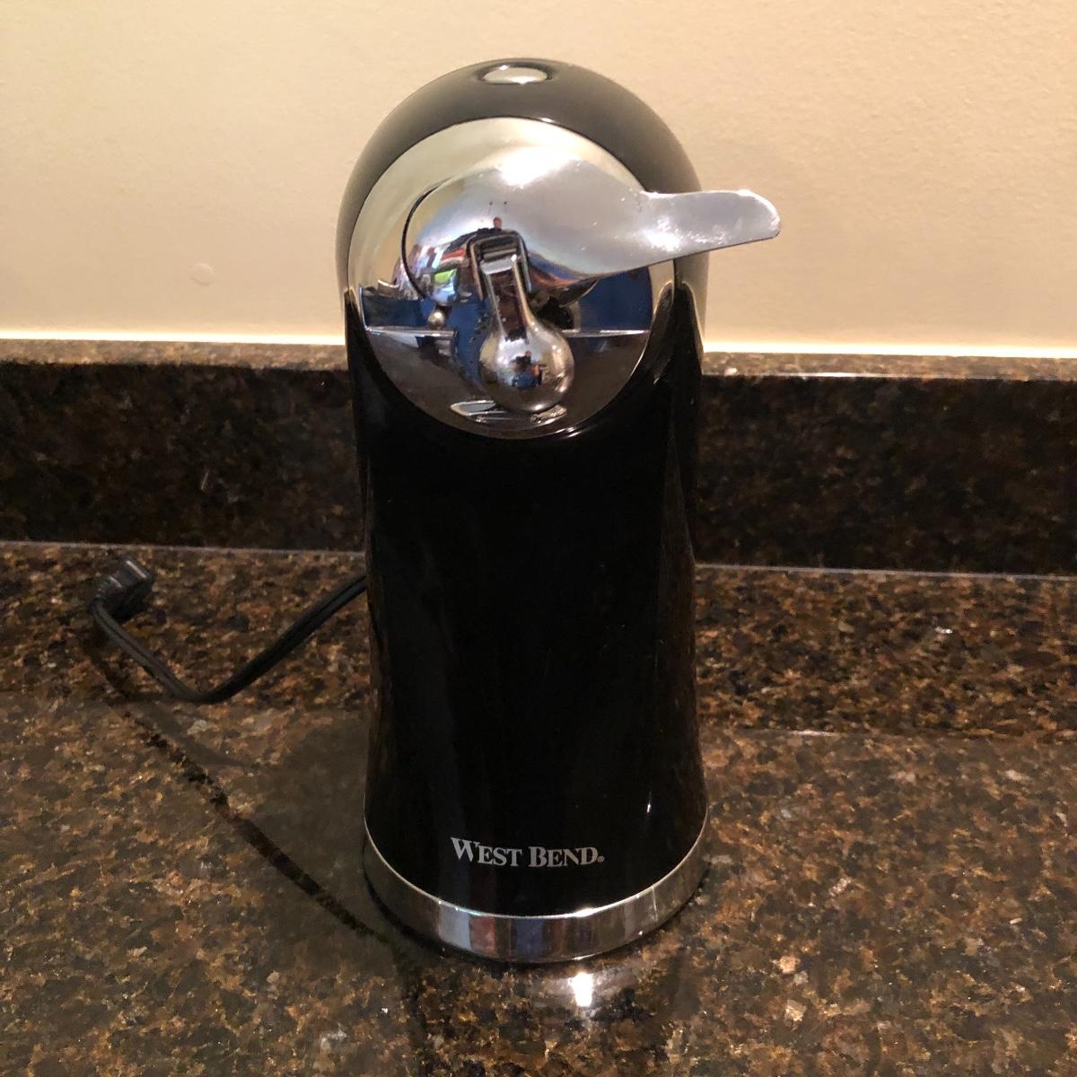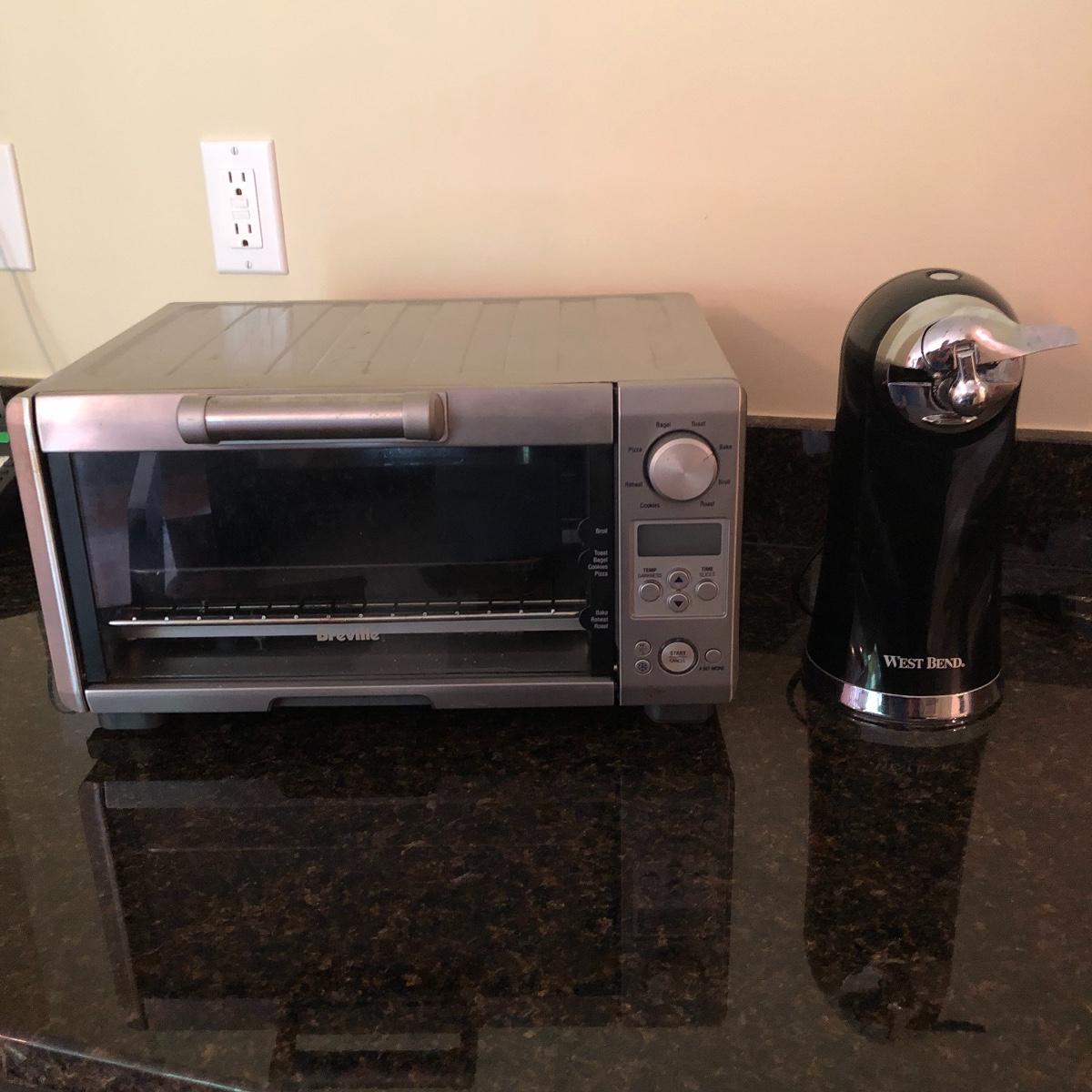 This lot contains one Breville toaster oven and one West Bend can opener. Both operated when plugged in and both are clean. The toaster oven measures 15.5” x 8.5” x 10.5”. The electric can opener is 10.5” tall. Local pick up only.