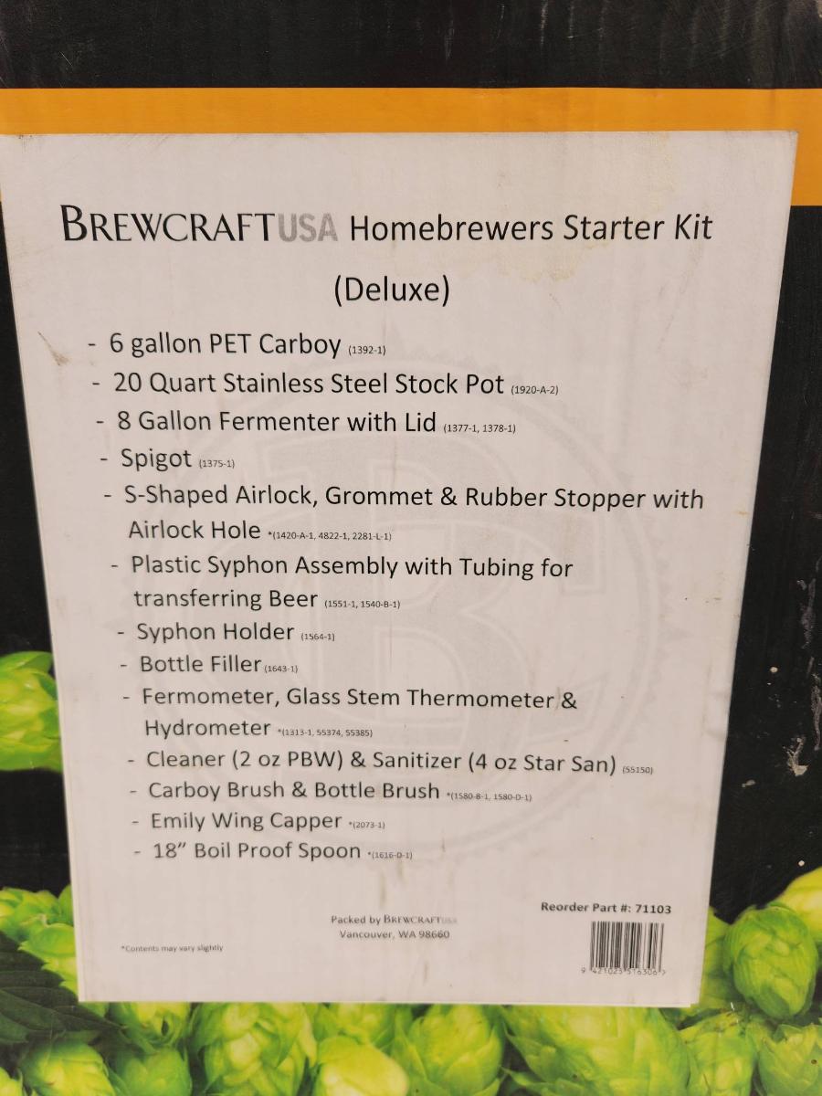 Brewcraft USA Deluxe Homebrewers Starter Kit includes a 6-gallon PET carboy, 20 qt stainless steel stock pot, 8-gallon fermenter with lid, spigot, s-shaped airlock, grommet, rubber stopper with airlock hole, syphon assembly, glass stem thermometer, hydrometer, cleaner, sanitizer, and other accessories. Ideal for homebrewing projects.