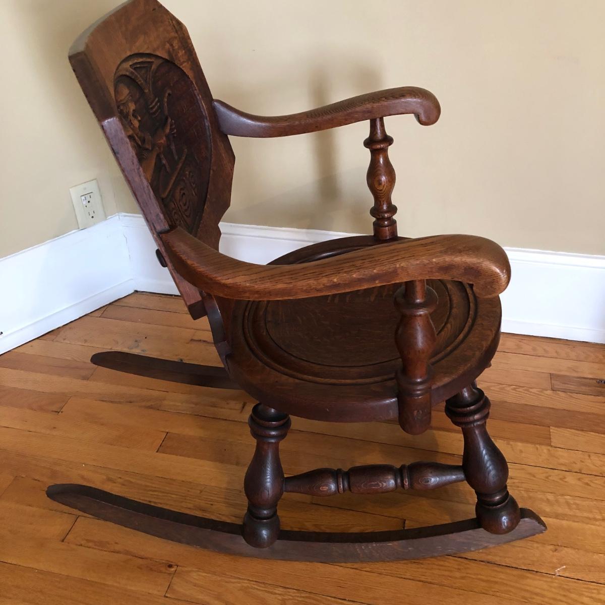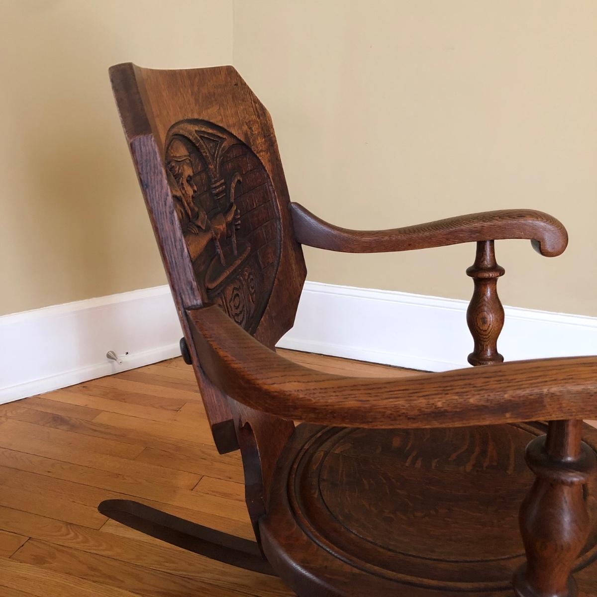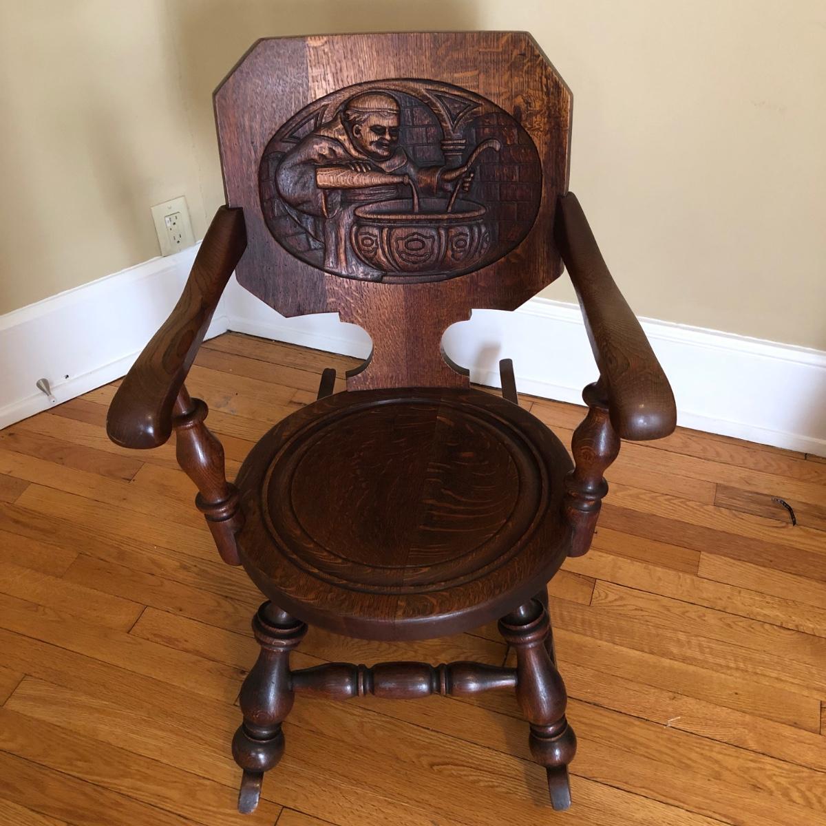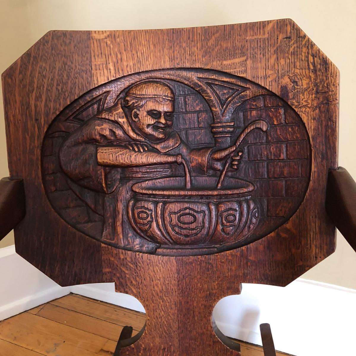 This rocking chair is solid wood; appears to be oak. The back of the rocker has a monk stirring a large pot. This unique chair measures over 22.5” x 34” (rockers) x 33”. The height of the seat is 15.5”. Note the carved seat and seam in the seat. Local pick up only.