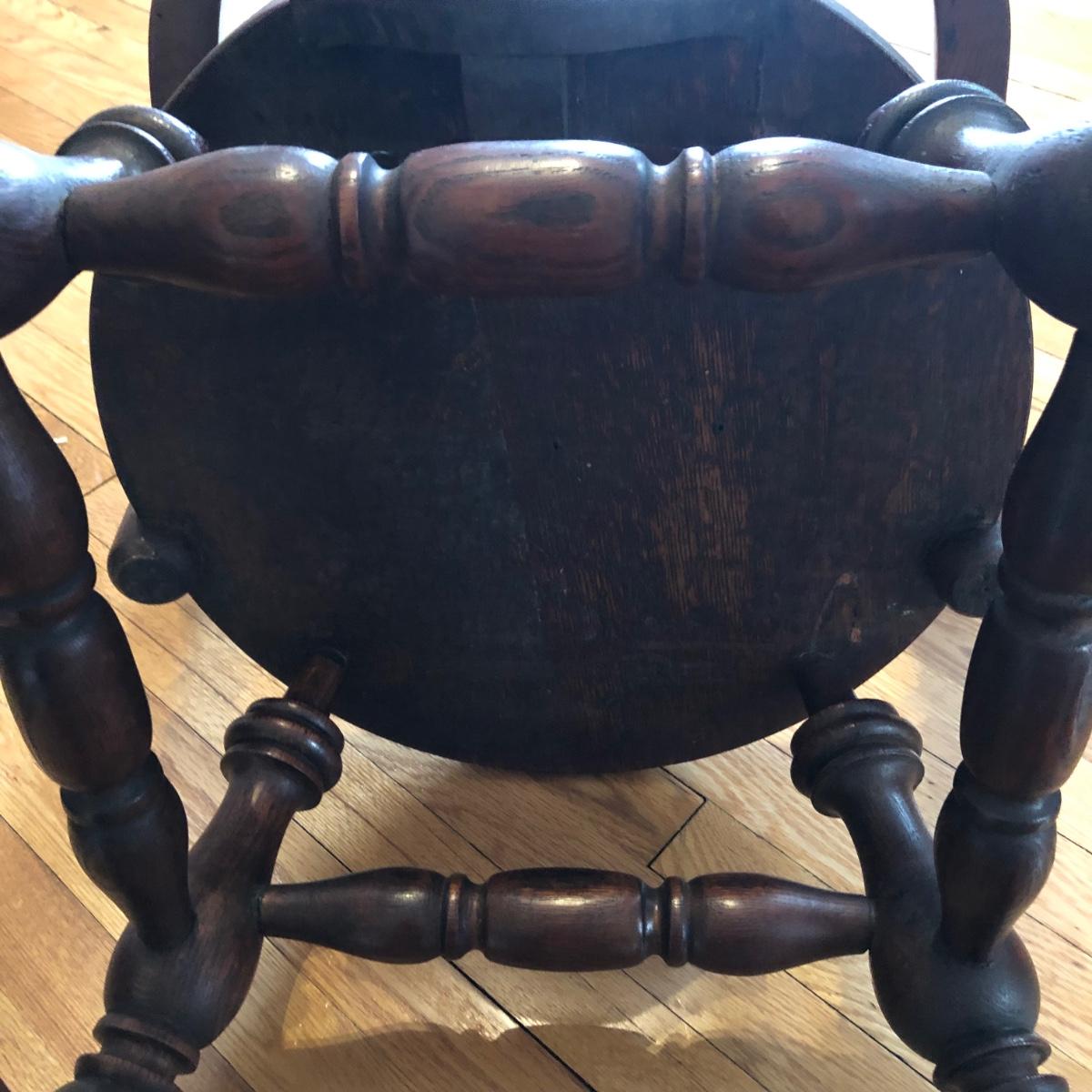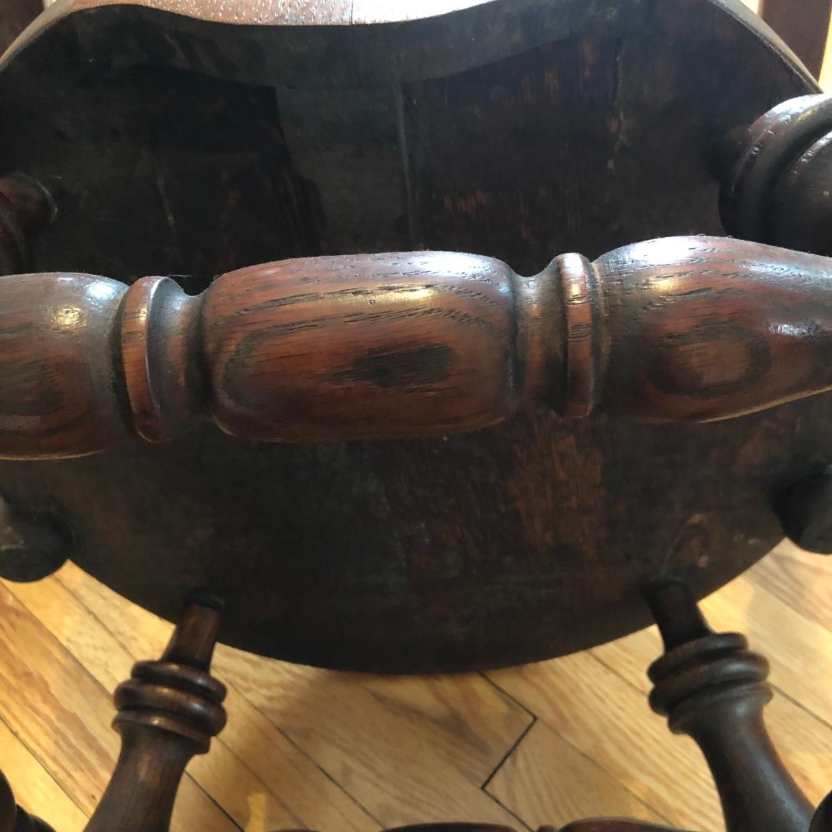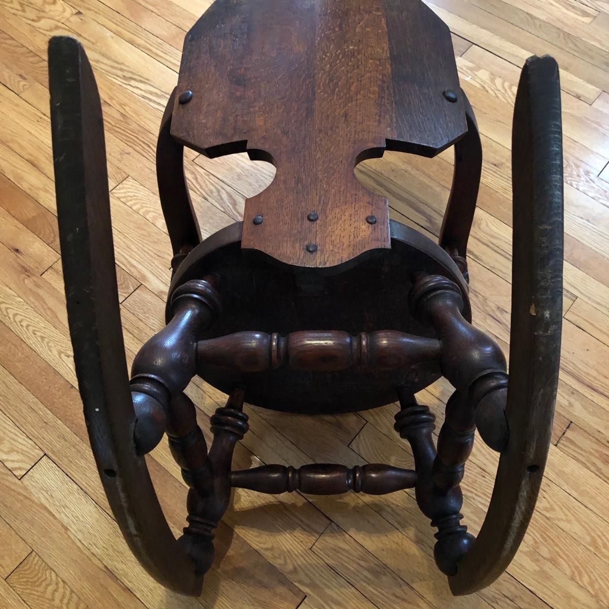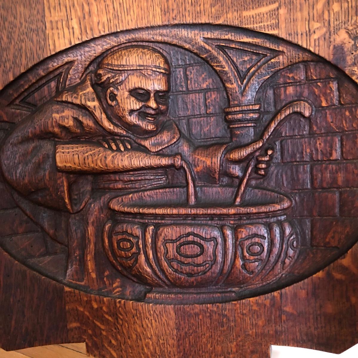 This rocking chair is solid wood; appears to be oak. The back of the rocker has a monk stirring a large pot. This unique chair measures over 22.5” x 34” (rockers) x 33”. The height of the seat is 15.5”. Note the carved seat and seam in the seat. Local pick up only.