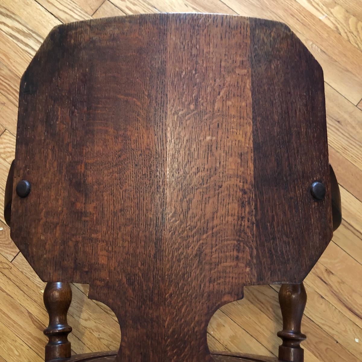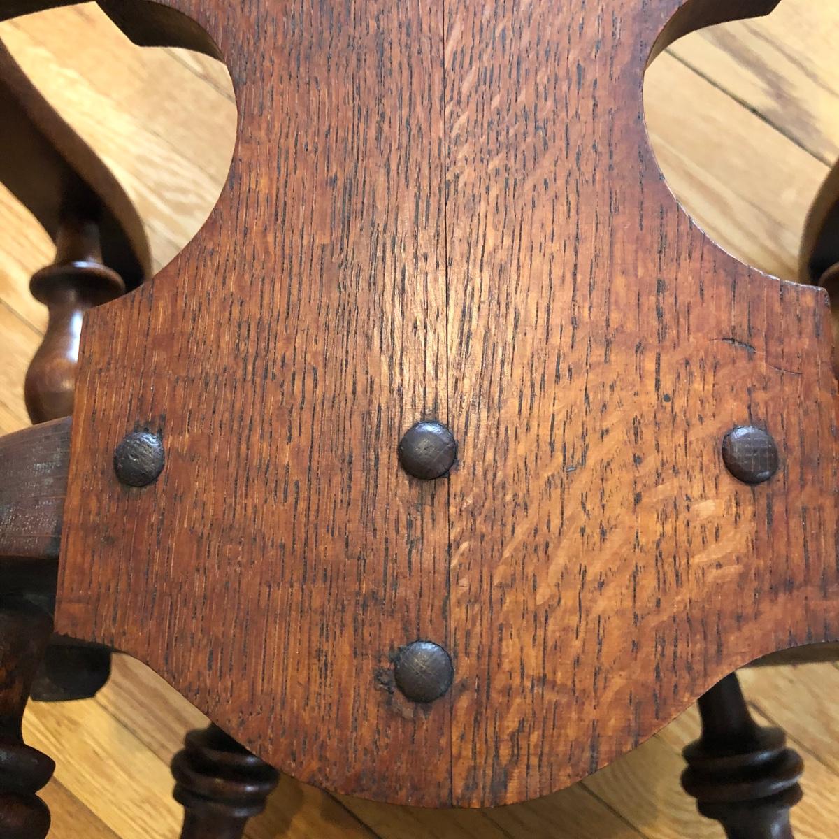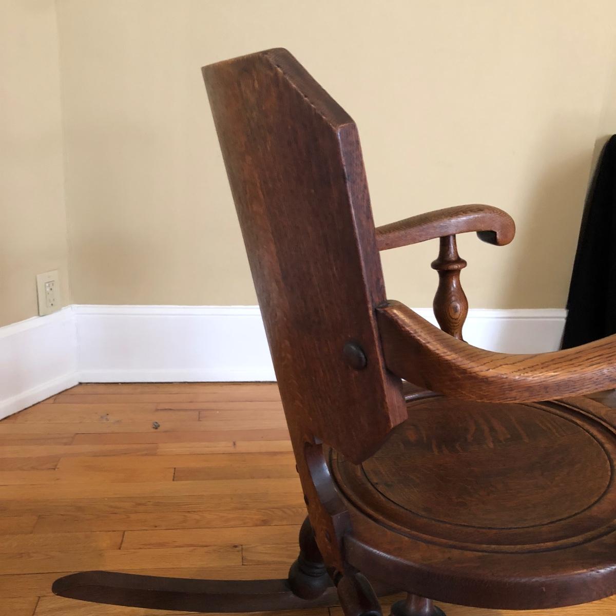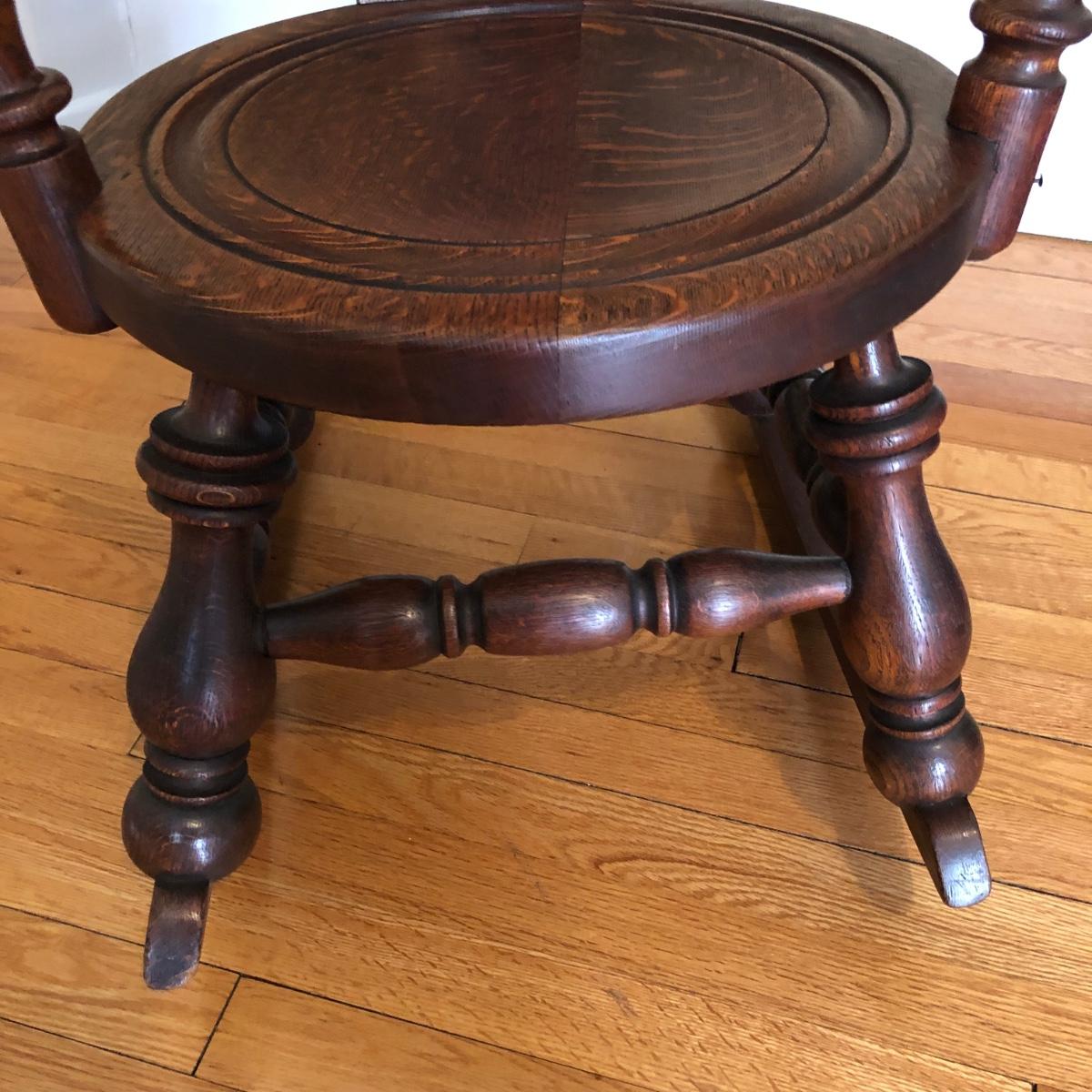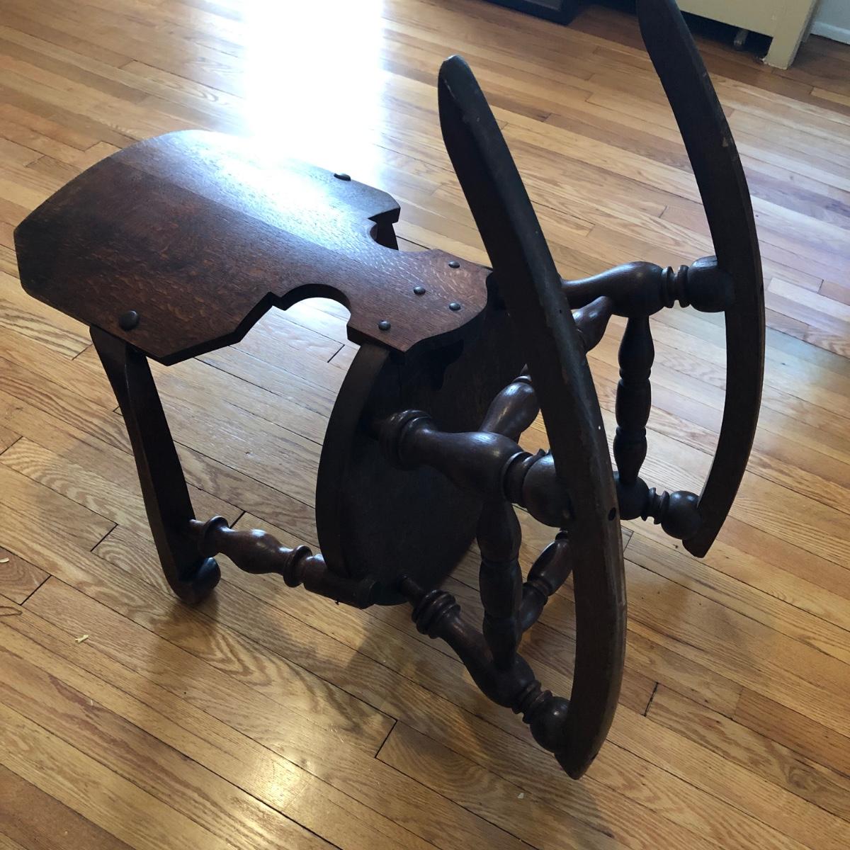 This rocking chair is solid wood; appears to be oak. The back of the rocker has a monk stirring a large pot. This unique chair measures over 22.5” x 34” (rockers) x 33”. The height of the seat is 15.5”. Note the carved seat and seam in the seat. Local pick up only.
