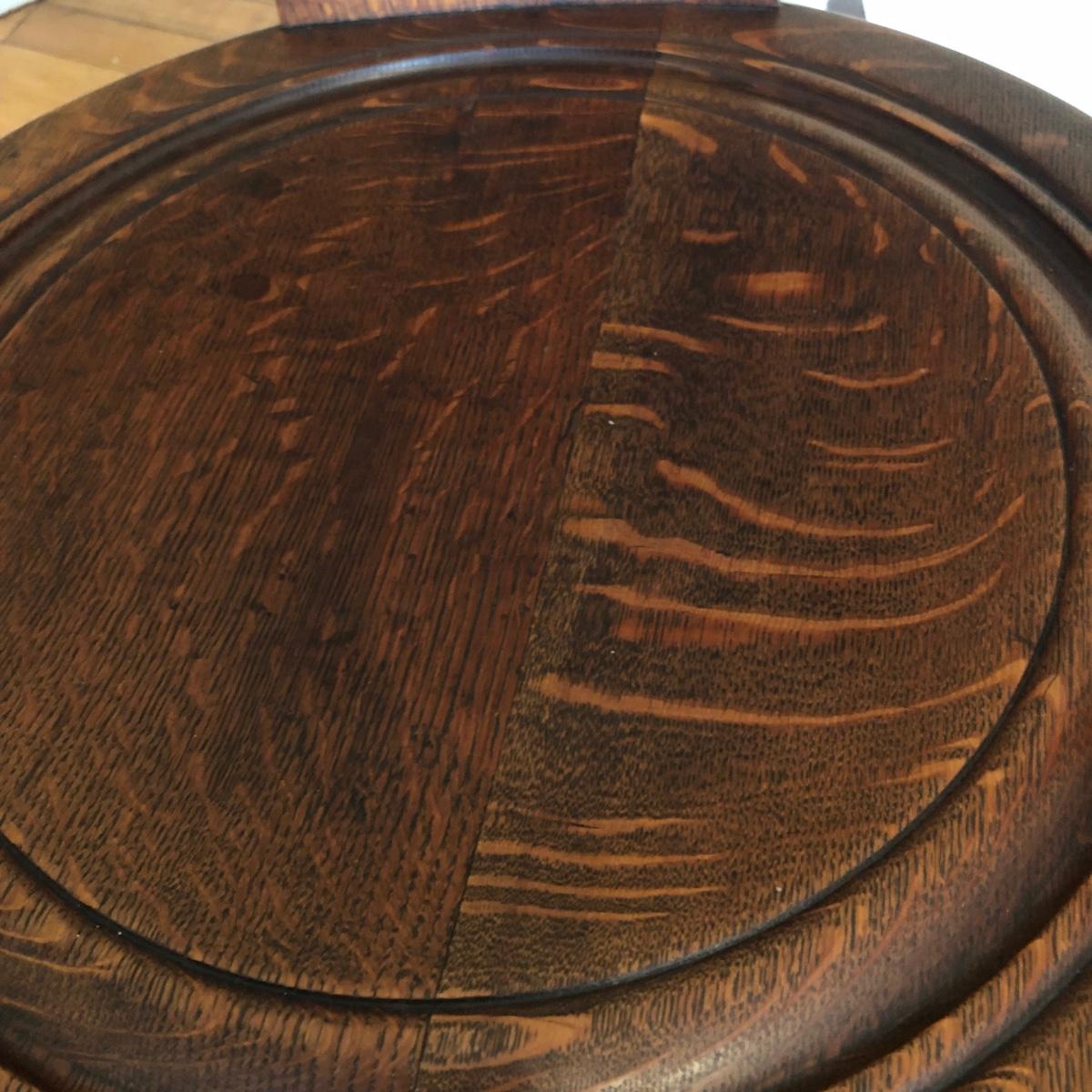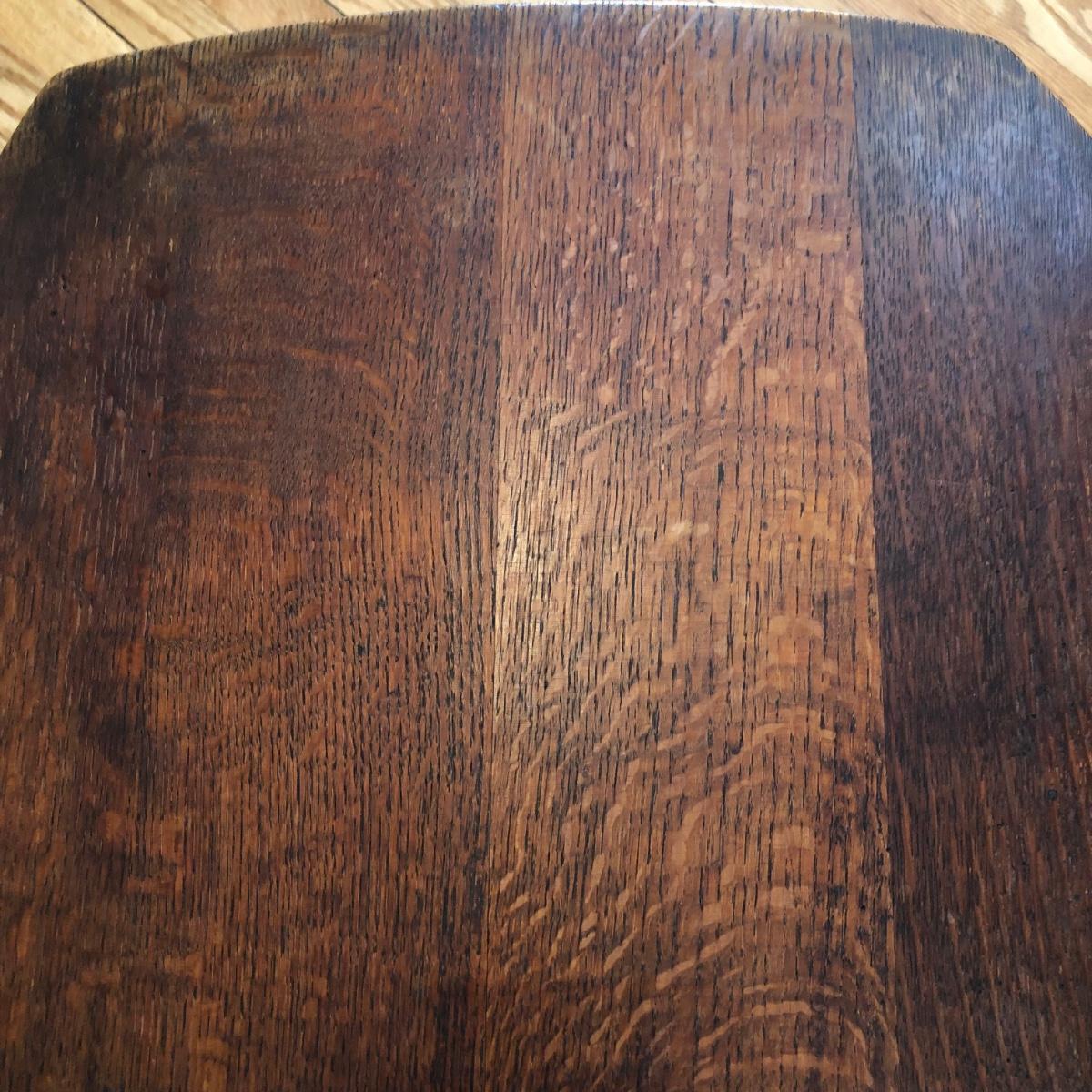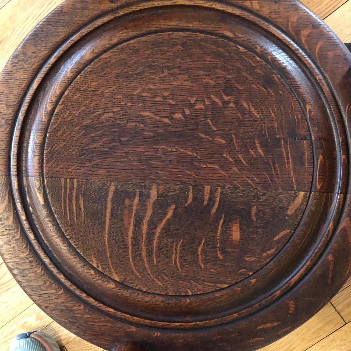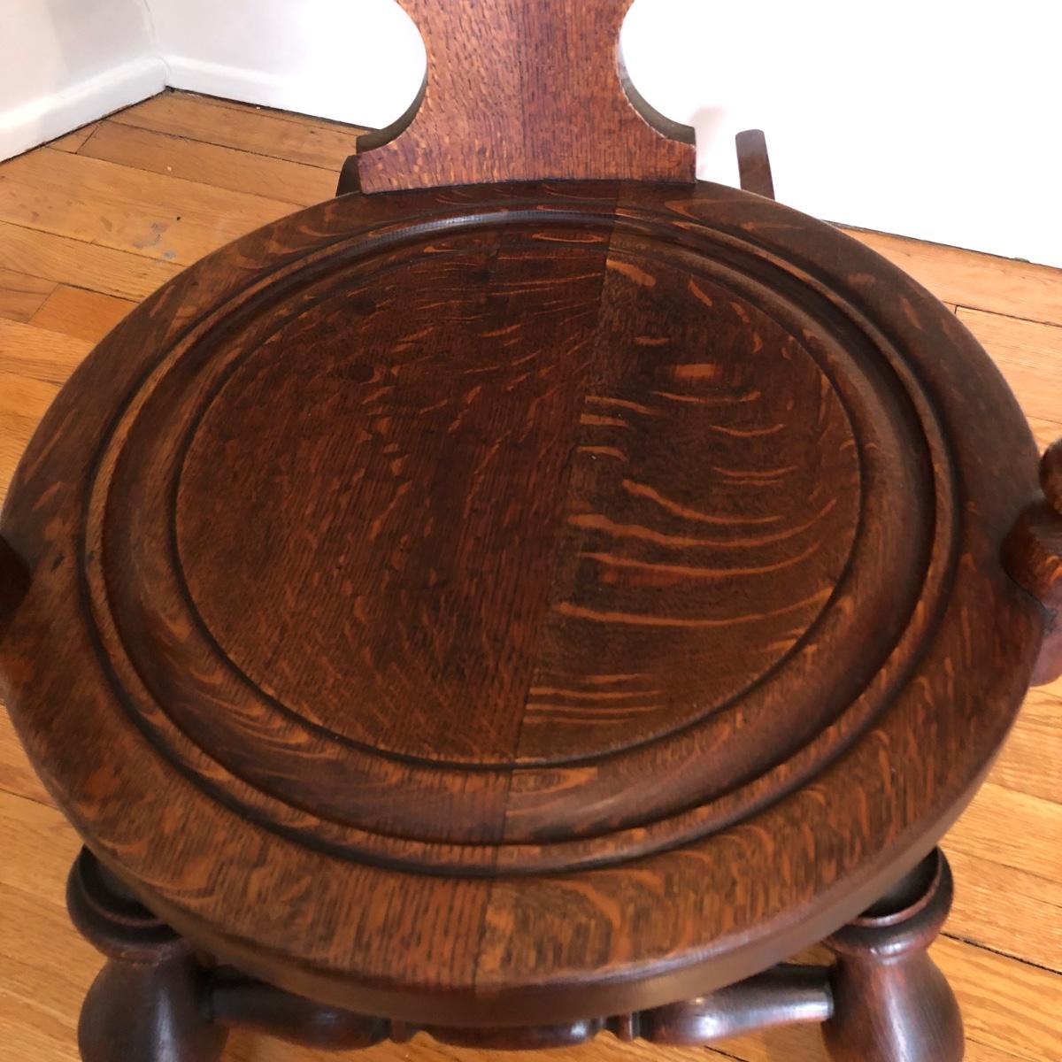 This rocking chair is solid wood; appears to be oak. The back of the rocker has a monk stirring a large pot. This unique chair measures over 22.5” x 34” (rockers) x 33”. The height of the seat is 15.5”. Note the carved seat and seam in the seat. Local pick up only.