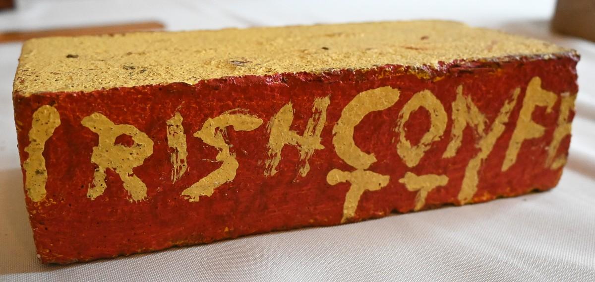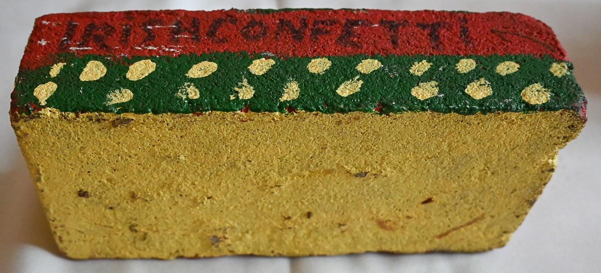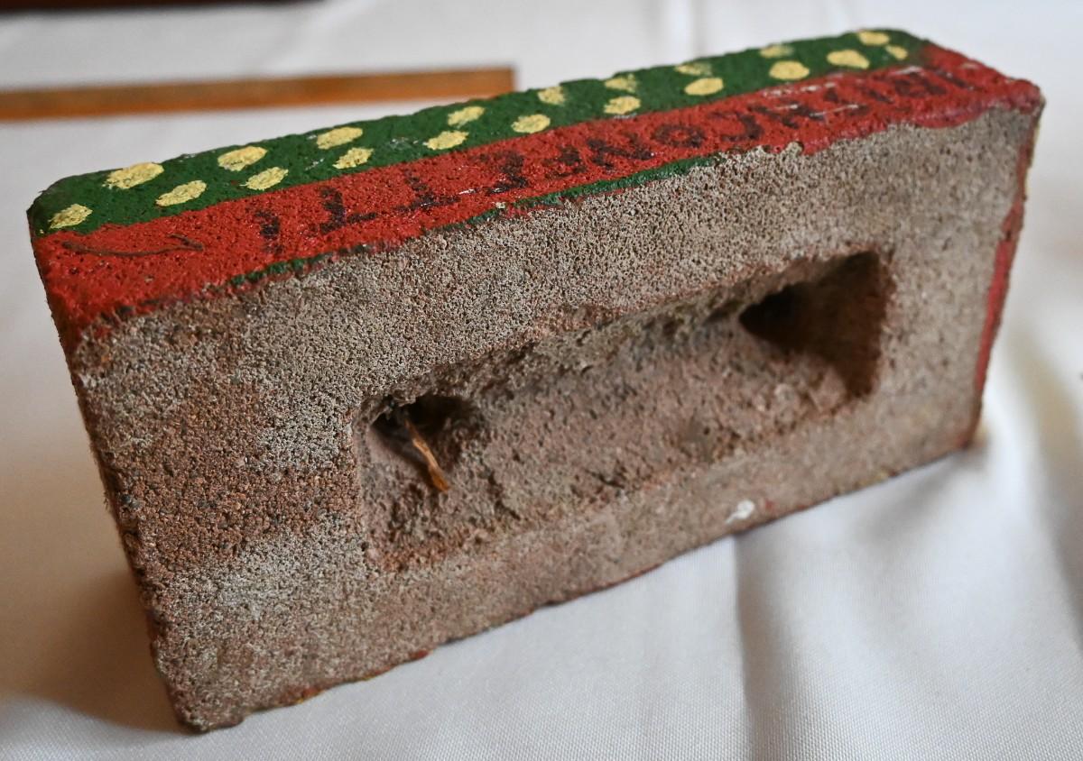 A painted brick by Michigan artist Albert “‹“Kid” Mertz. Mixed media. Approx. 2.5" x 8" x 4".