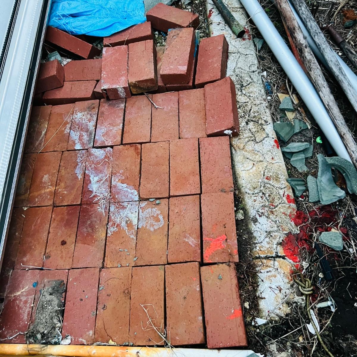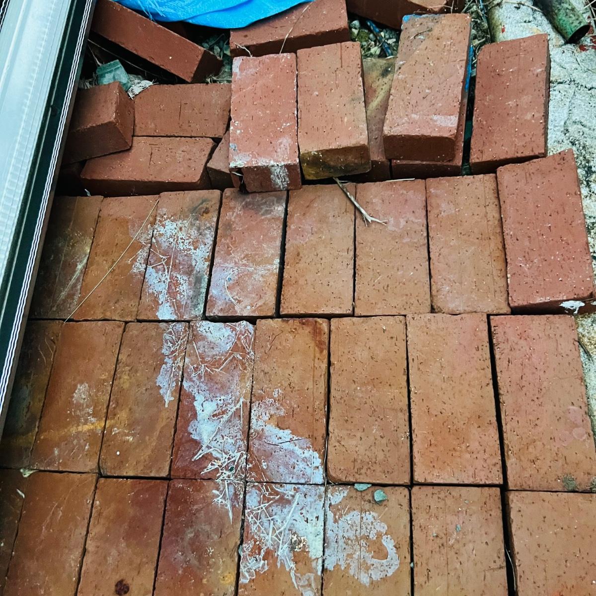 Lot includes over 30 red 8”L x 4”W bricks and many white, scalloped 16”L x 2”W x 6”H edging stones.