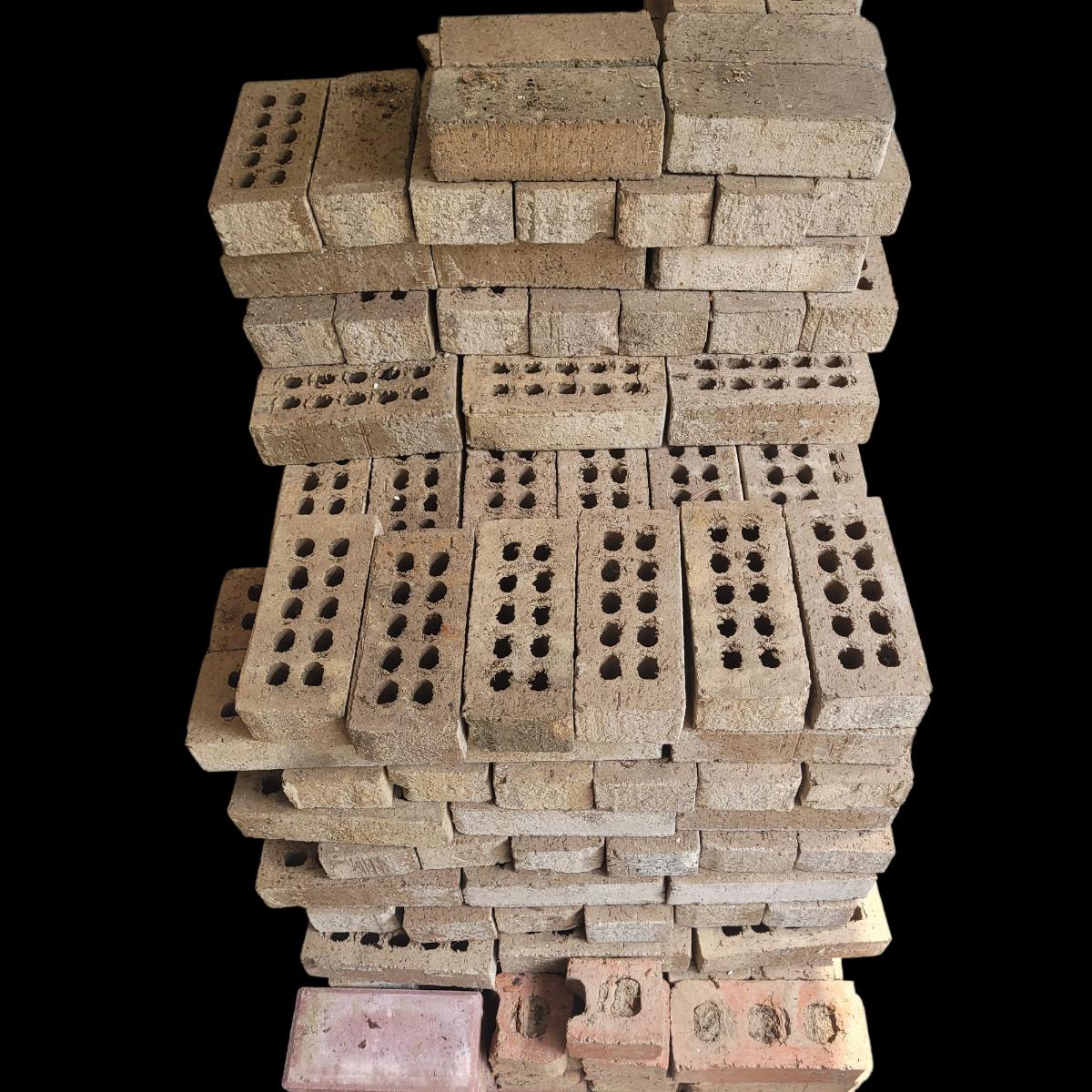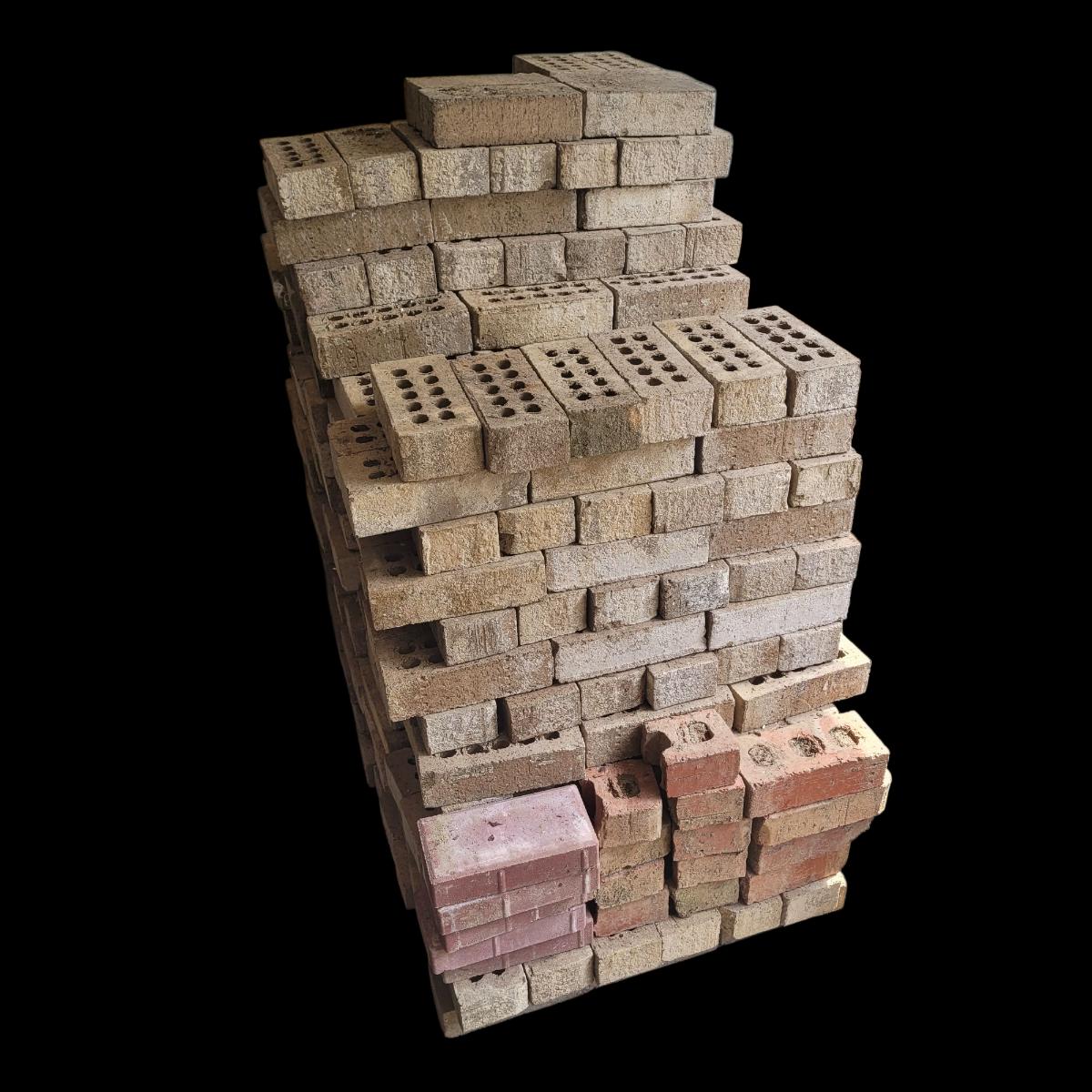 This lot includes a variety of bricks. The bricks were not counted but with a little quick math, we are approximating around 300 bricks. There are perforated, non perforated, red, tan, whole and half bricks. They appear to be mostly perforated tan bricks.