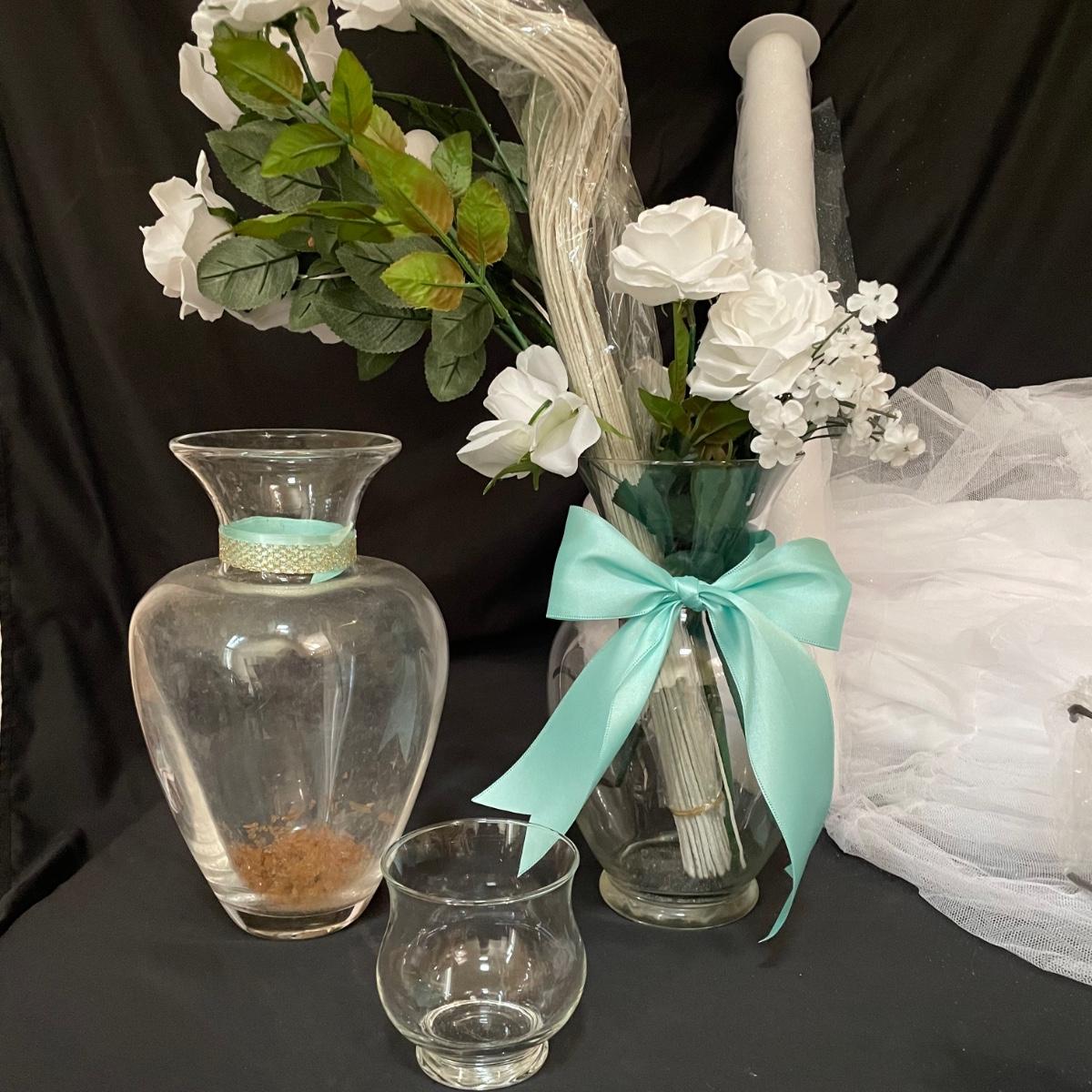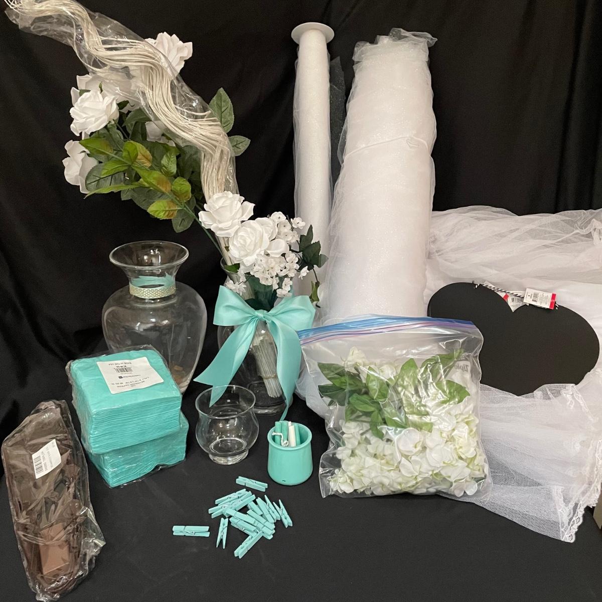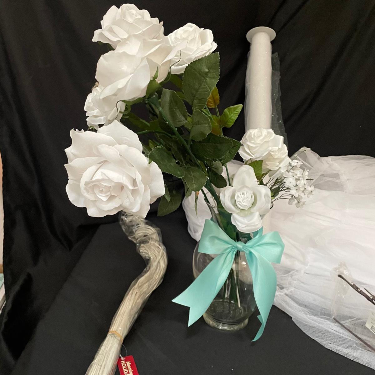A great assortment of vases, faux flowers and other decor items, perfect for an upcoming wedding or party. Lot includes 2 rolls of glittery taffeta like material and 2 ruffled crinoline style petticoat skirts with elastic waists.The battery operated brown lights are new in packaging and were not tested.