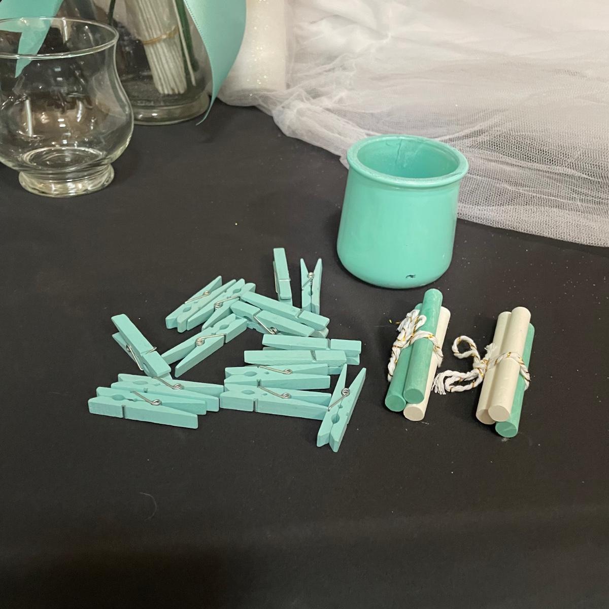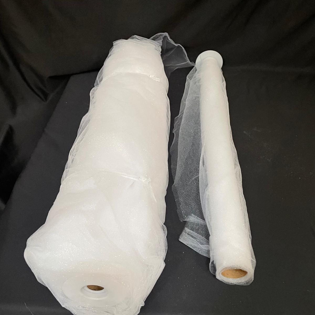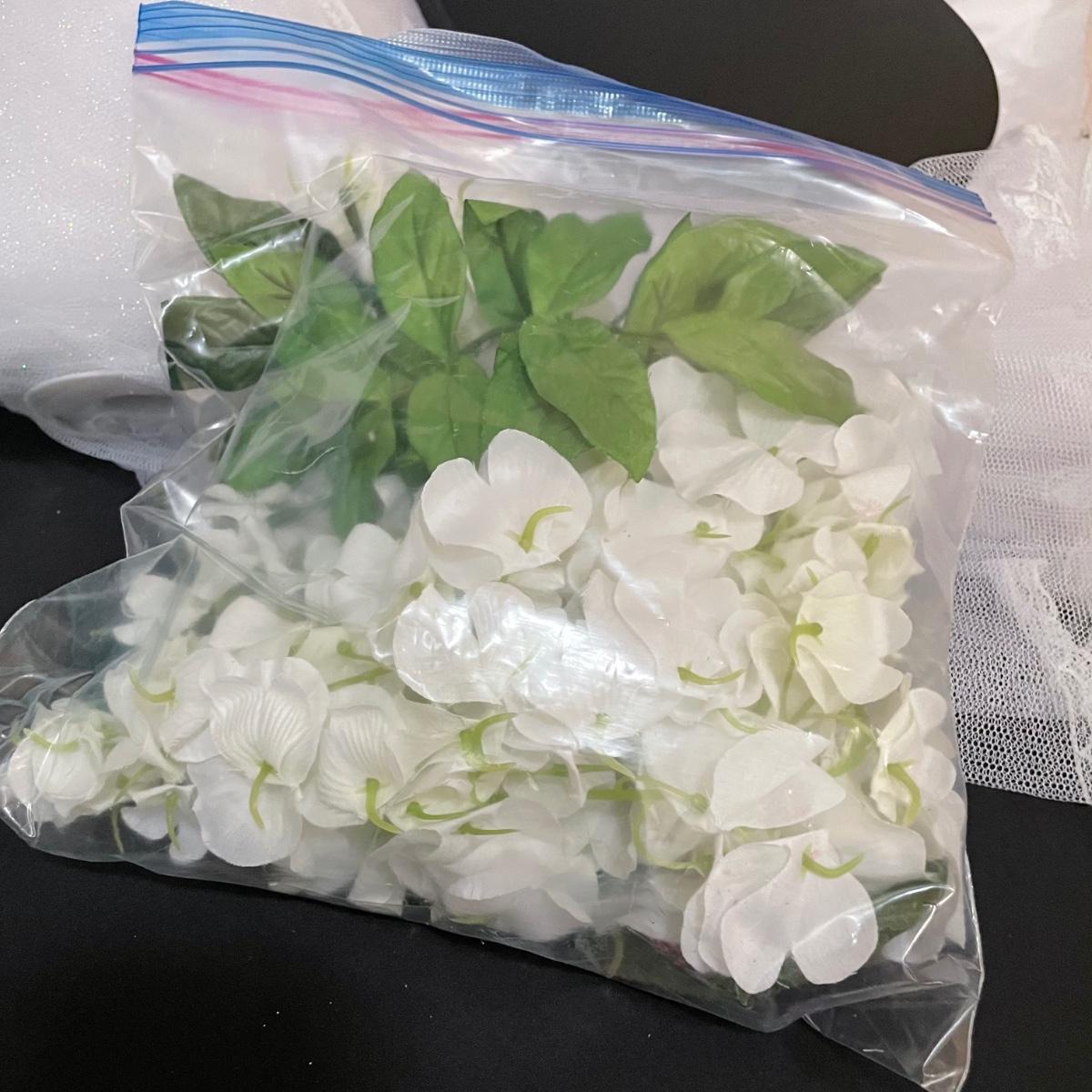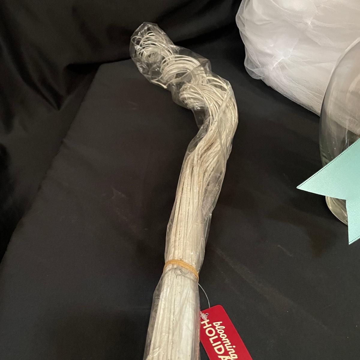 A great assortment of vases, faux flowers and other decor items, perfect for an upcoming wedding or party. Lot includes 2 rolls of glittery taffeta like material and 2 ruffled crinoline style petticoat skirts with elastic waists.The battery operated brown lights are new in packaging and were not tested.