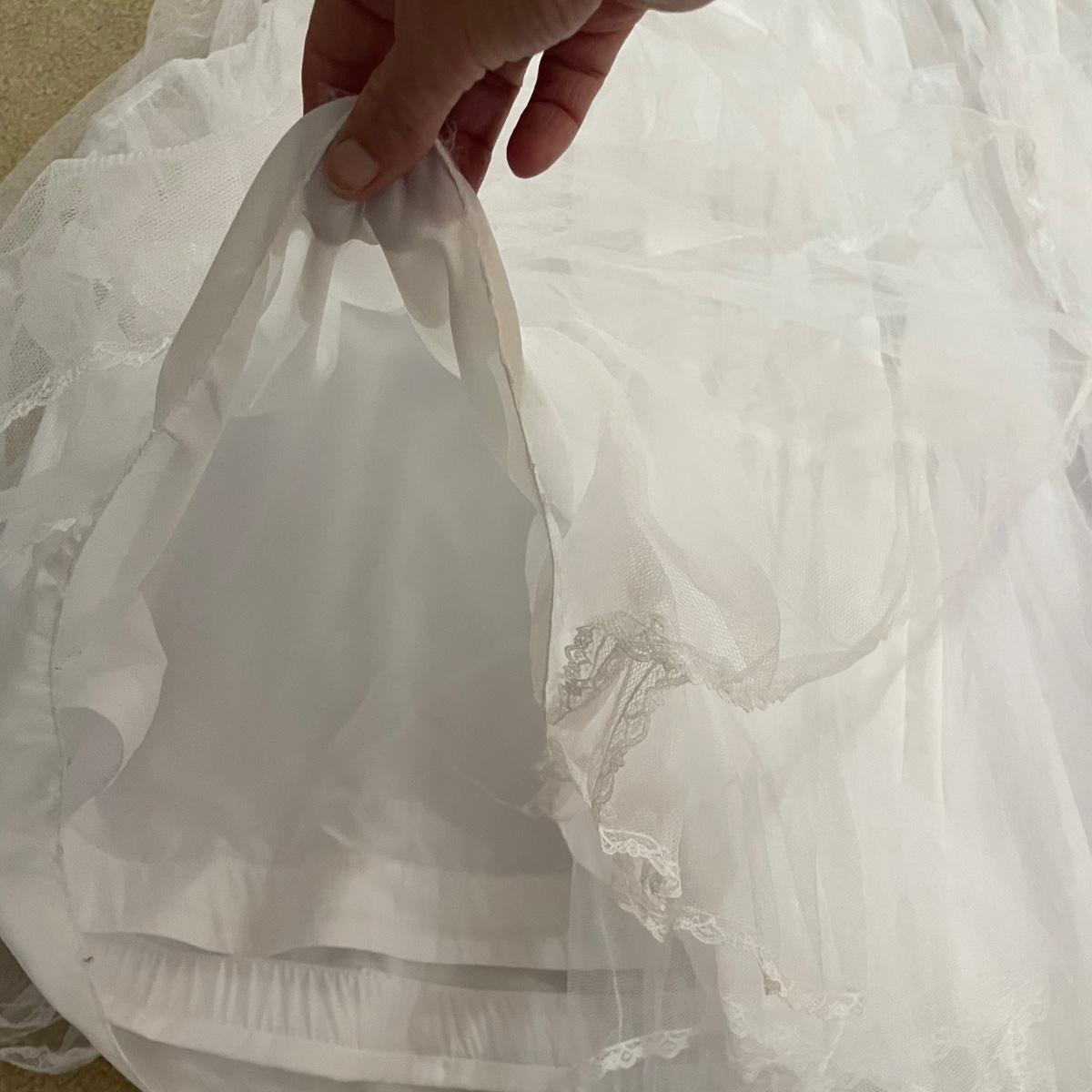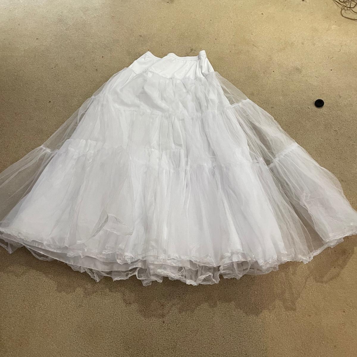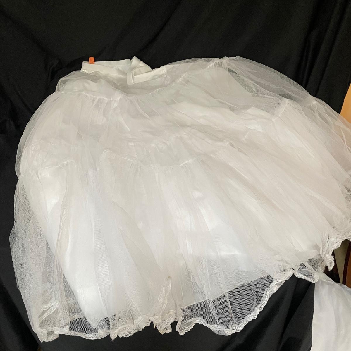 Fullest of the 2 crinoline skirts measures approximately 43” long (including the elasticated waist section) x 73” wide.