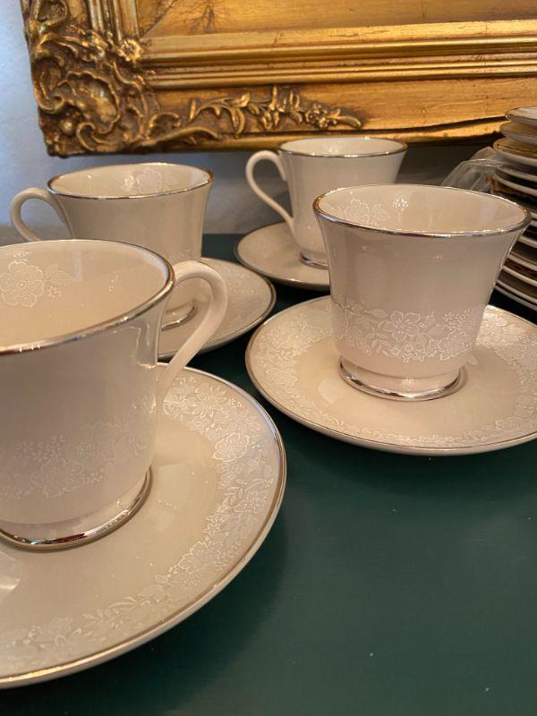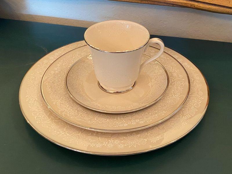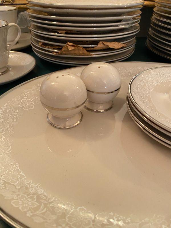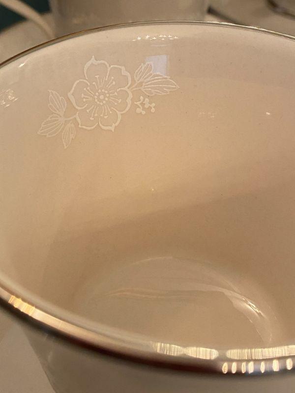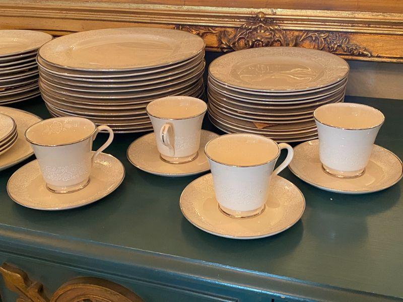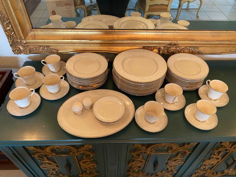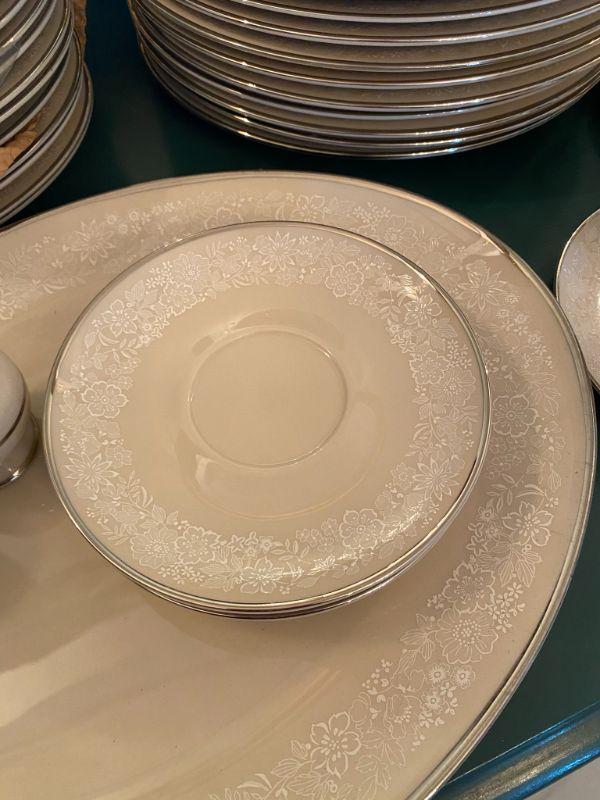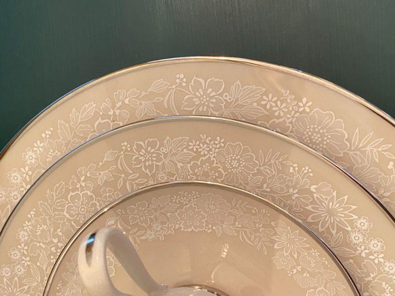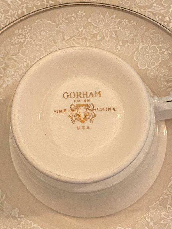 Beautiful Gorham china in Bridal Bouquet. Light almond beige with a white floral pattern, platinum edge. Included in this set is as follows: 13 Dinner Plates 24 Salad/Dessert Plates 8 Cup & Saucer Sets 4 Saucers 1 Oval Serving Plate Salt & Pepper Shaker Set All in good condition, stunning set of dishes.