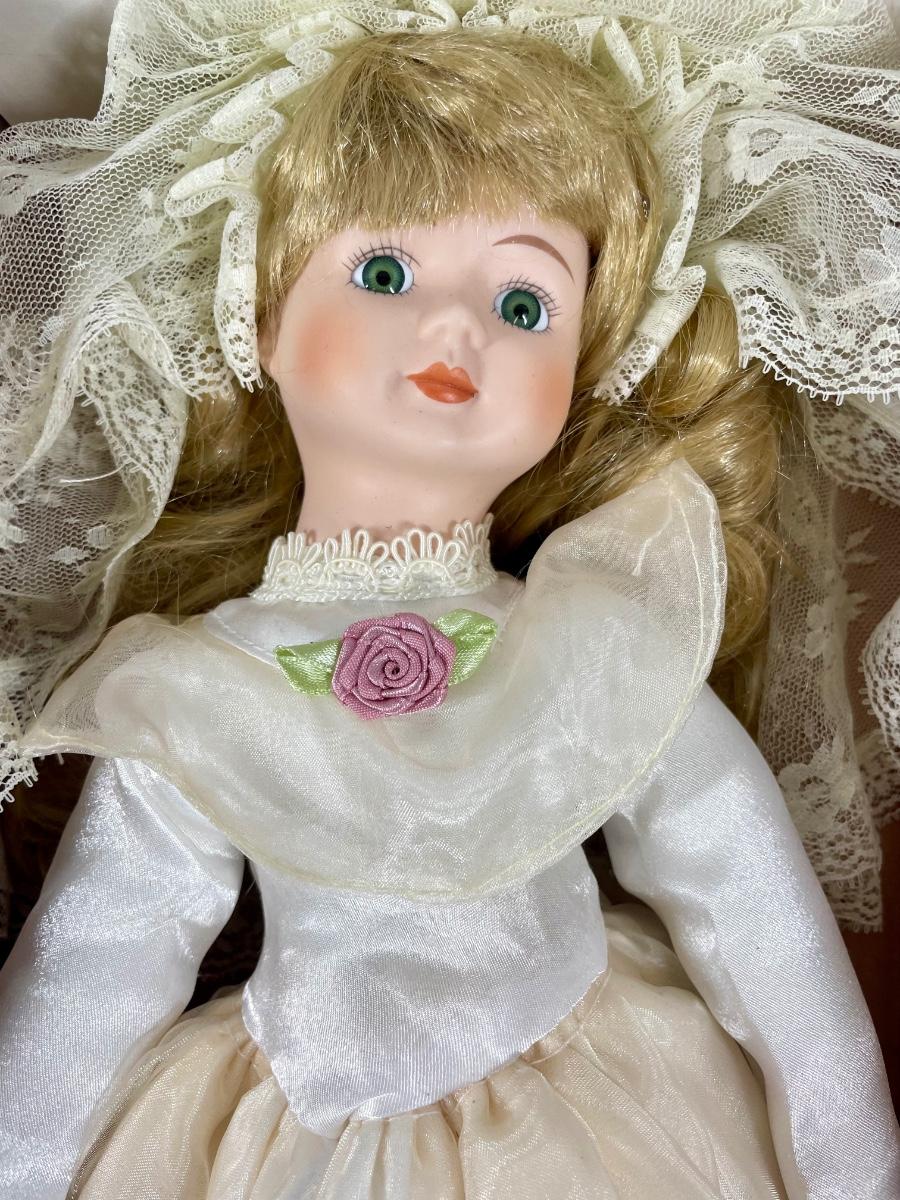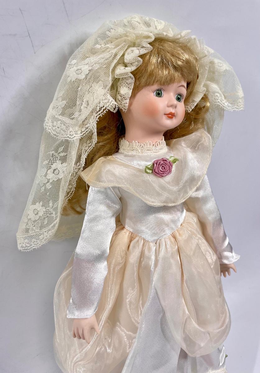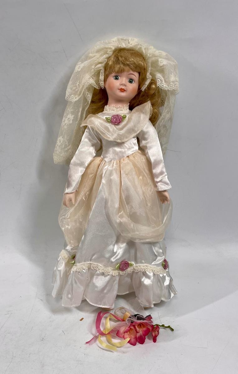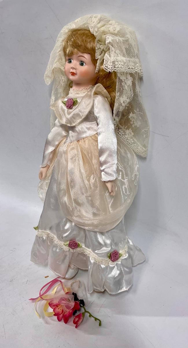 Blonde hair, wedding gown, veil and flowers. With original description sheet.
