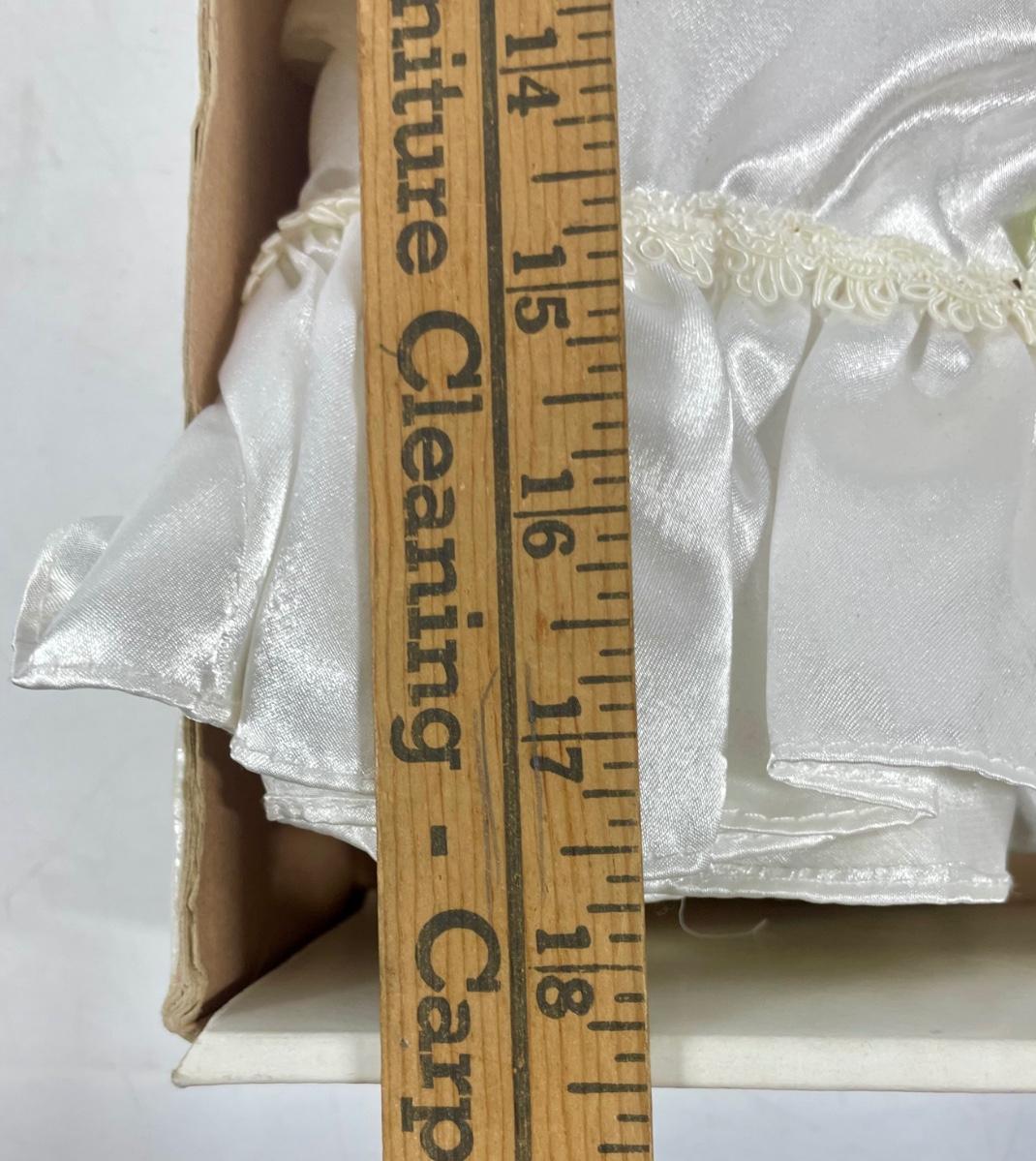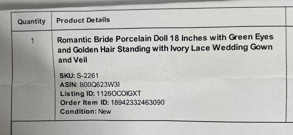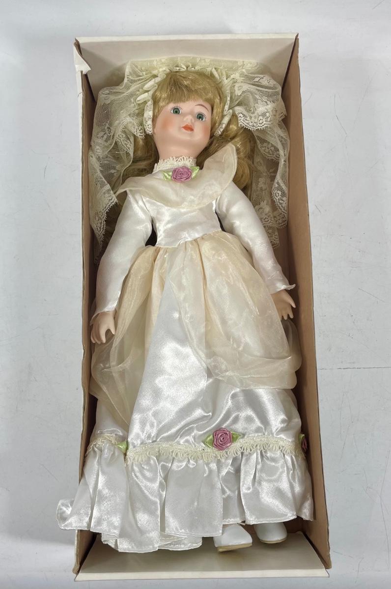 Blonde hair, wedding gown, veil and flowers. With original description sheet.