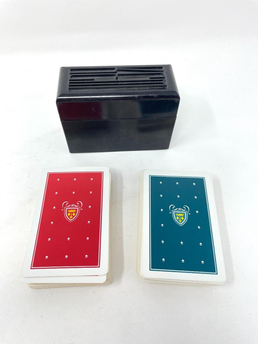 The tablecloth does has some stains but no holes found. Each set of playing cards has 52 cards.