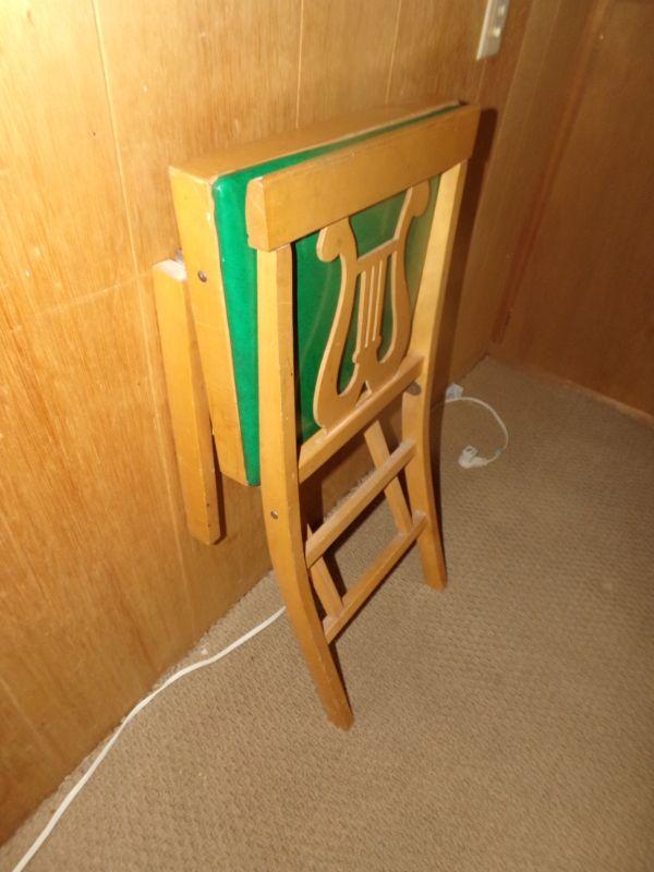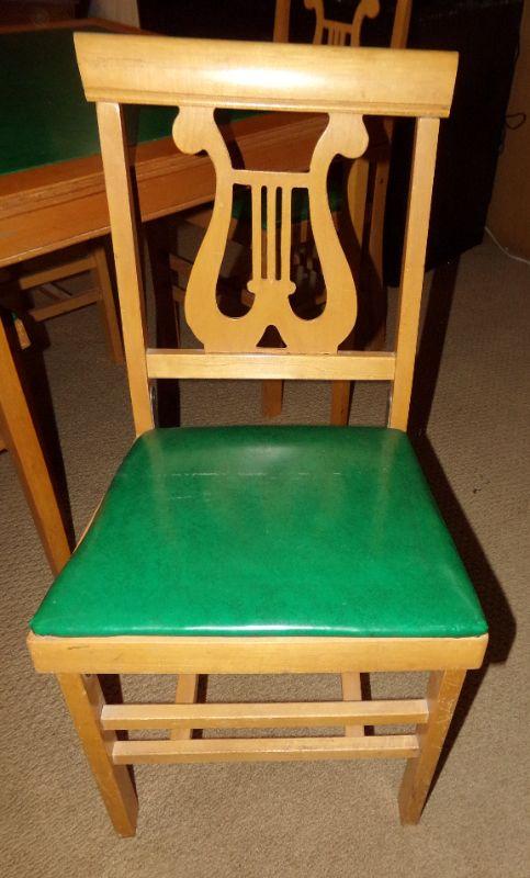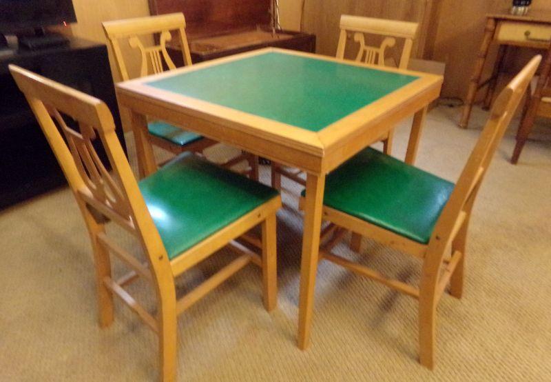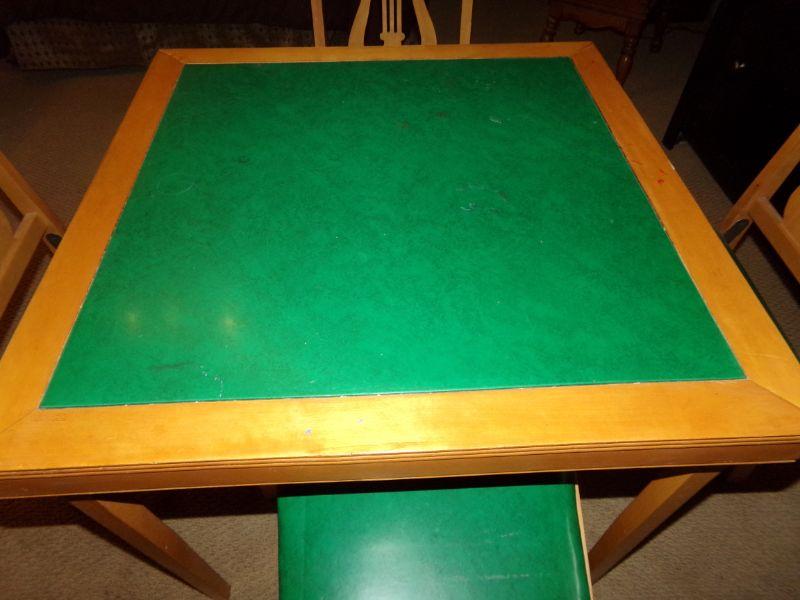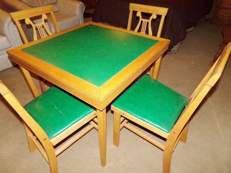 GOOD CONDITION! THE CHAIRS SHIFT A LITTLE WHEN SITTING AND THE TABLE HAS SOME SMALL STAINS THAT CAN PROBABLY BE REMOVED WITH THE RIGHT CLEANER. THE GREEN MATERIAL ON CHAIRS AND TABLE IS A VINYL.
