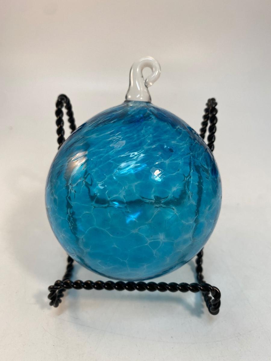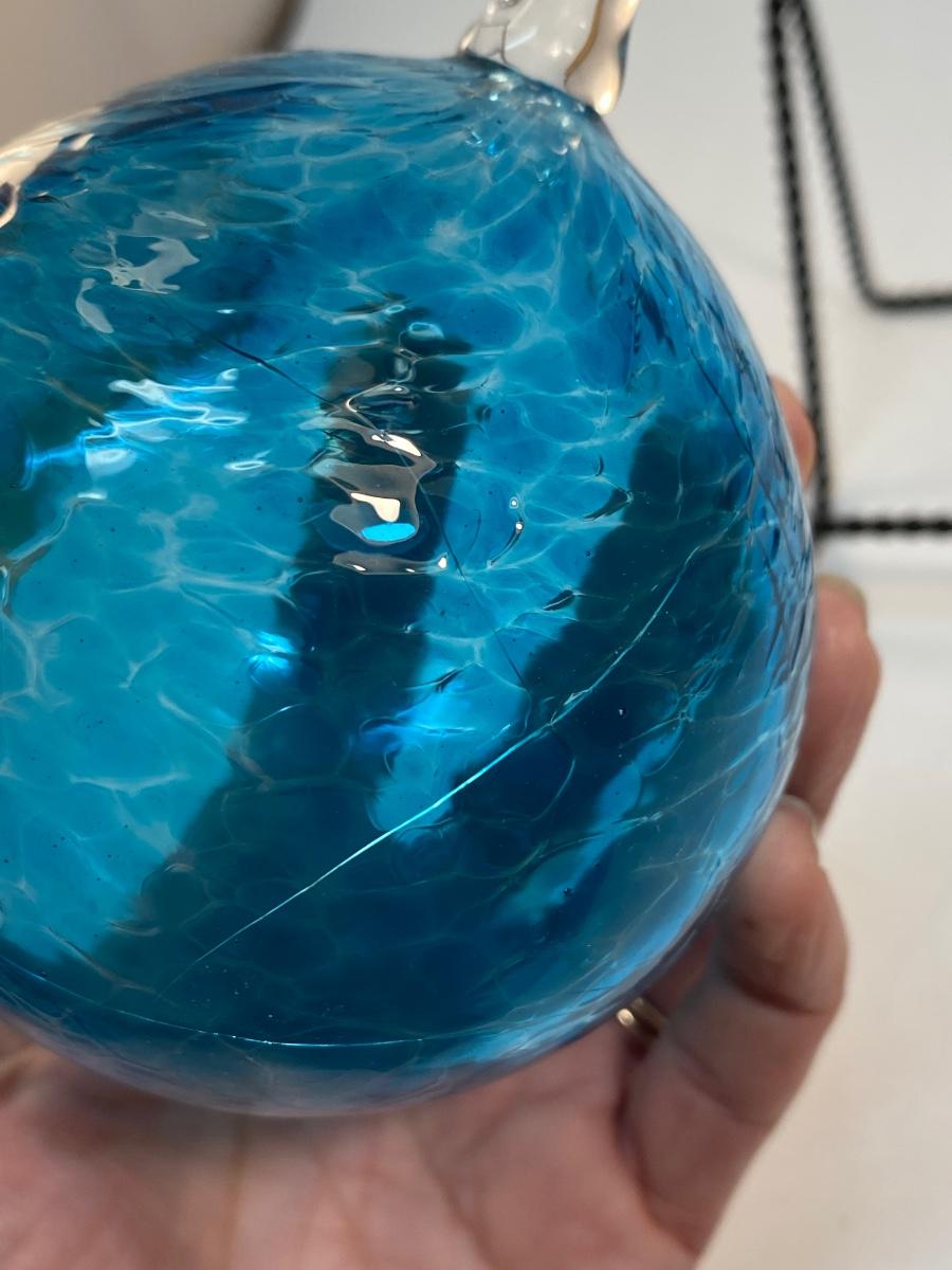 Bright Blue Hand Made Blown Glass Hanging Ornament Orb Suncatcher. There is damage/cracking to this ornament. About 3" size. See photos for damage, cracking goes almost all the way around in different directions. Still displayable.