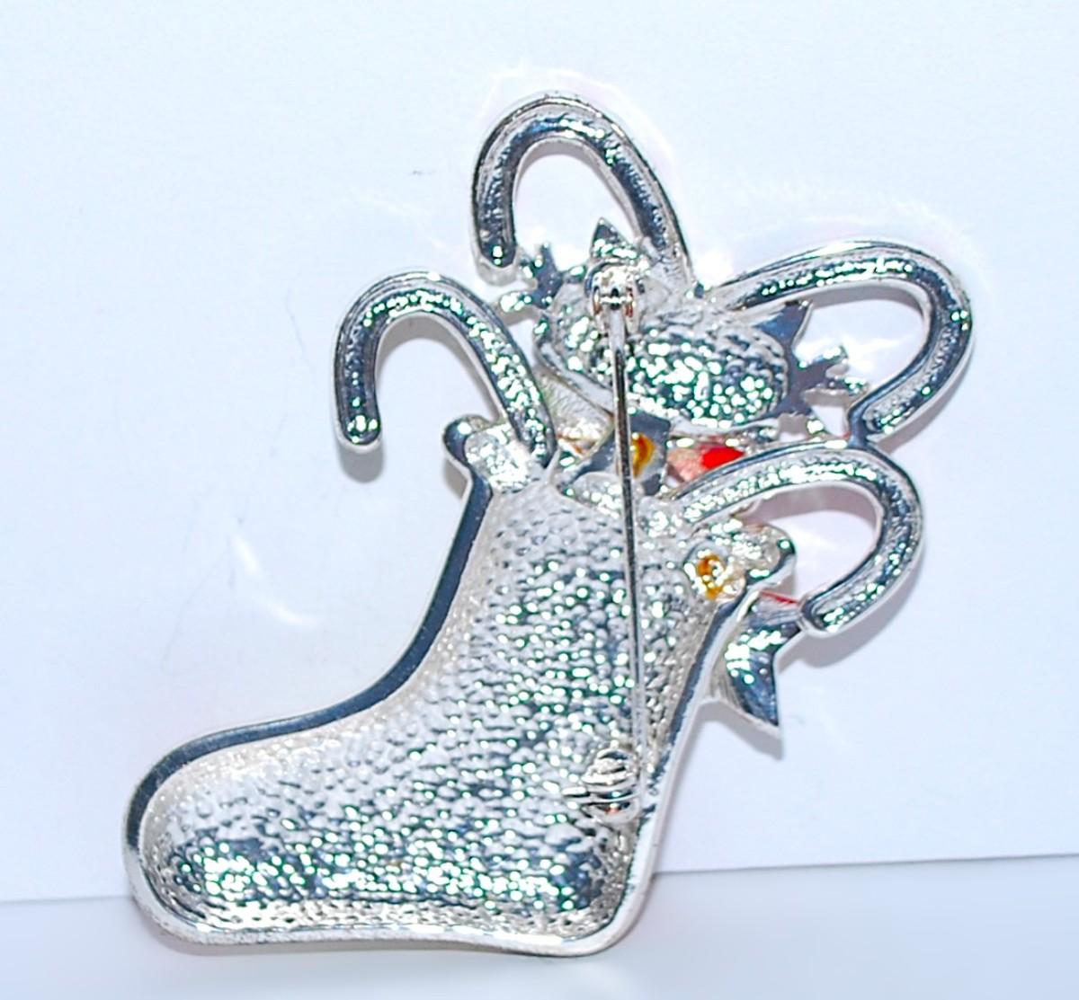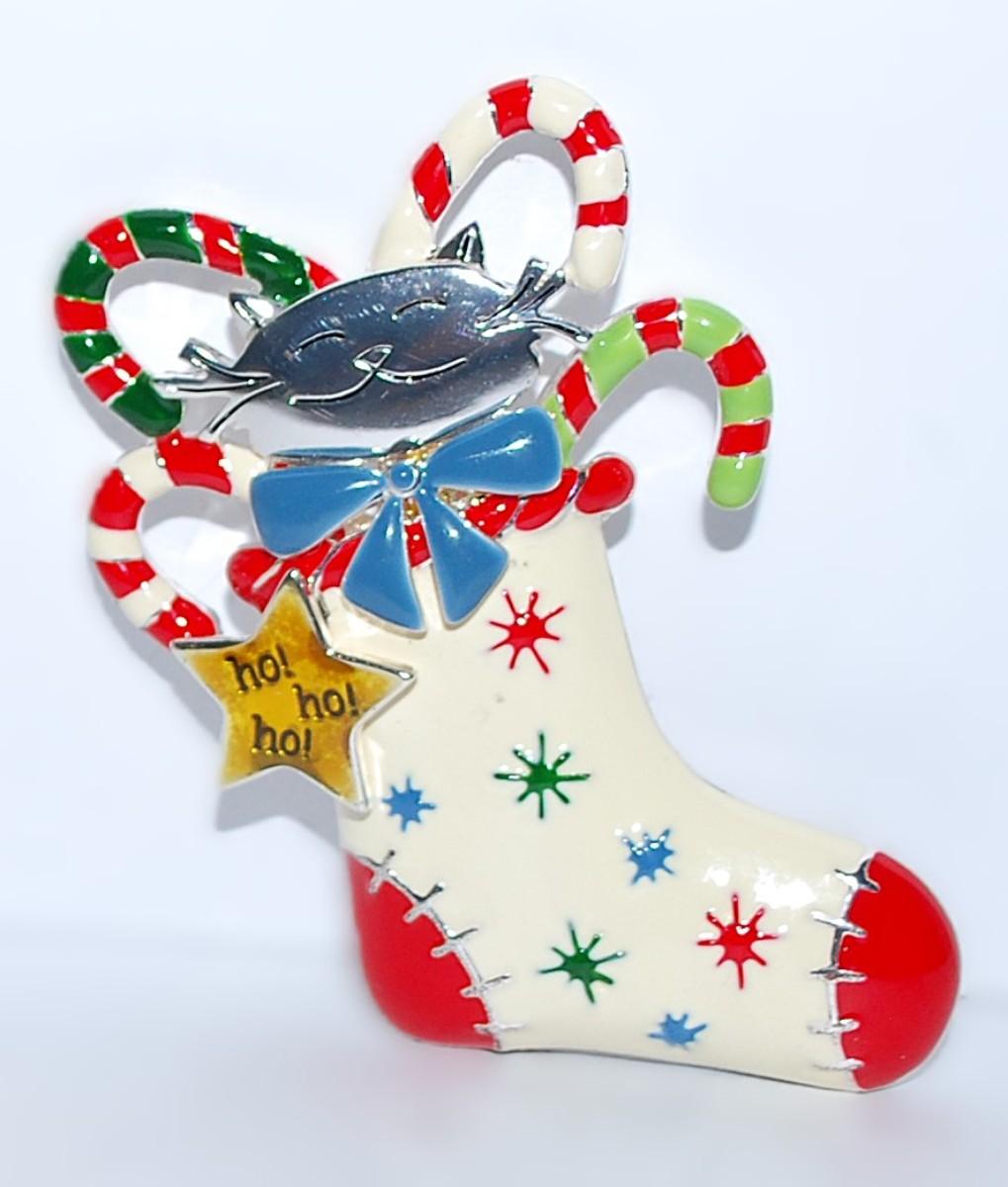 Bright Color Candy Canes HOLIDAY STOCKING BROOCH (2¾" x 1¾") with Silver Cat Face & Blue Ribbon on a Silver Tone Setting