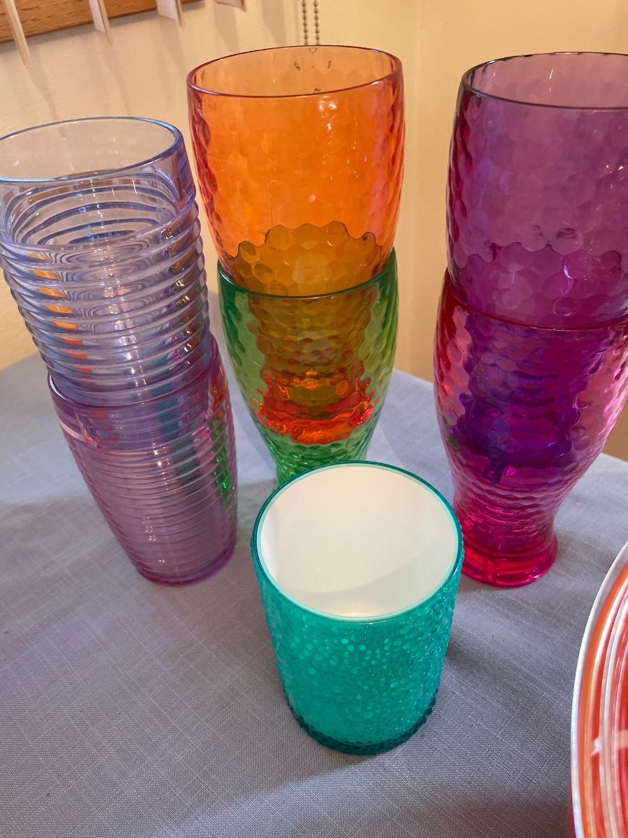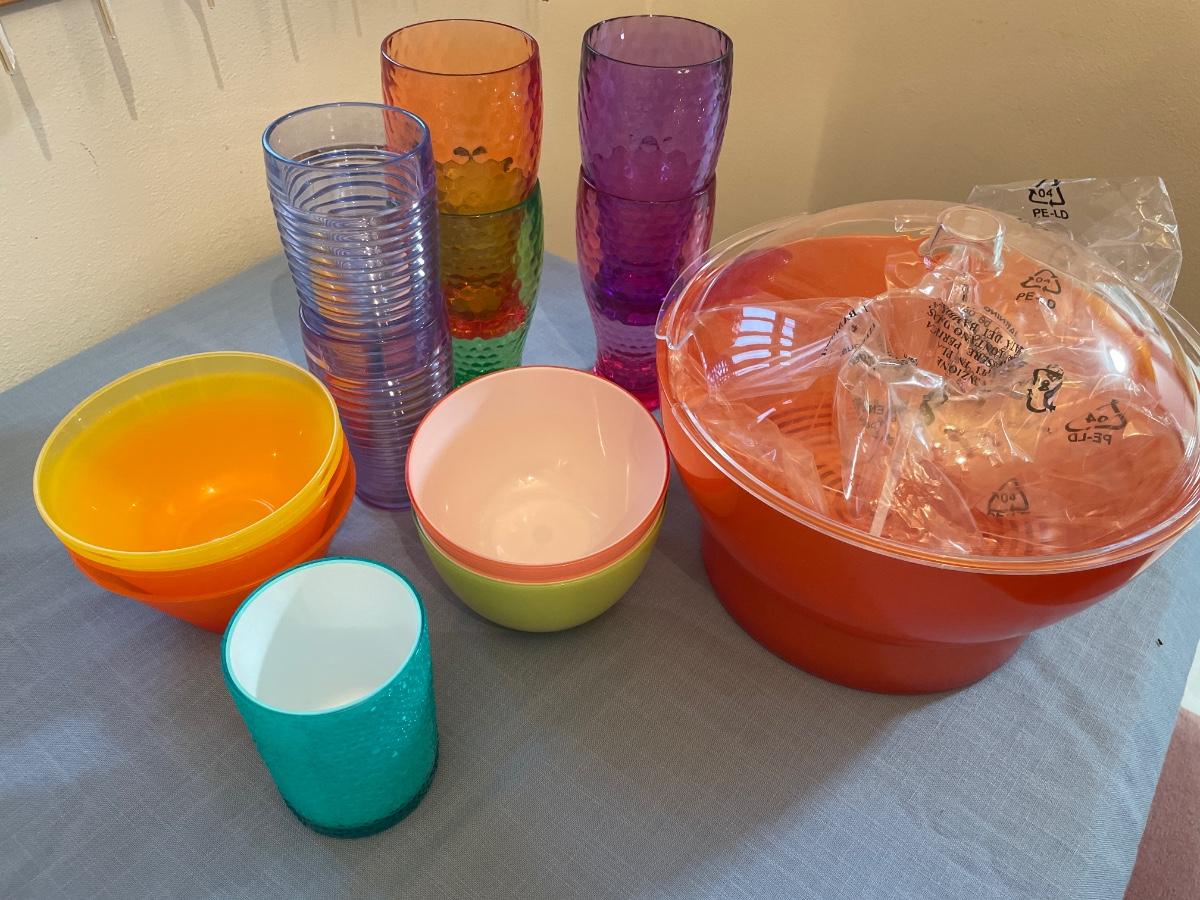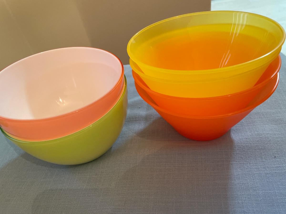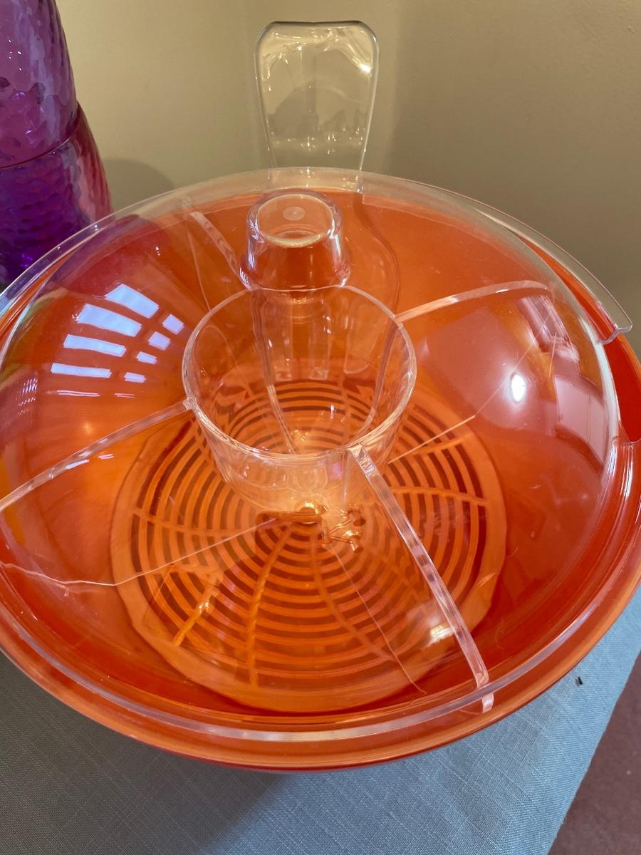 Orange plastic serving bow with sections and large fork maybe missing another fork