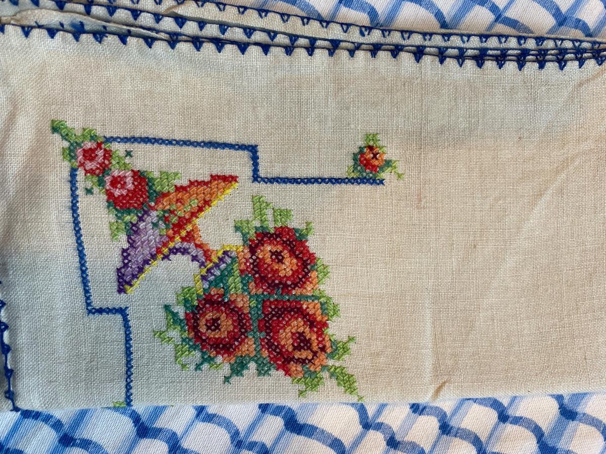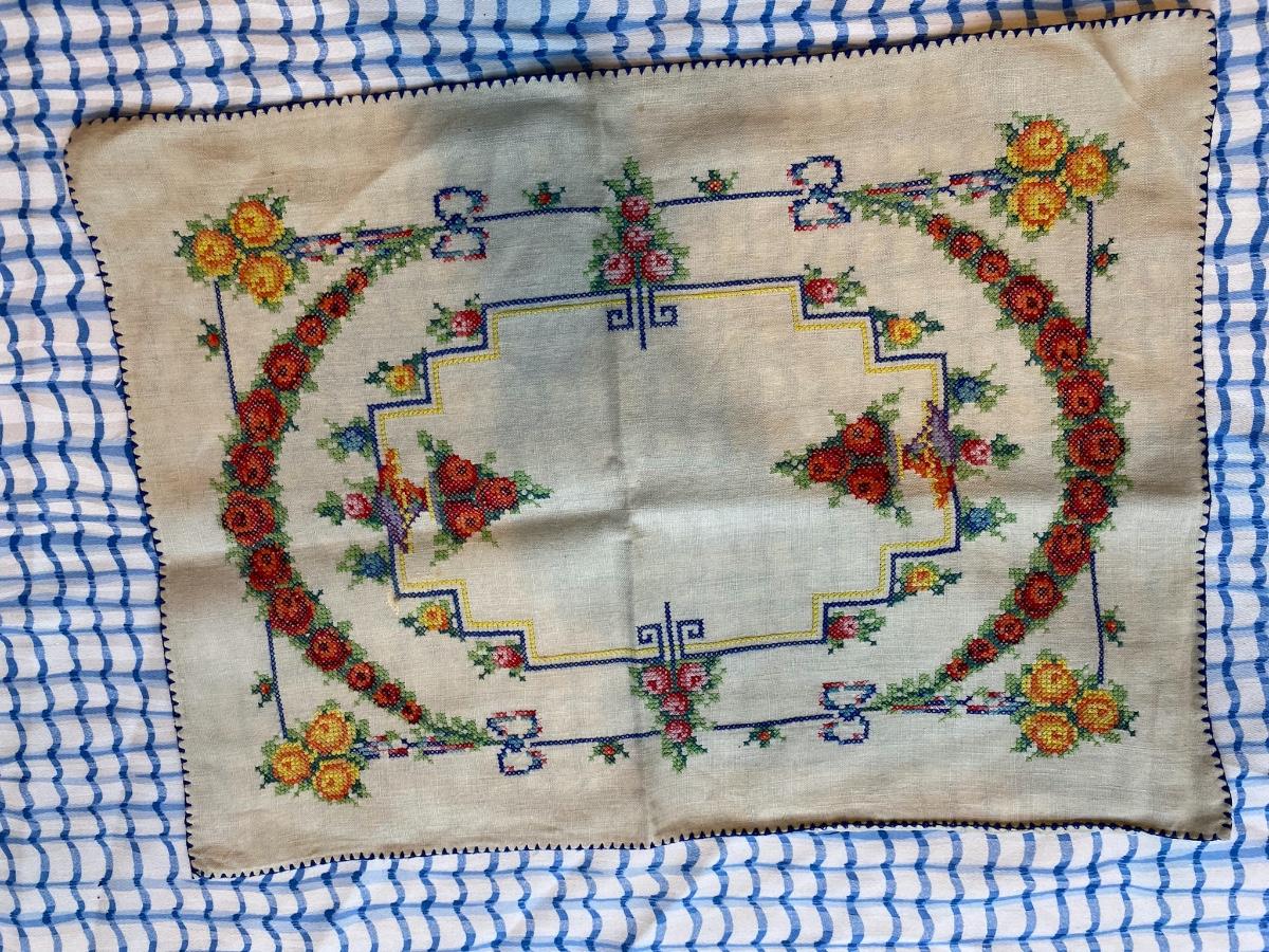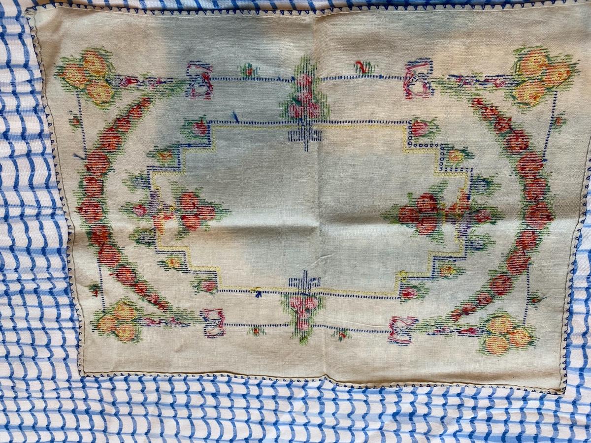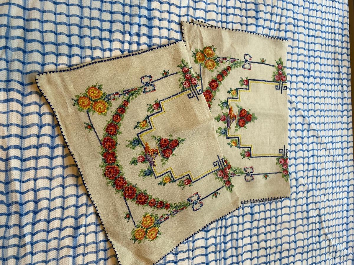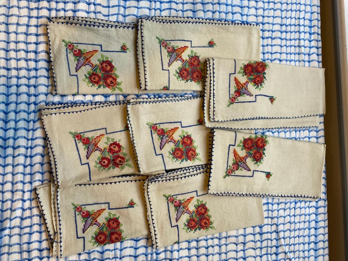 Set of 8 smashingly vivid colorful napkins, all hand stitched including hem boarder. Includes 2 runners/placemats which show amazing cross stitch work. This set will brighten any table with joy. Napkin 17" X 15" , runner 15 1/2" X 11 1/2" Terrific condition.
