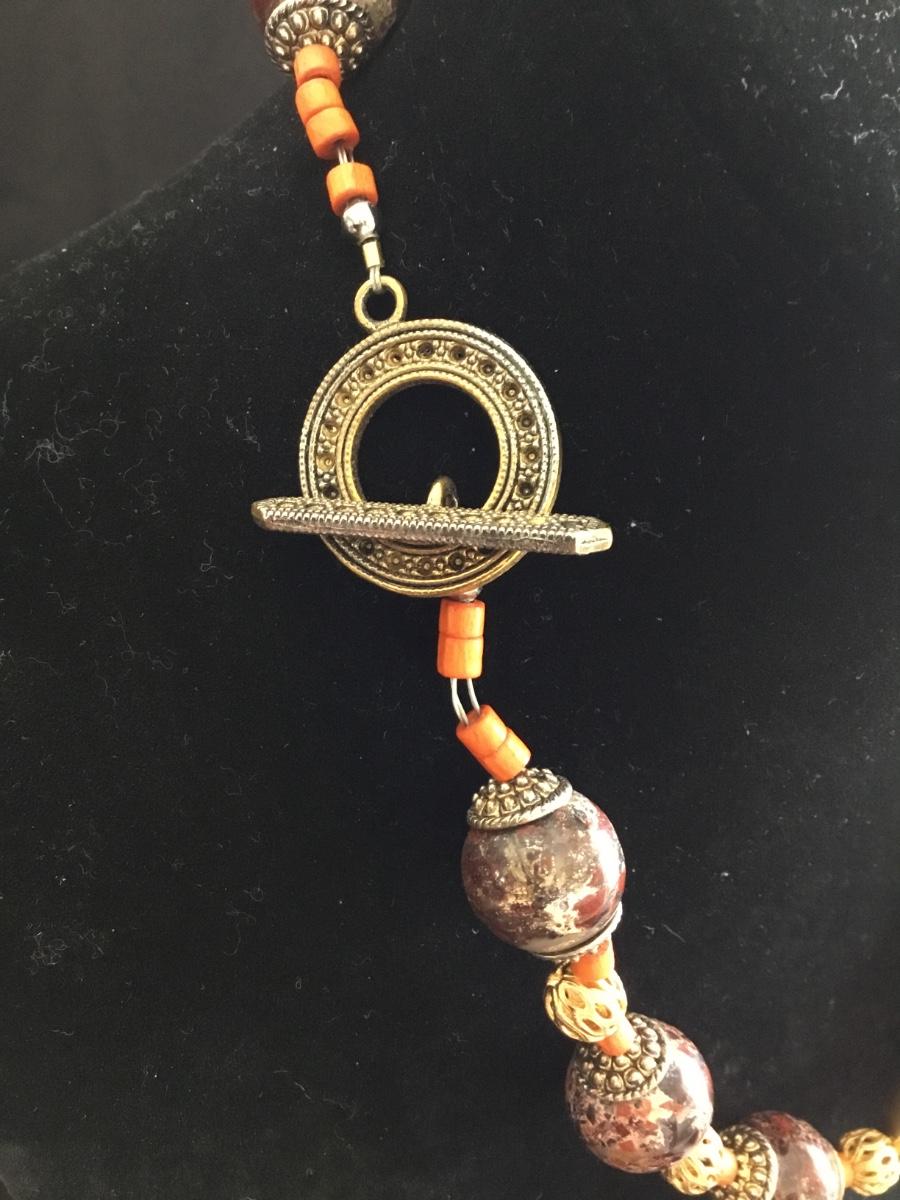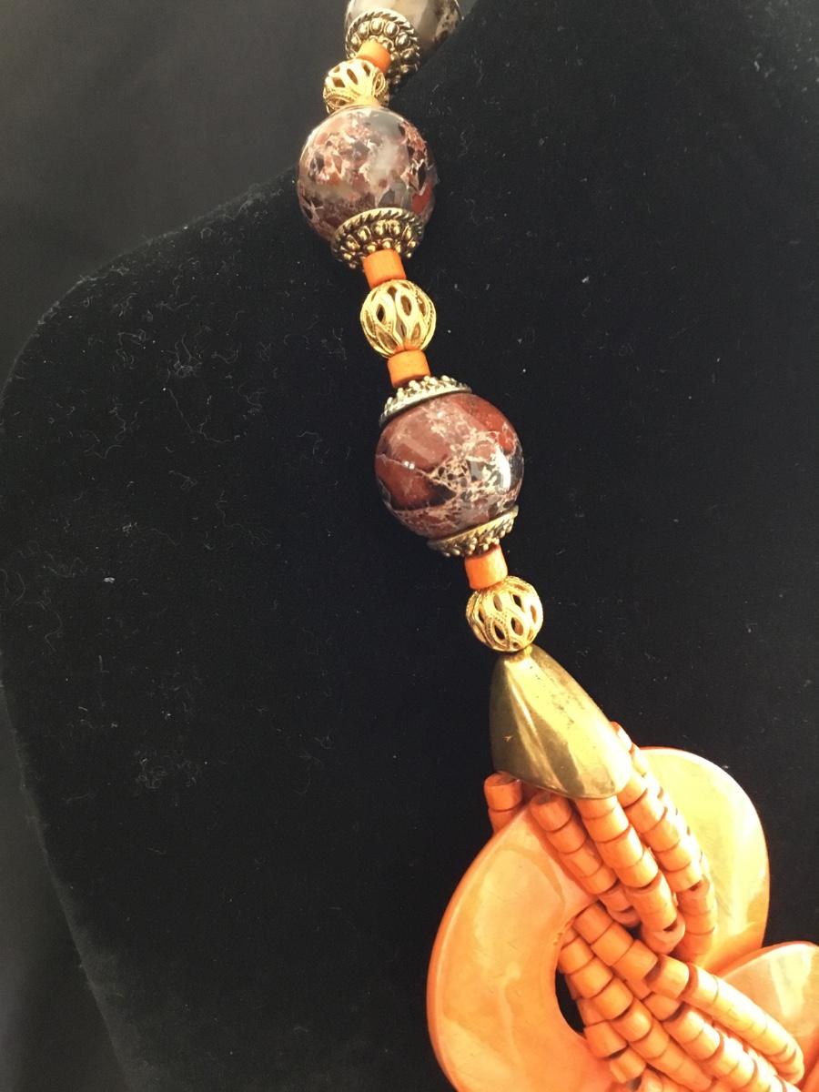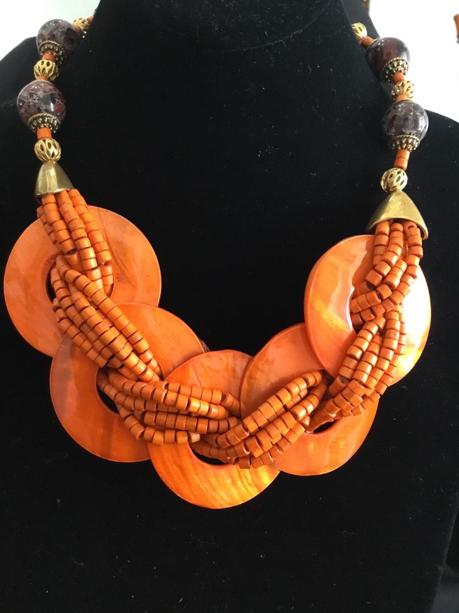 Bright orange, seed beaded, shell type, gold, toned, glass, bead statement, necklace